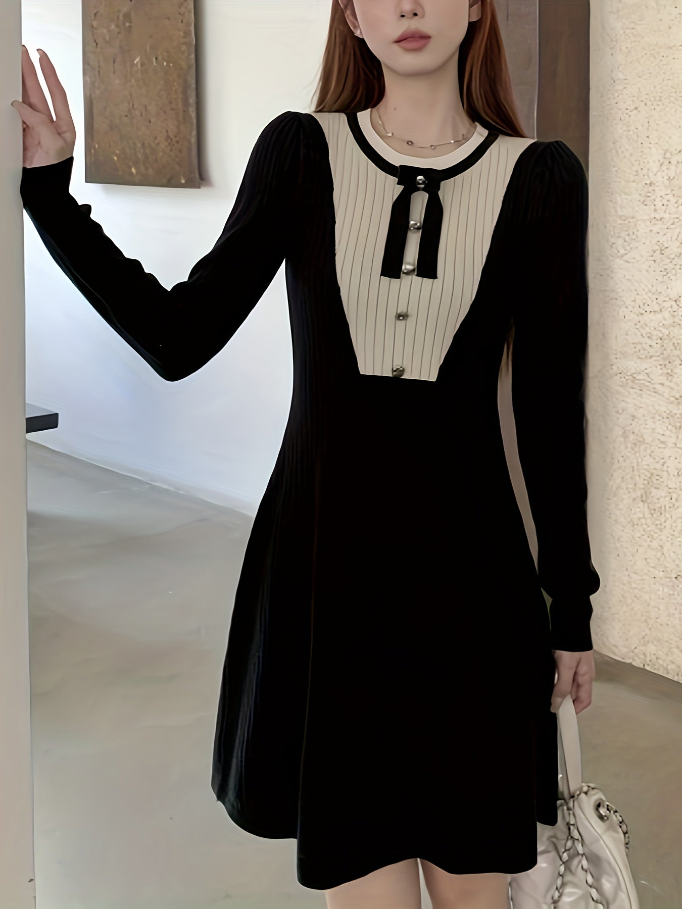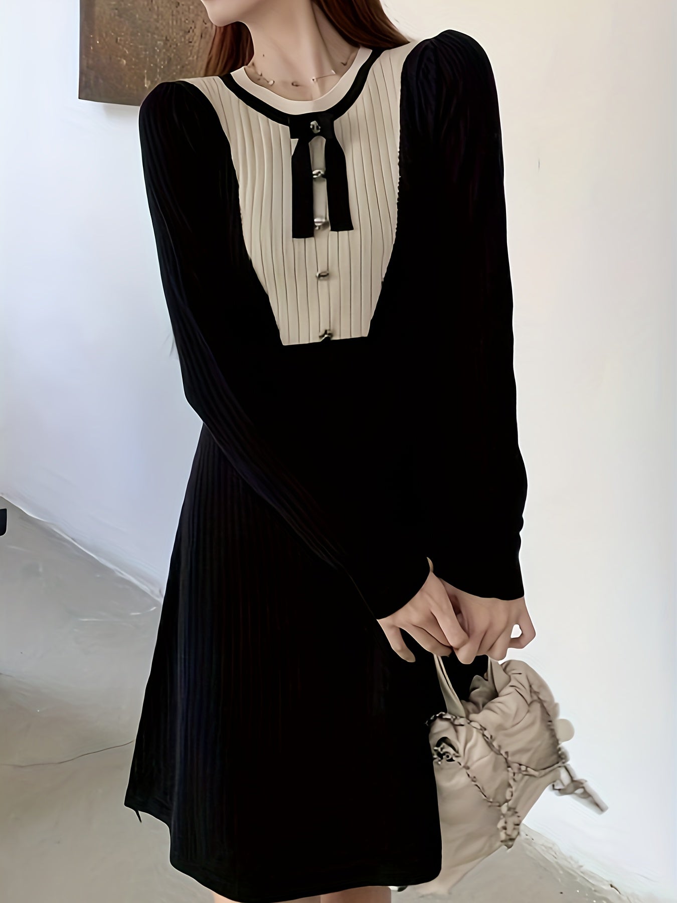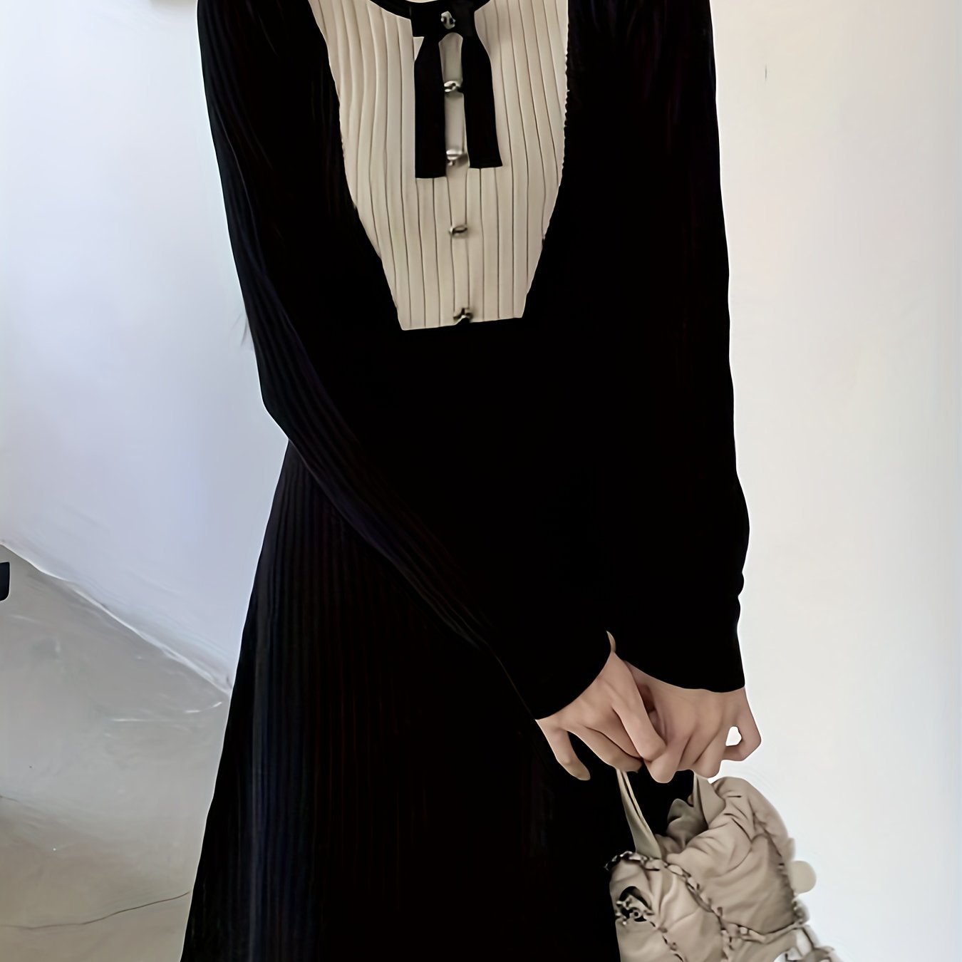 Sixsr Color Block Button Decor Dress, Elegant Long Sleeve A-line Knit Tied Dress, Women's Clothing