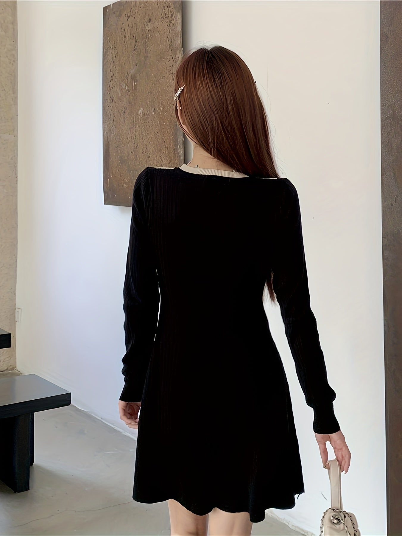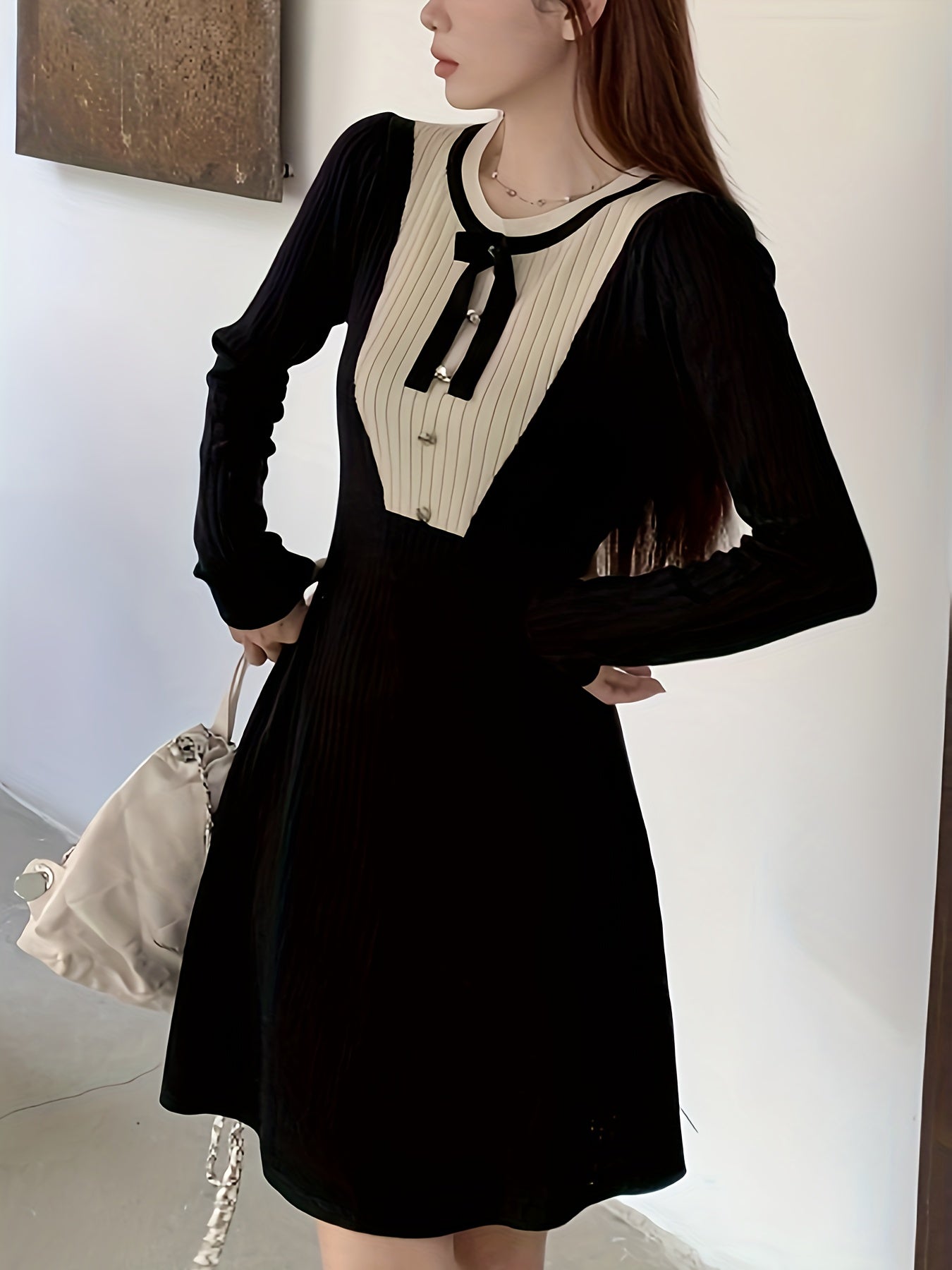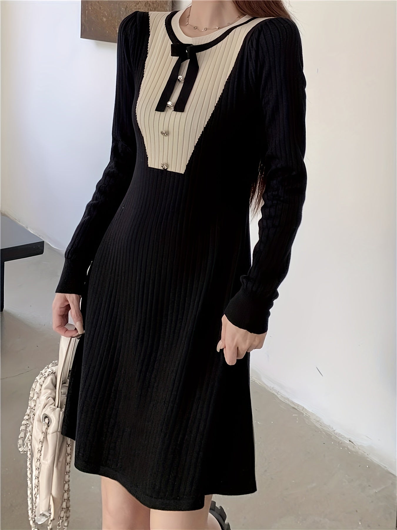 Sixsr Color Block Button Decor Dress, Elegant Long Sleeve A-line Knit Tied Dress, Women's Clothing