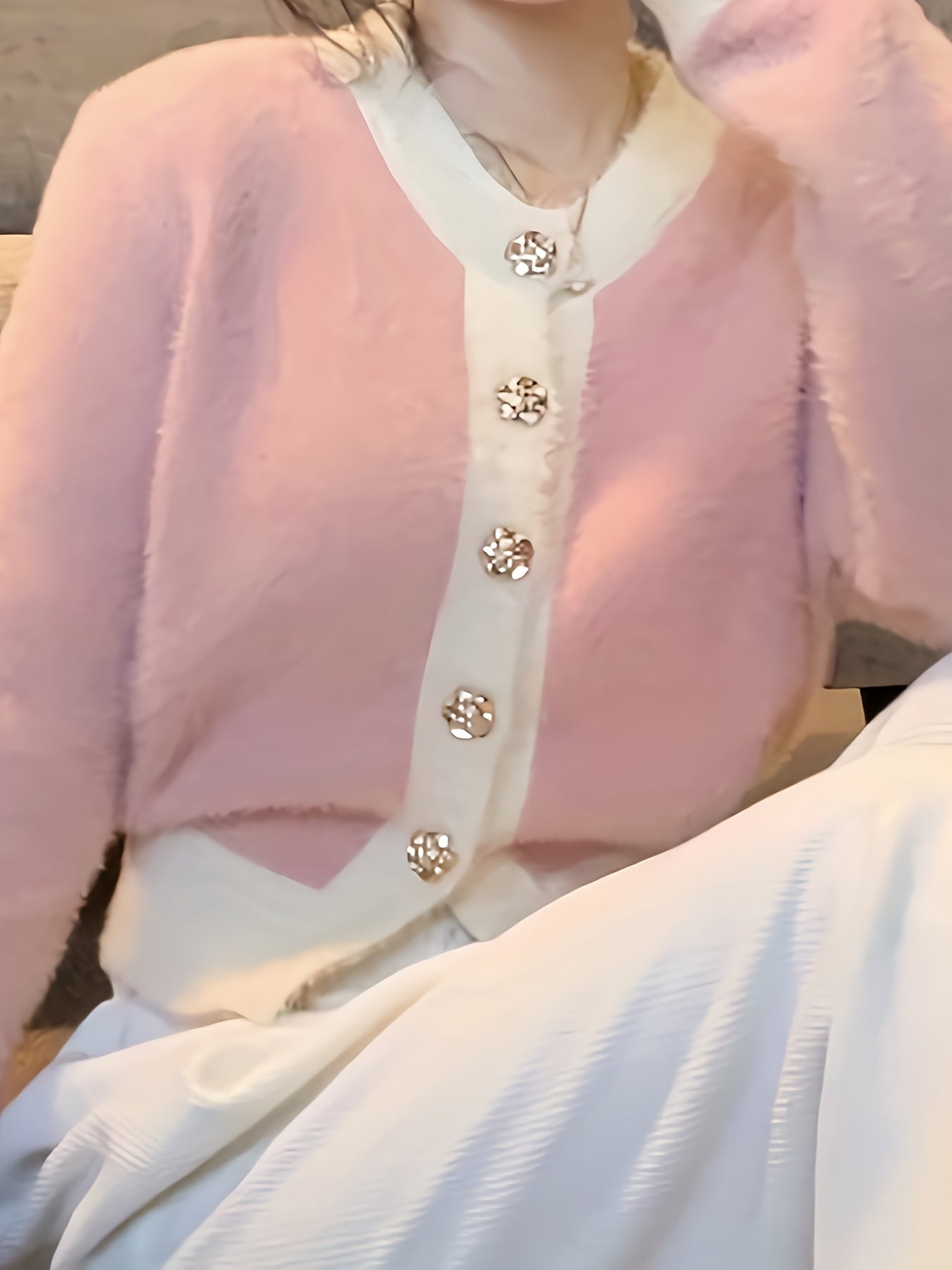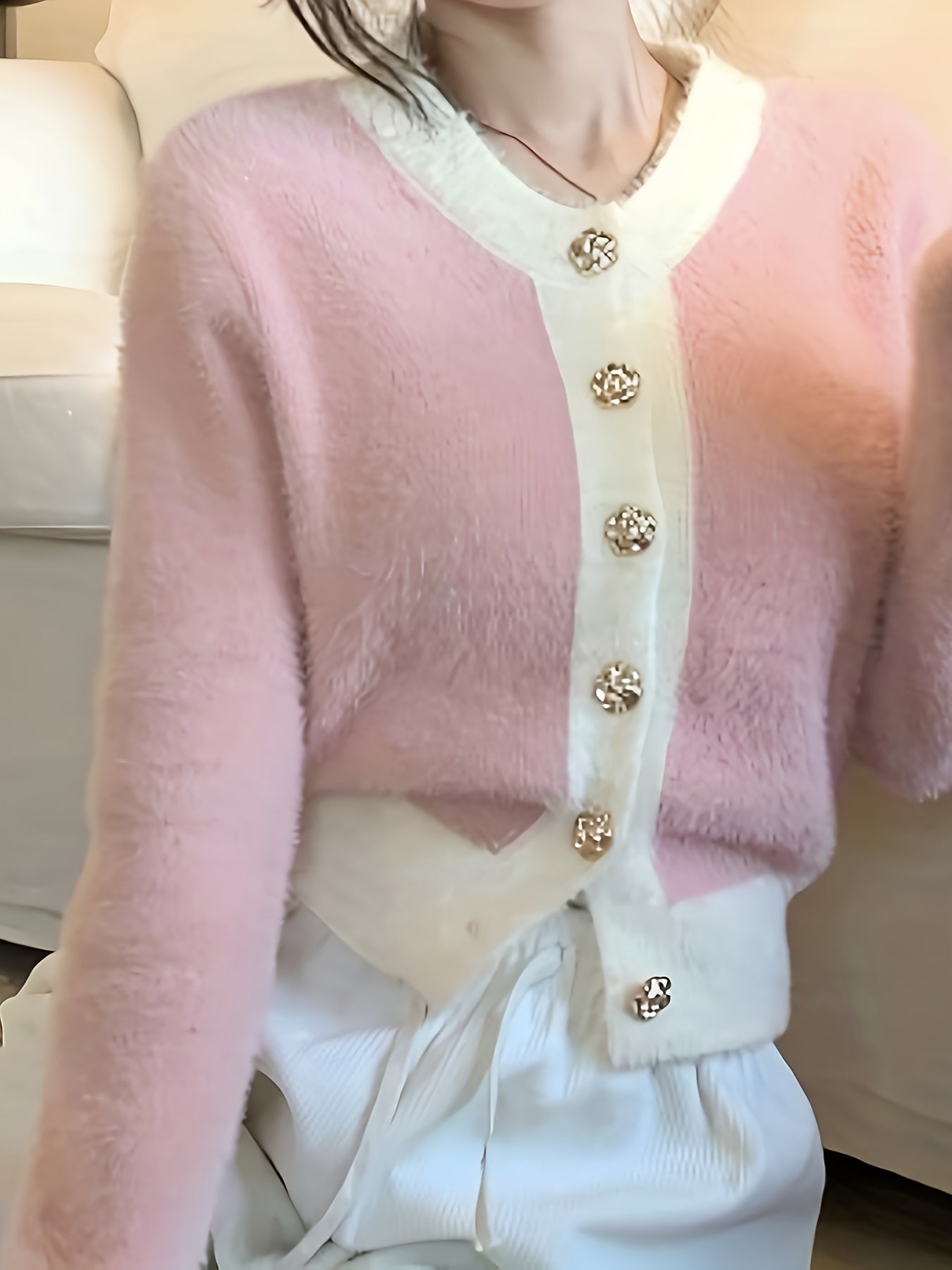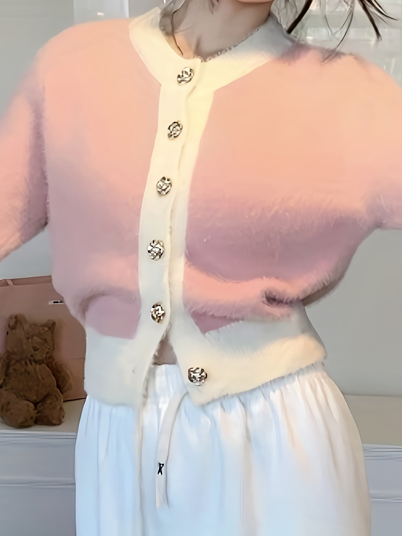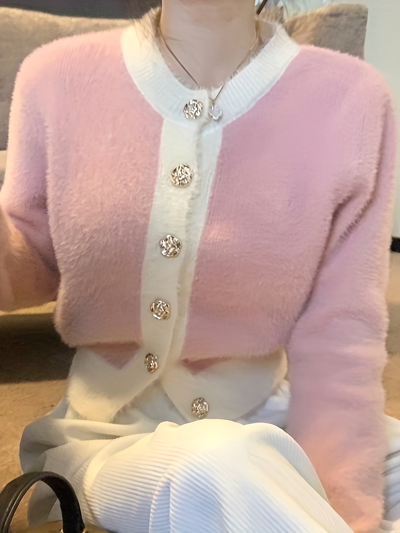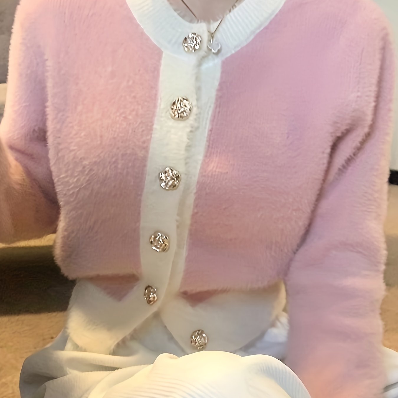 Sixsr Color Block Button Up Knit Cardigan, Casual Long Sleeve Cozy Crop Sweater, Women's Clothing