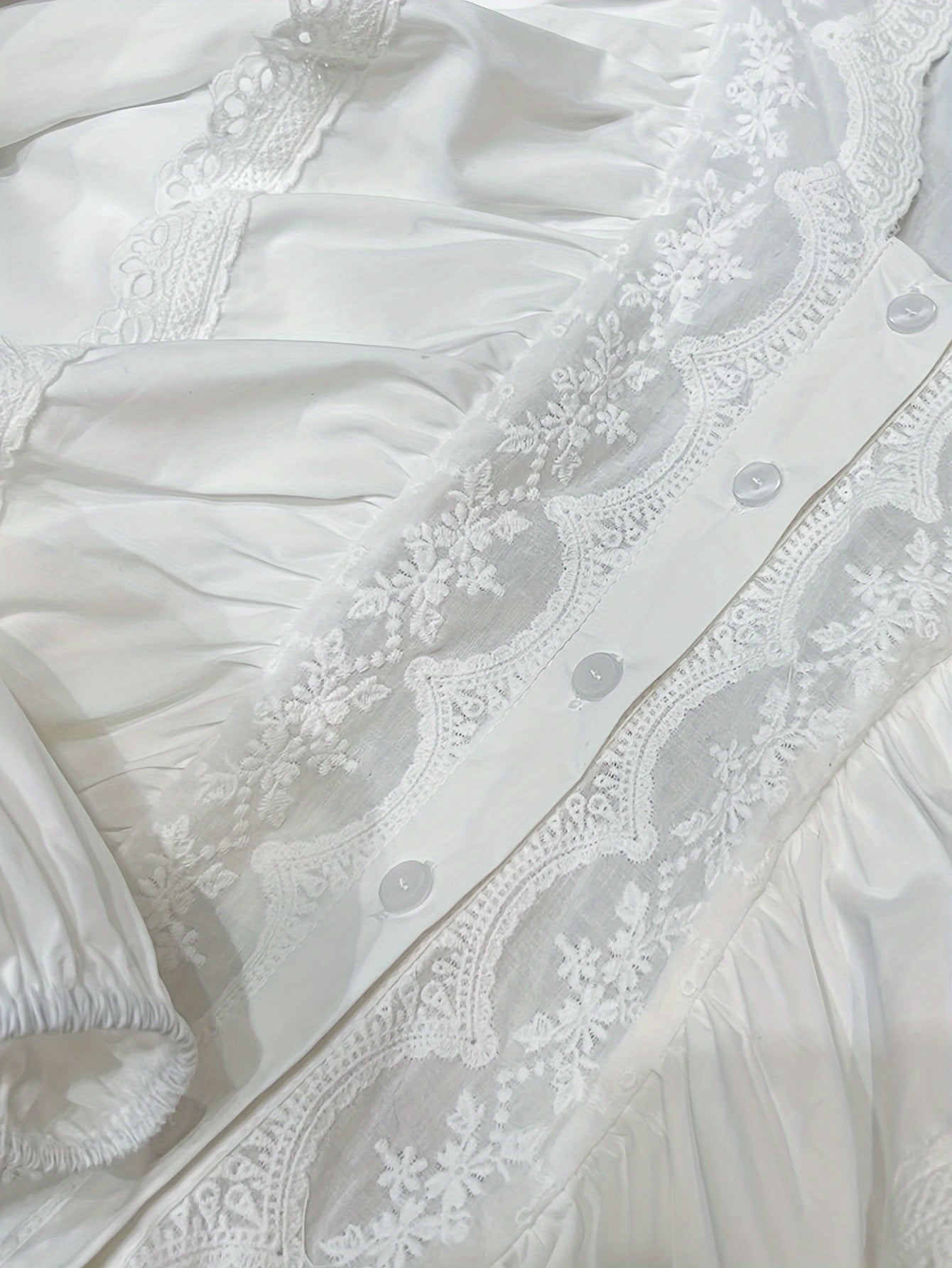 Sixsr Contrast Lace Button Front Blouse, Ruffle Trim Lantern Sleeve Blouse For Spring & Fall, Women's Clothing