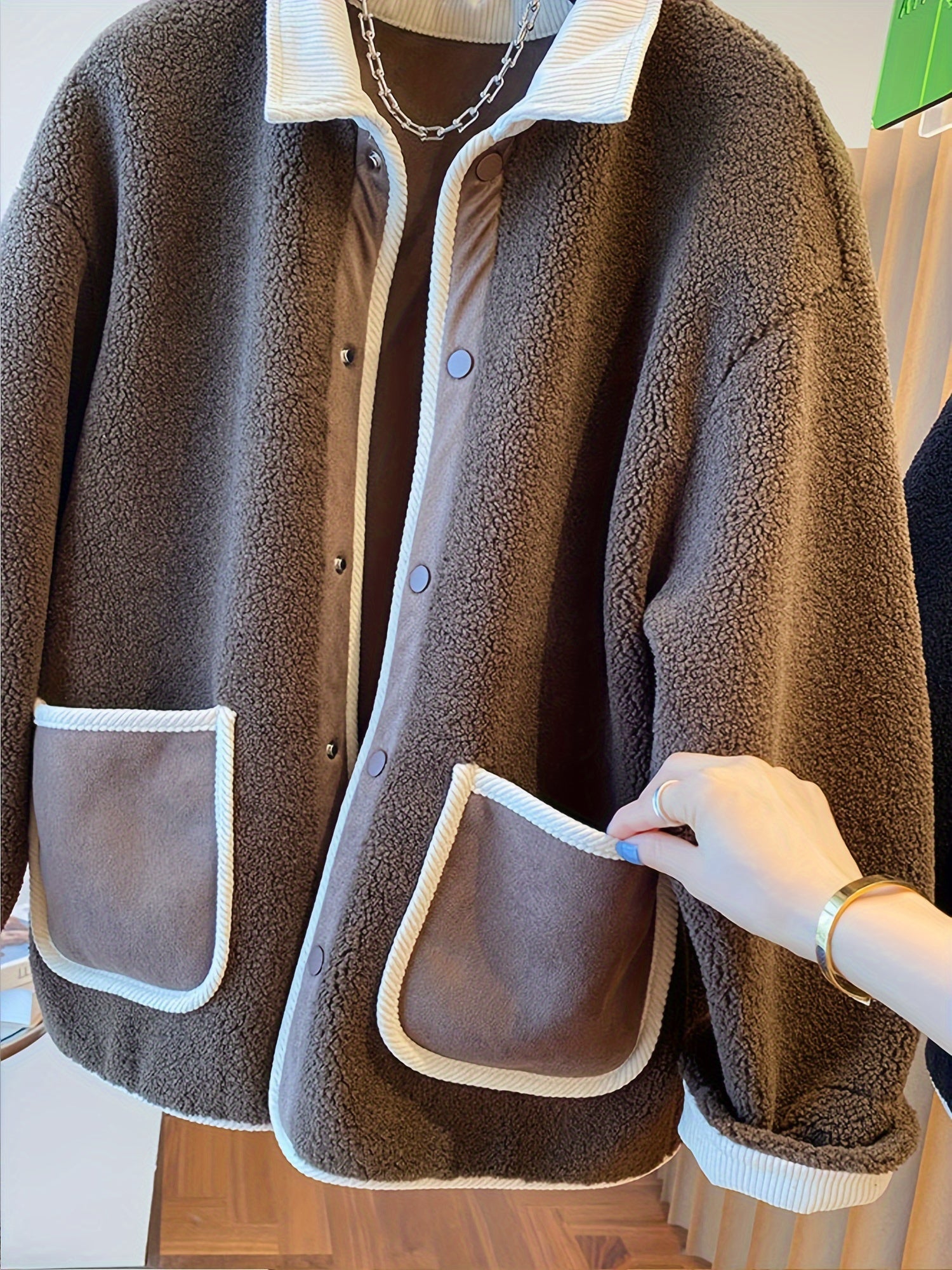 Sixsr Contrast Trim Patched Pockets Outwear, Versatile Long Sleeve Button Front Coat For Fall & Winter, Women's Clothing