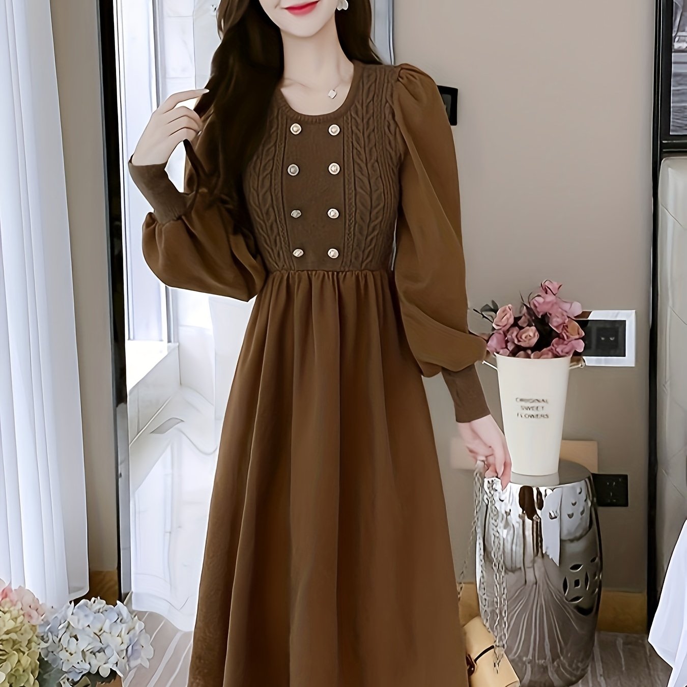 Sixsr Crew Neck Knitted Maxi Dress, Elegant Solid Color Button Long Sleeve Sweater A-line Dress For Fall & Winter, Women's Clothing