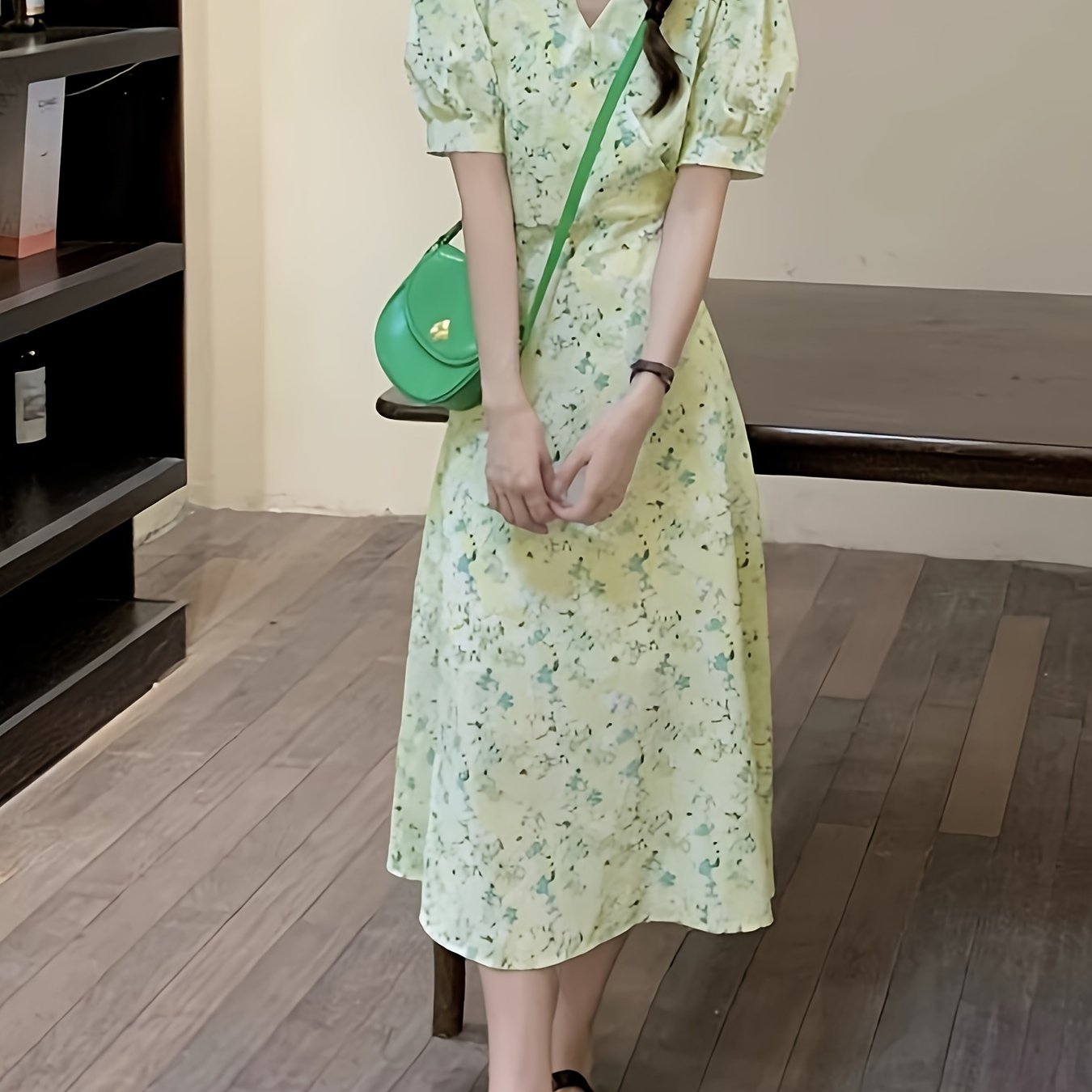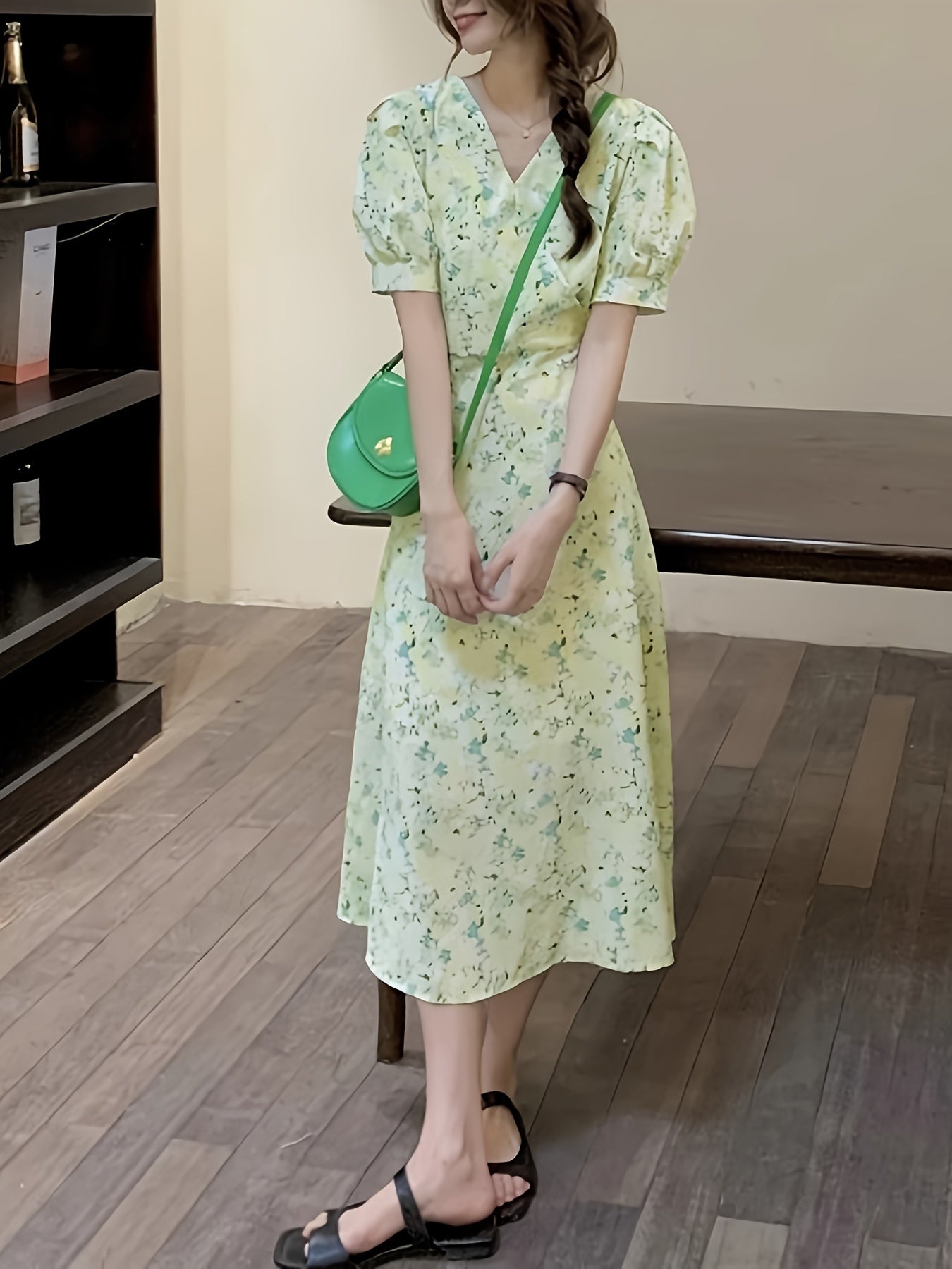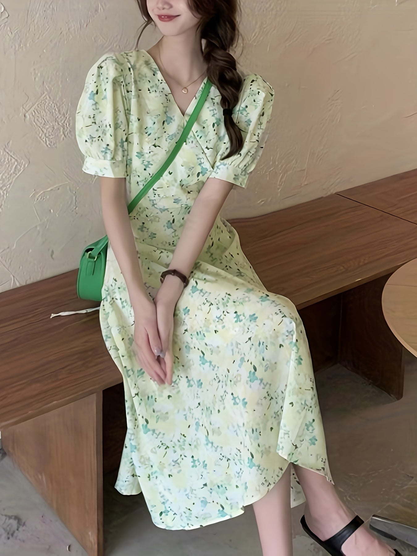 Sixsr Ditsy Print Puff Sleeve Dress, Casual Surplice Neck Short Sleeve Dress, Women's Clothing