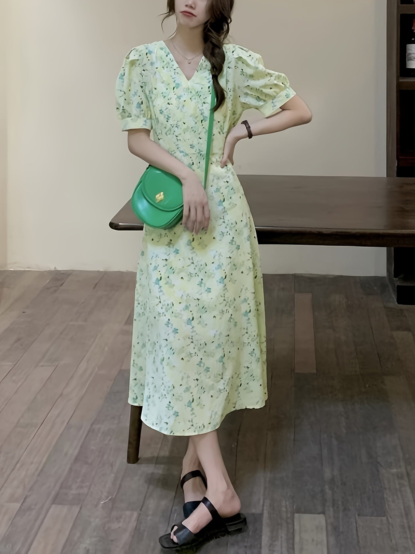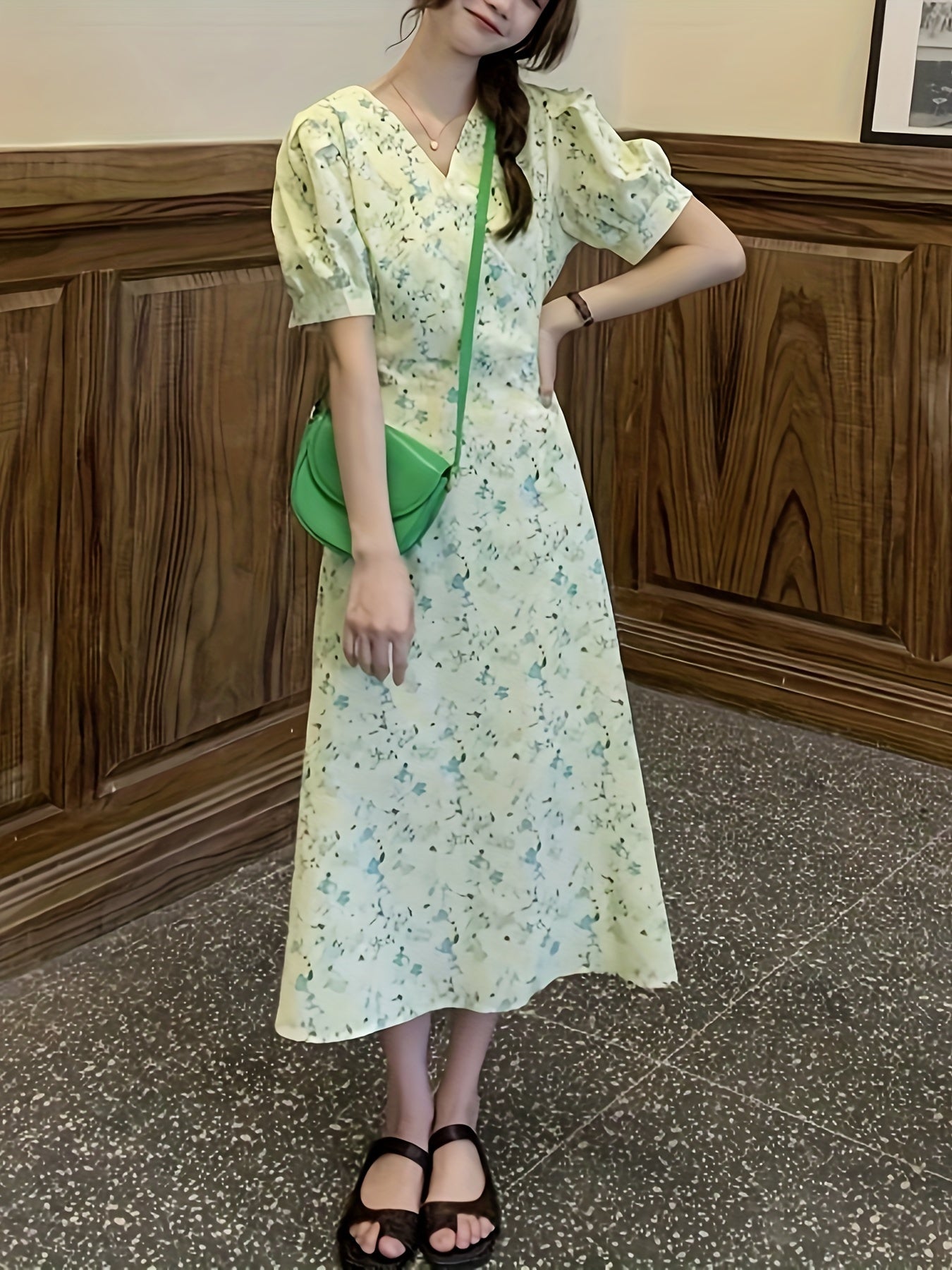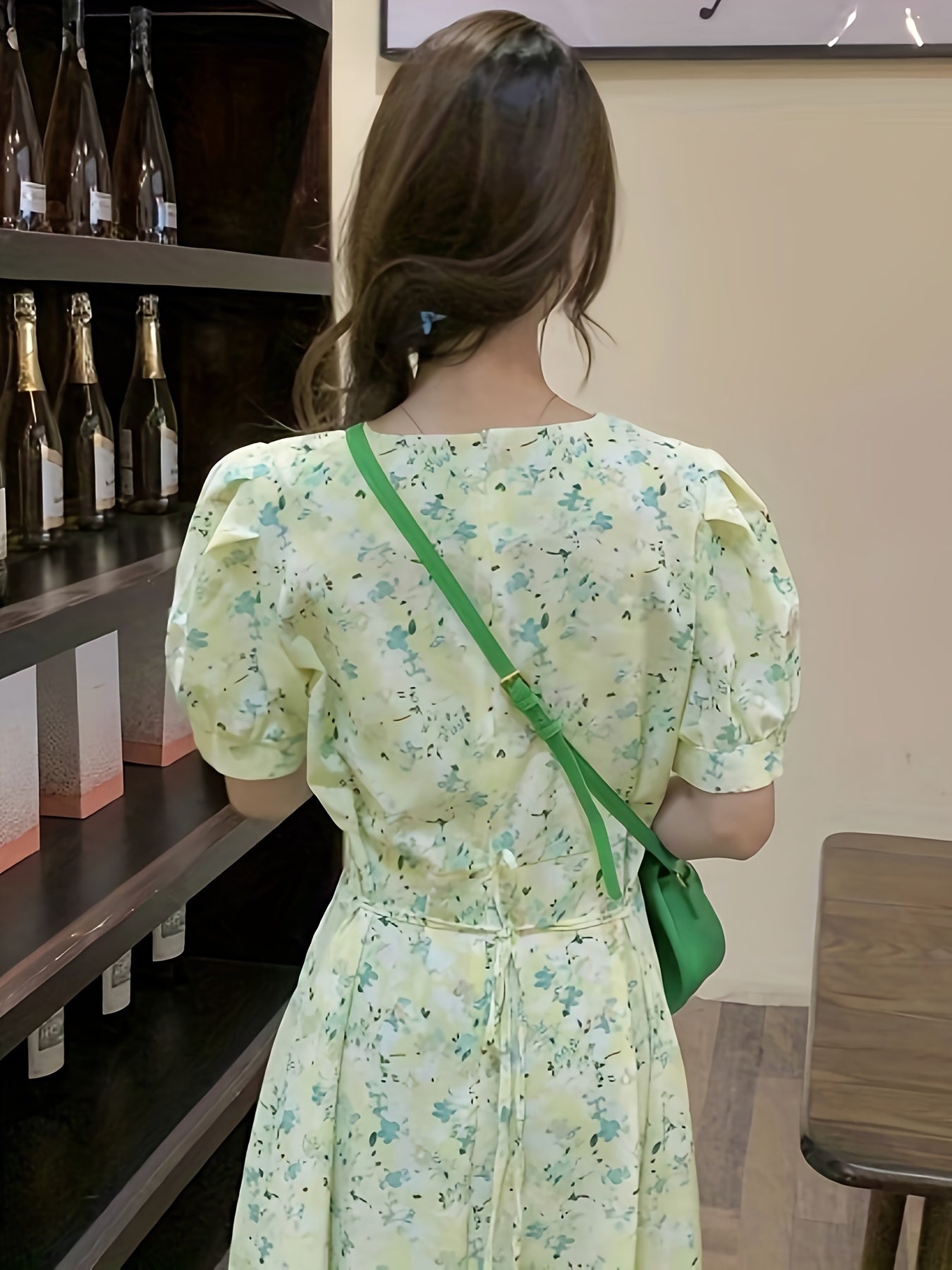 Sixsr Ditsy Print Puff Sleeve Dress, Casual Surplice Neck Short Sleeve Dress, Women's Clothing
