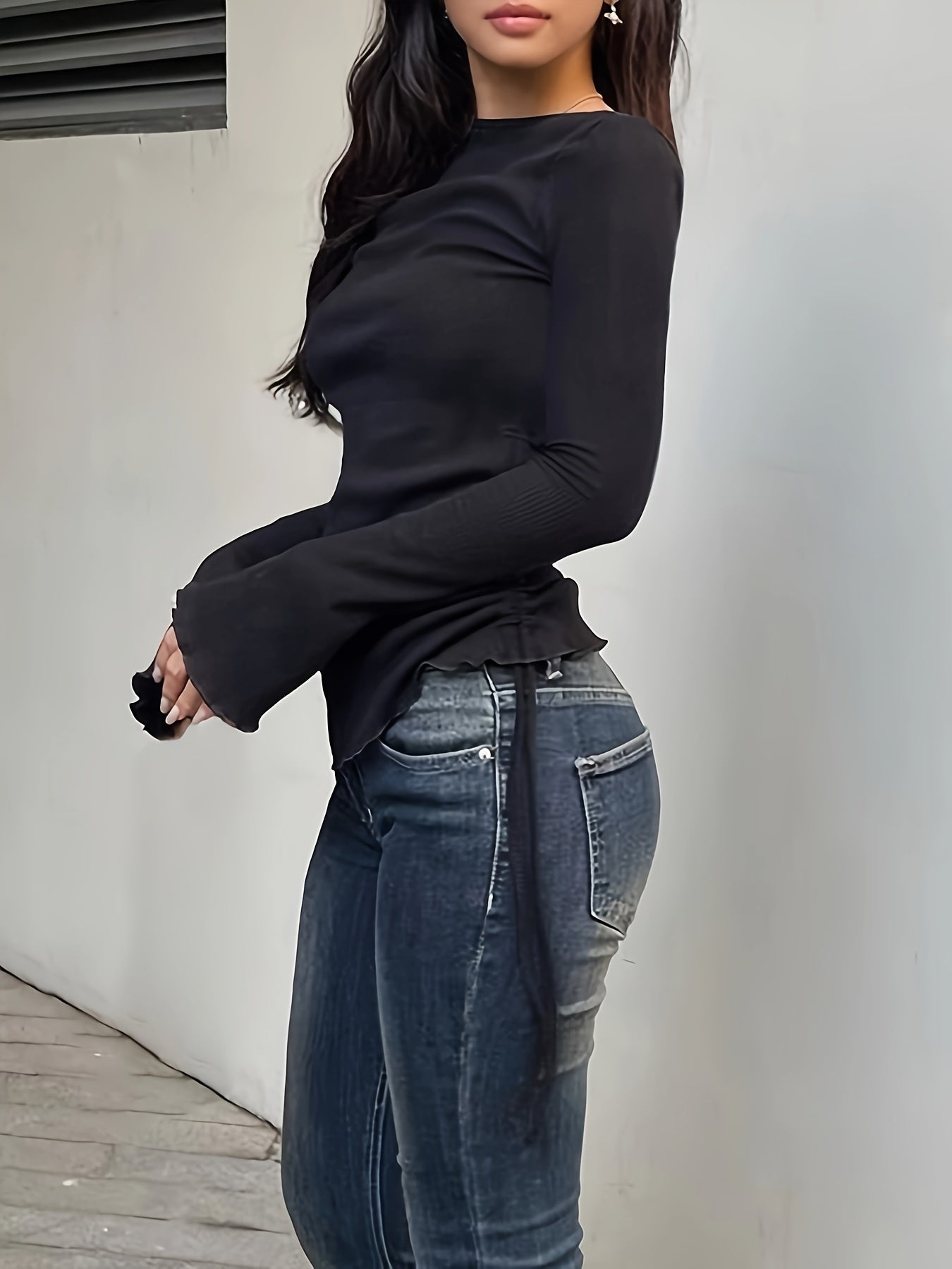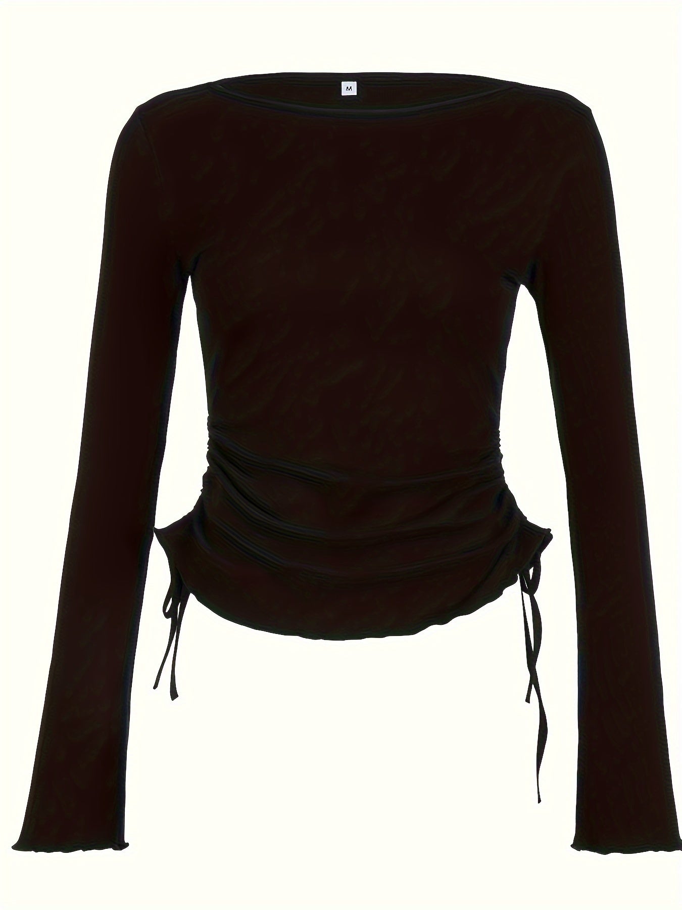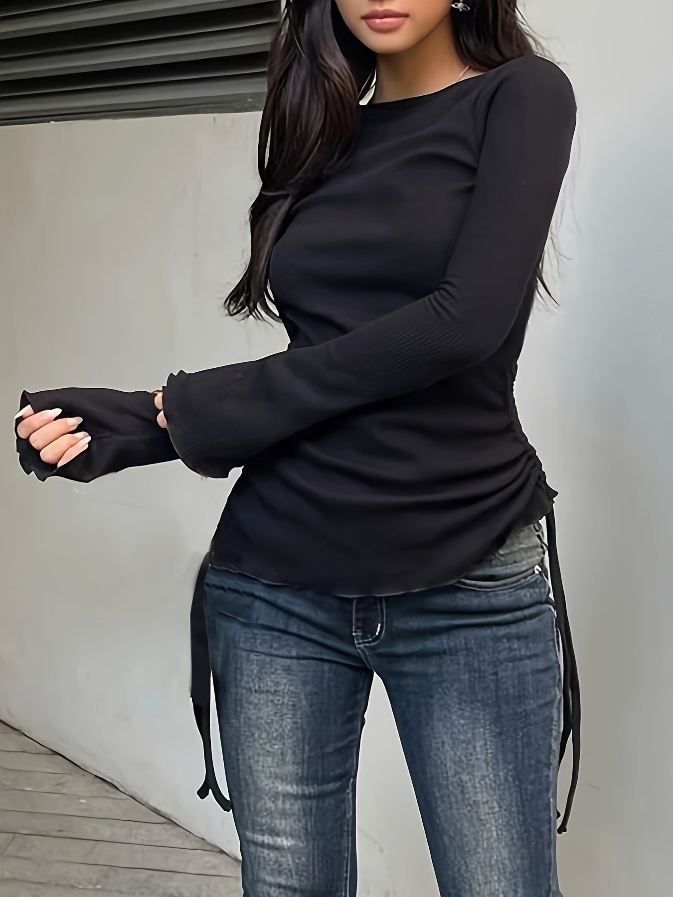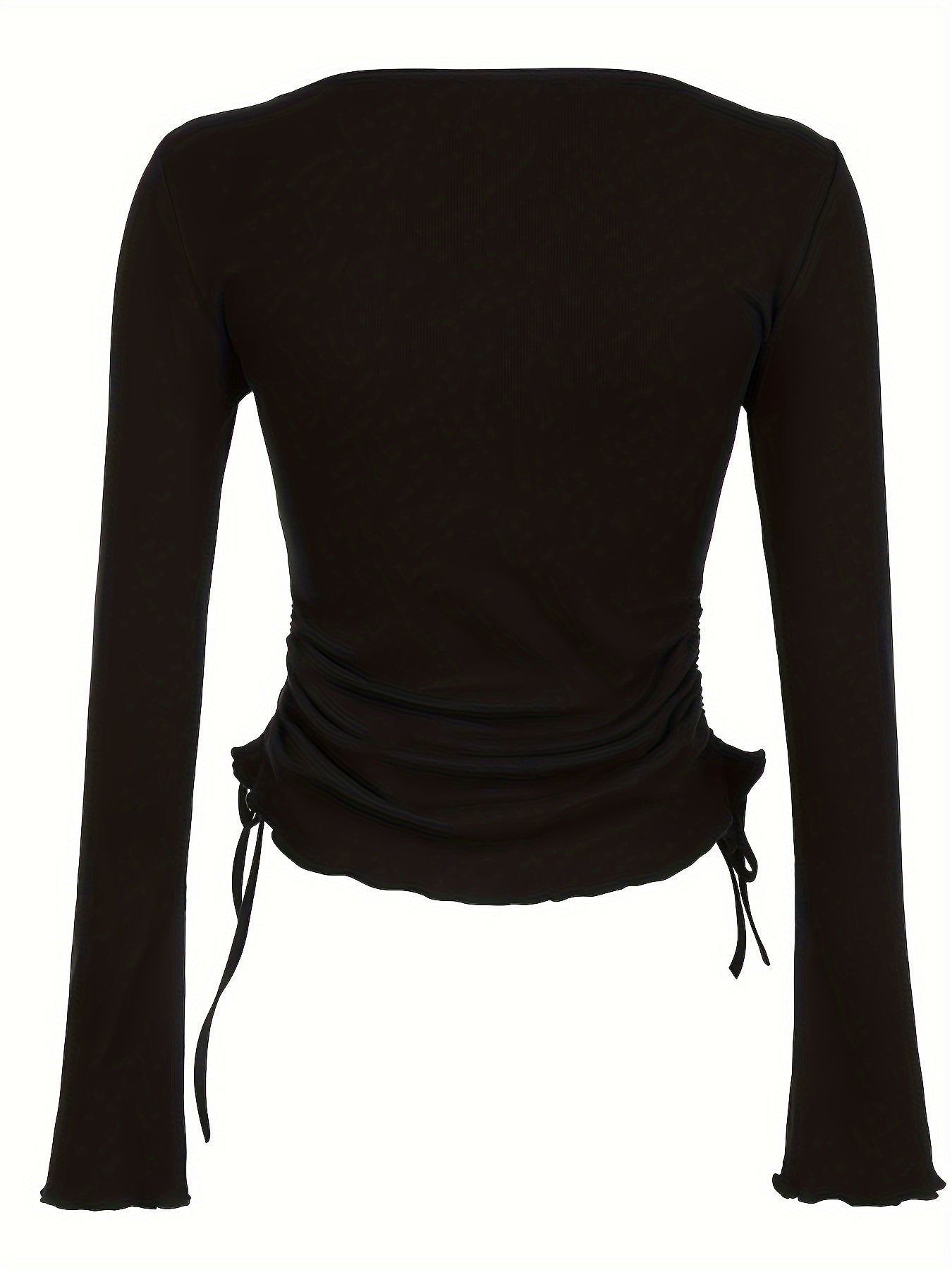 Sixsr Drawstring Crew Neck T-Shirt, Y2K Long Sleeve Lettuce Trim Top For Spring & Fall, Women's Clothing