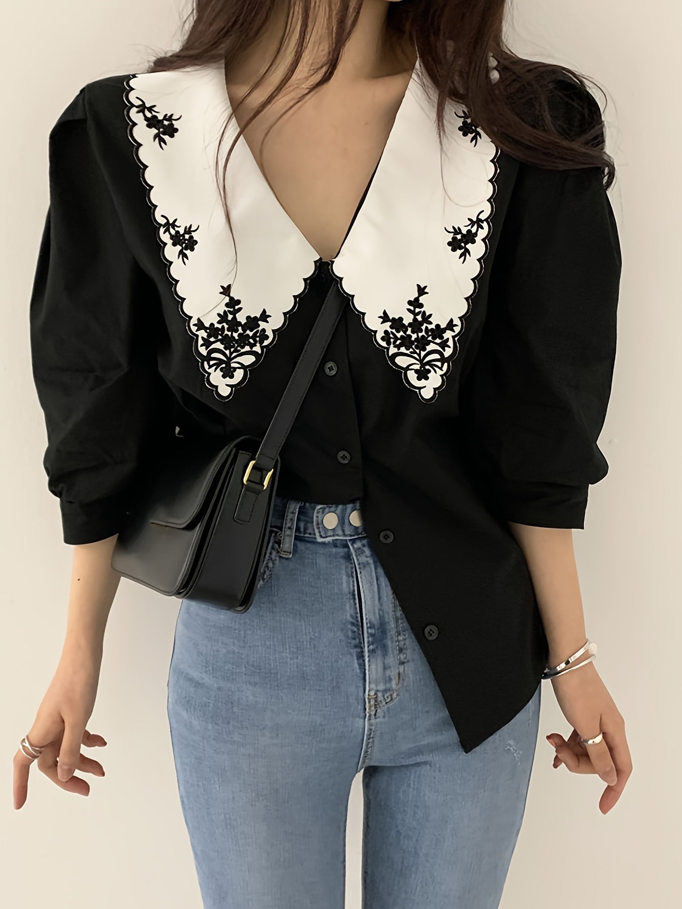 Sixsr Embroidered Peter Pan Collar Blouse, Vintage Half Sleeve Blouse For Spring & Summer, Women's Clothing