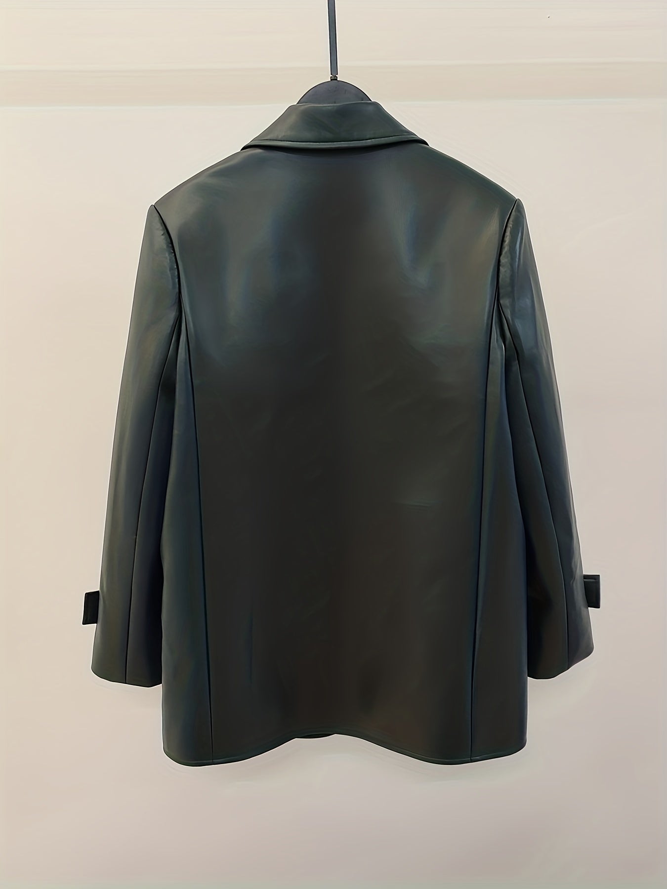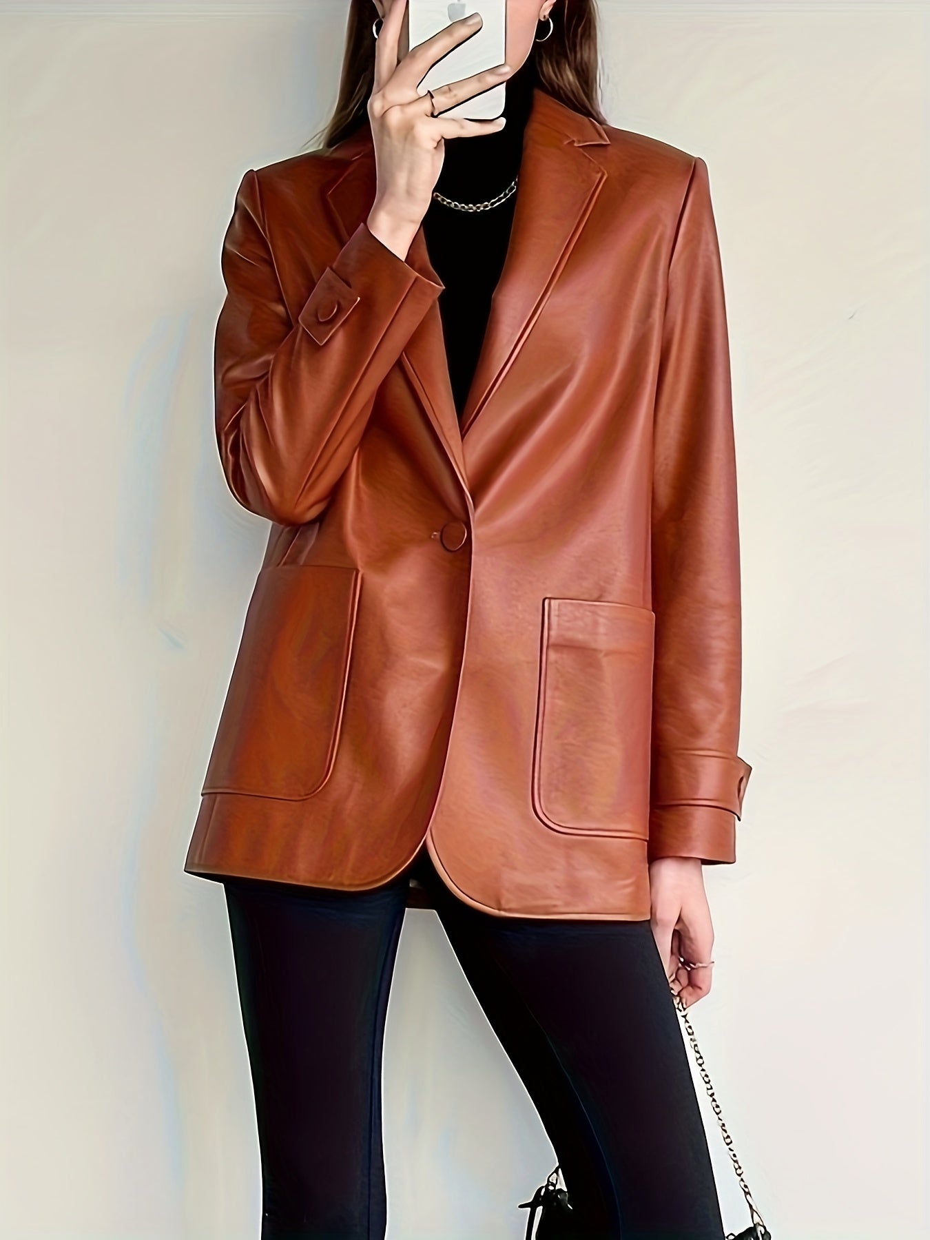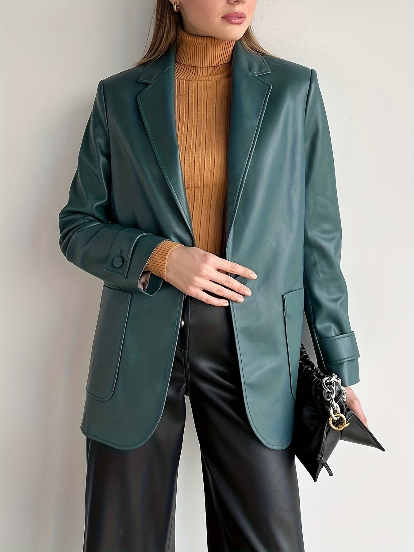 Sixsr Faux Leather Button Front Blazer, Elegant Dual Pockets Lapel Long Sleeve Blazer For Office & Work, Women's Clothing