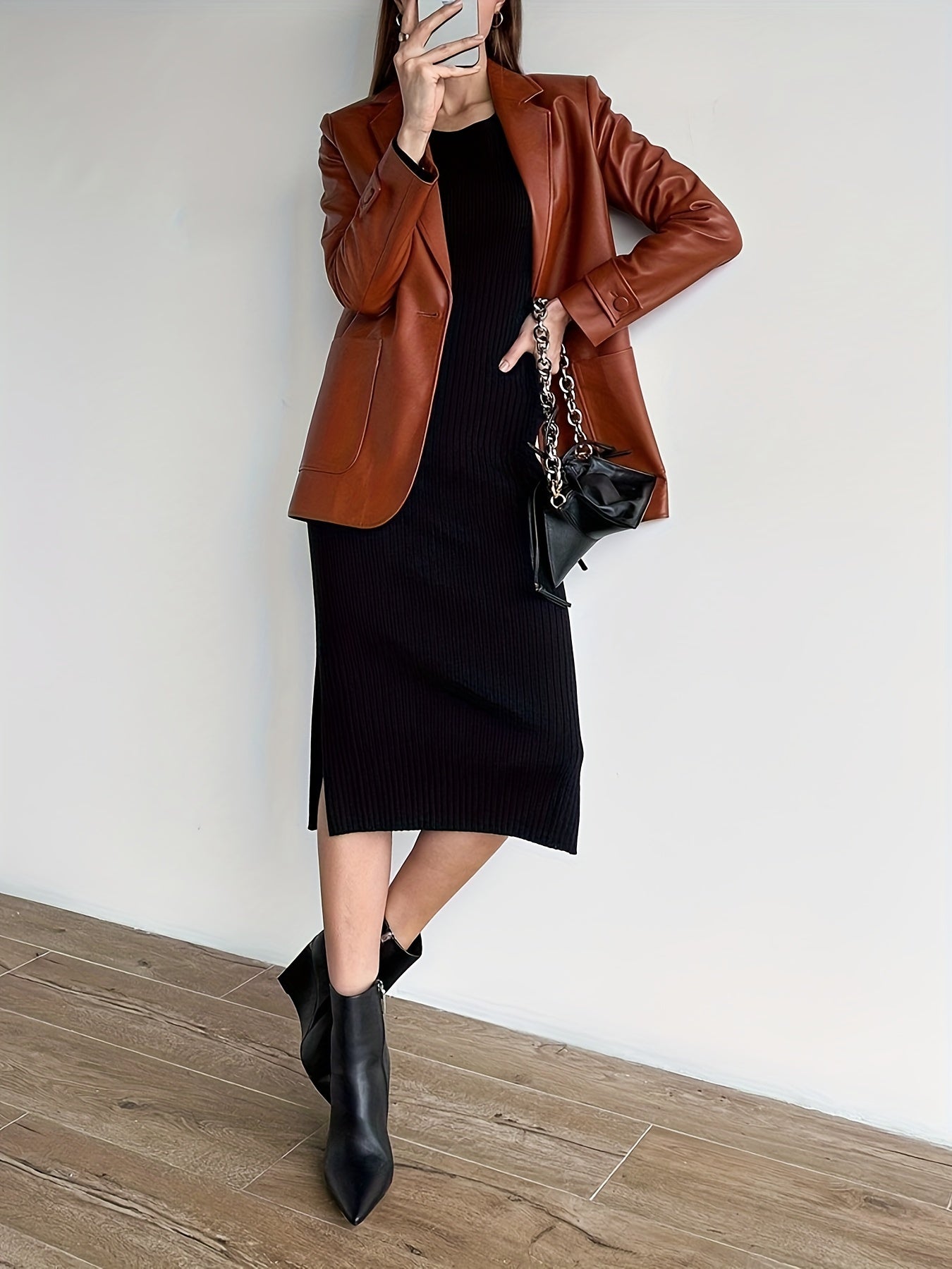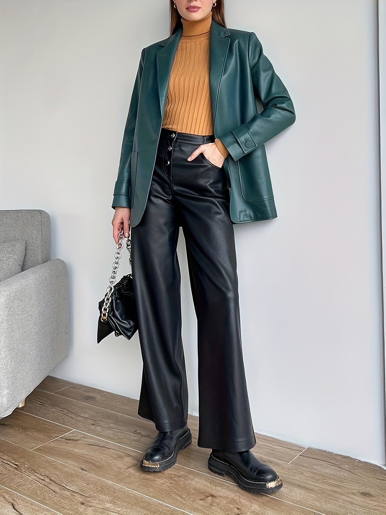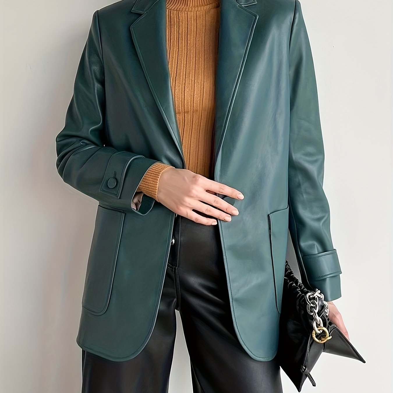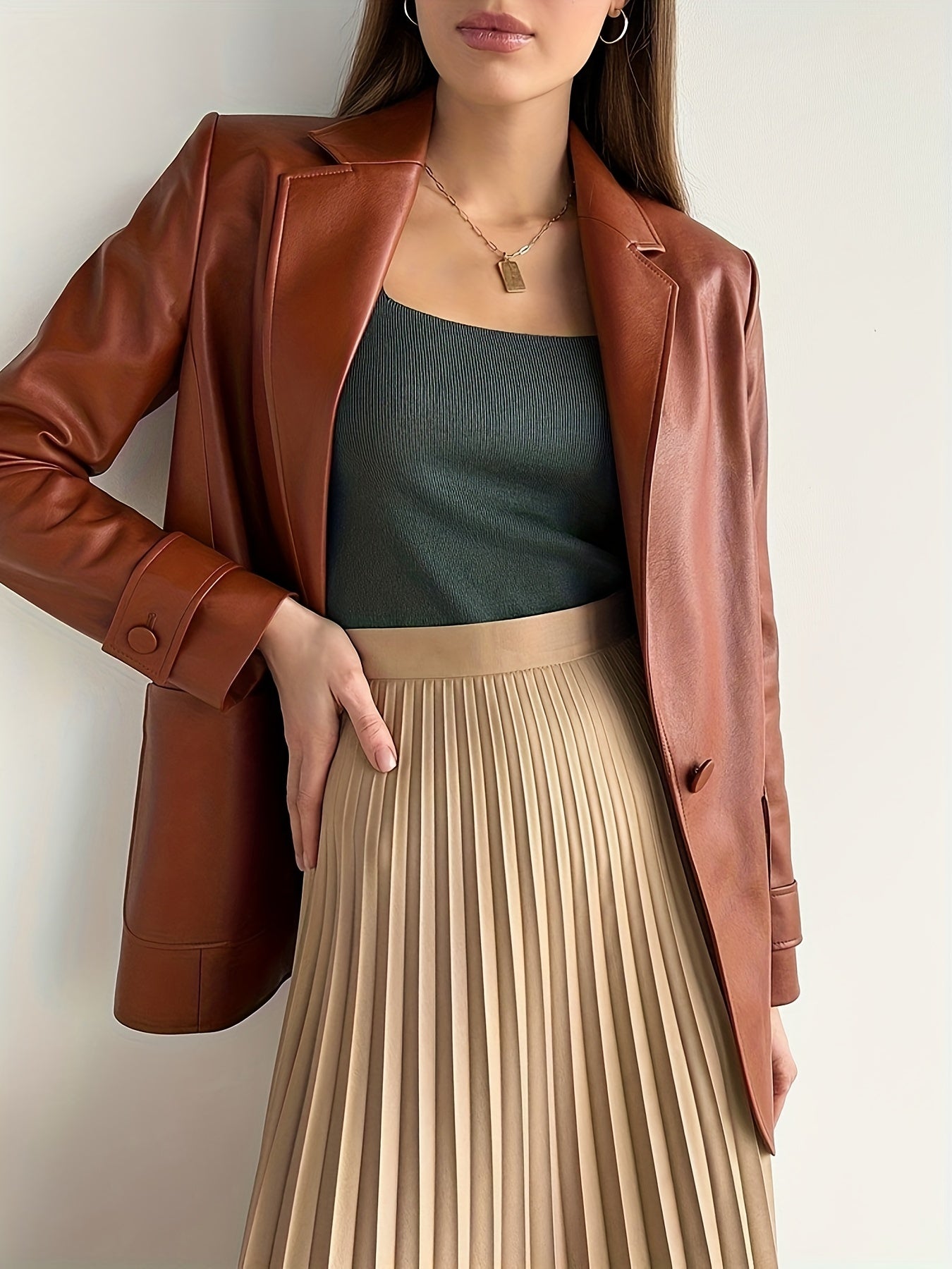 Sixsr Faux Leather Button Front Blazer, Elegant Dual Pockets Lapel Long Sleeve Blazer For Office & Work, Women's Clothing