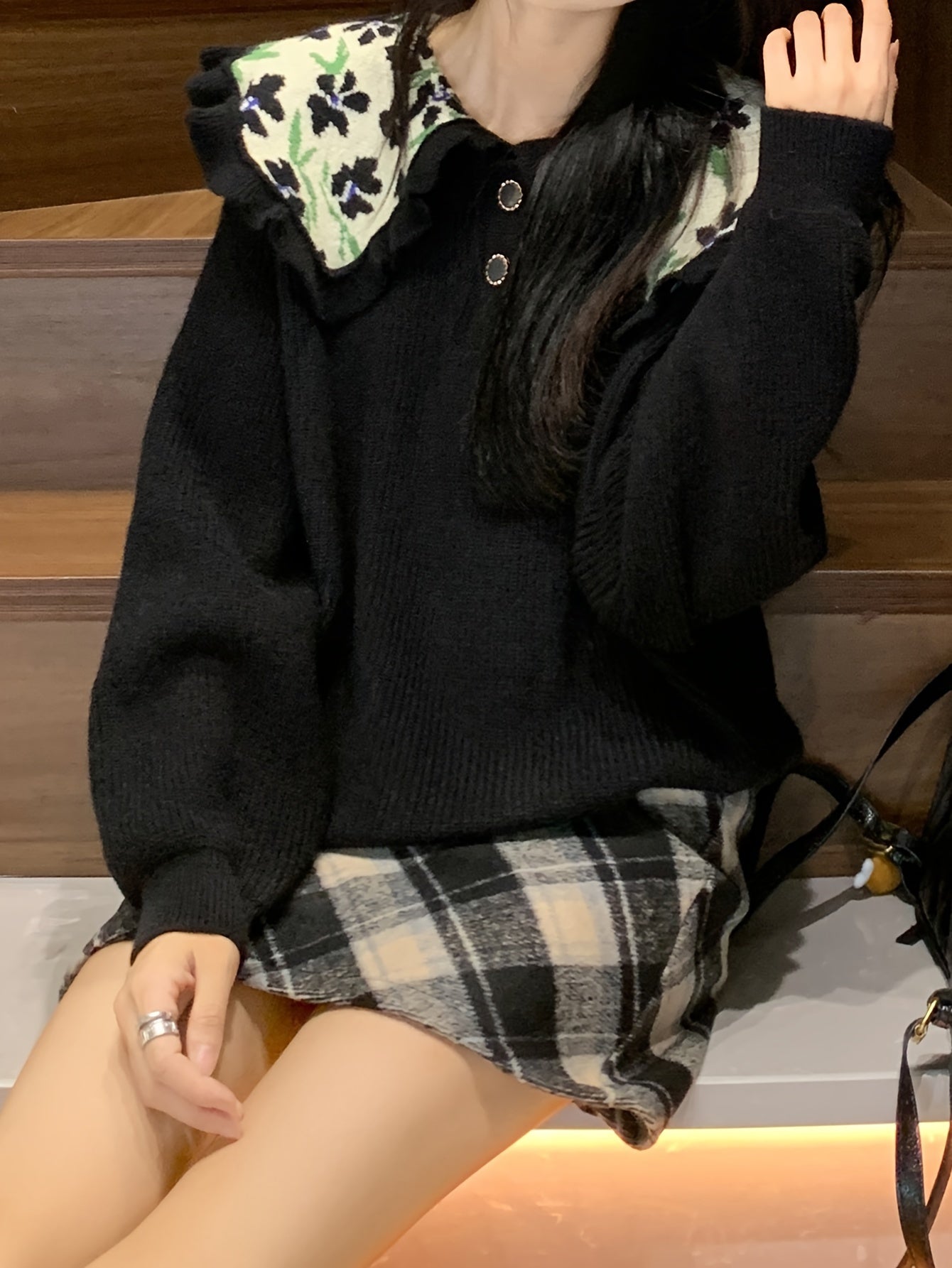Sixsr Floral Pattern Ruffle Trim Lapel Sweater, Casual Long Sleeve Button Sweater For Fall & Winter, Women's Clothing