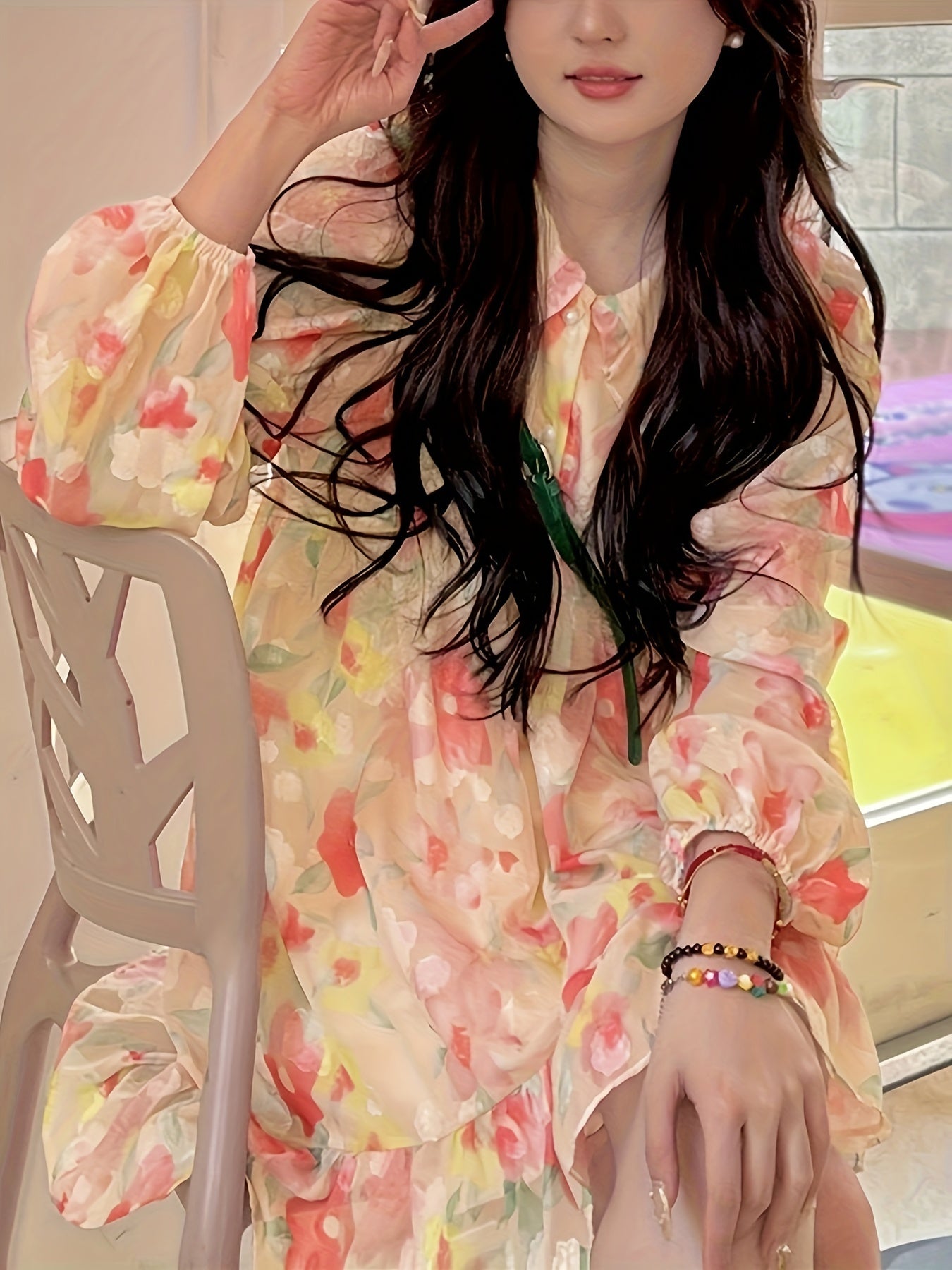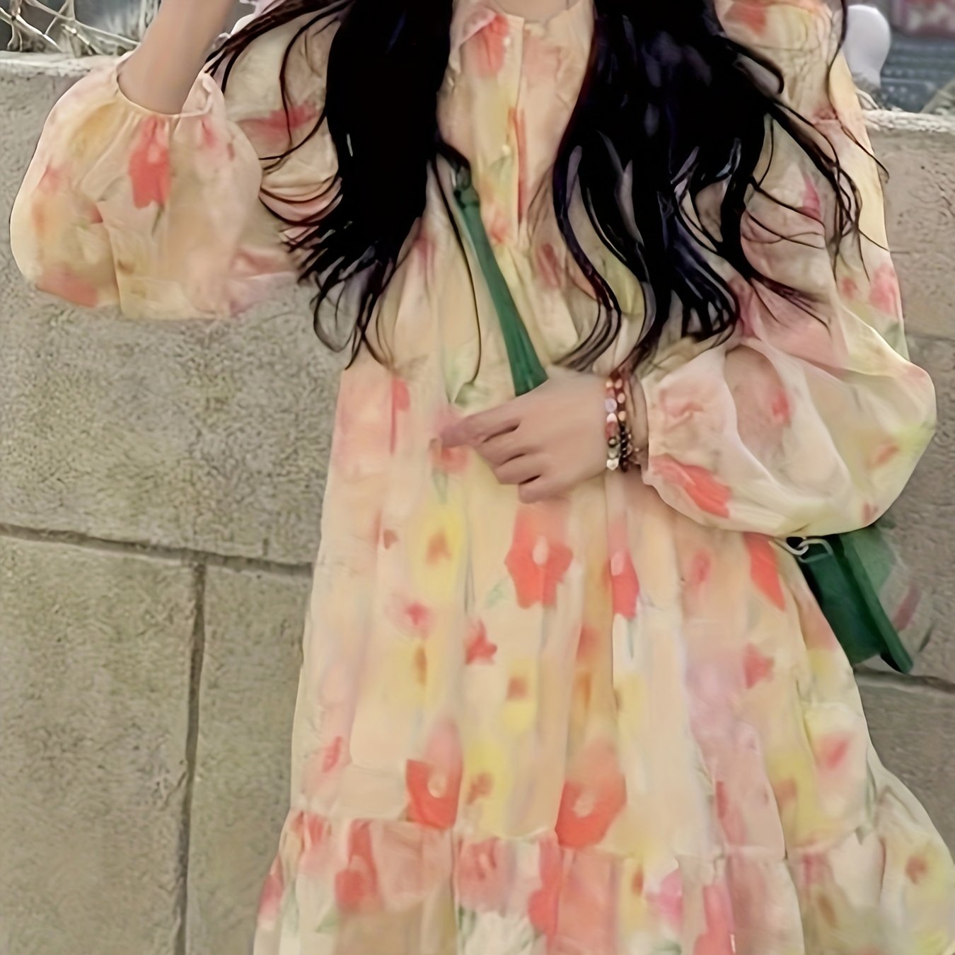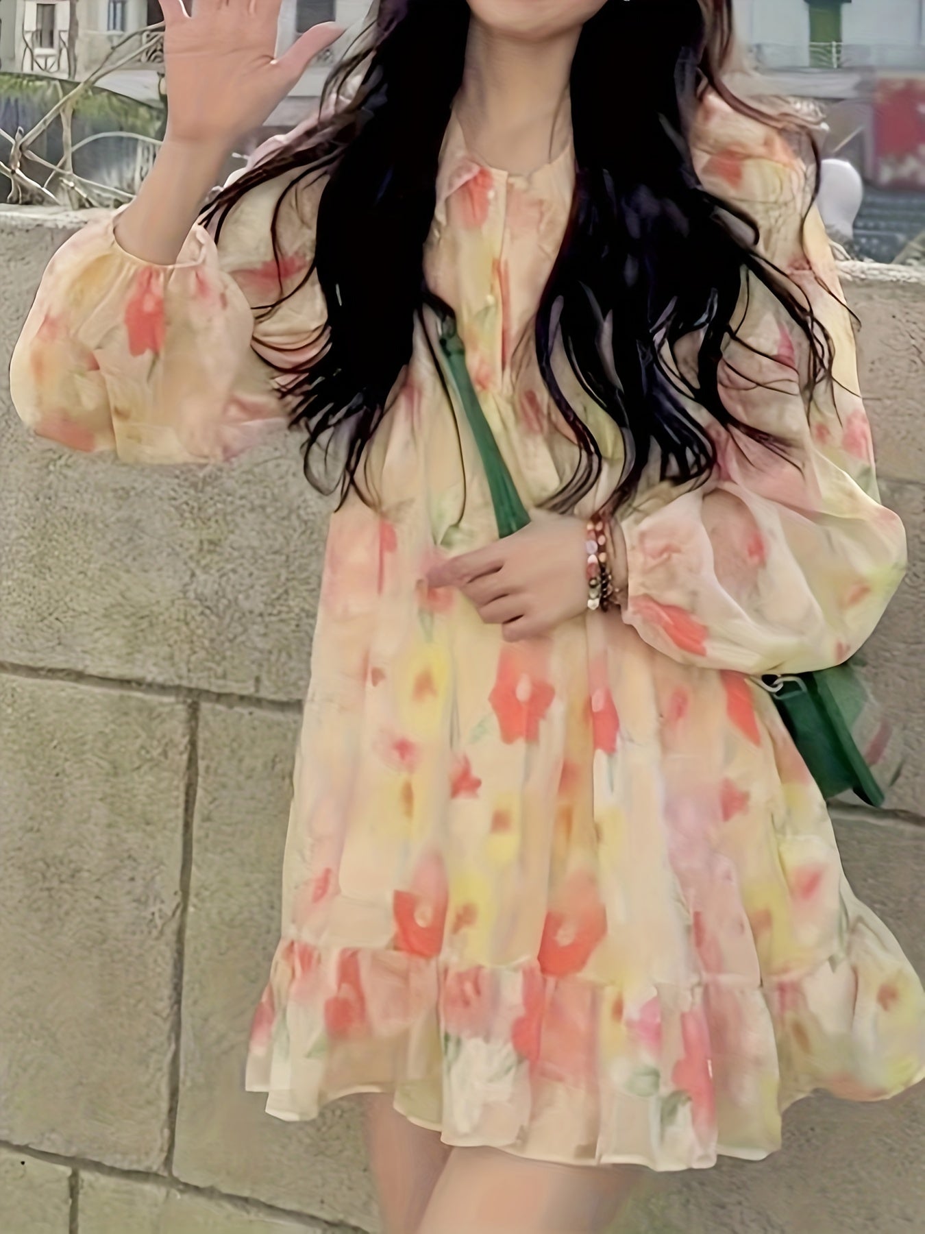 Sixsr Floral Print Round Collar Ruffle Chiffon Dress, Lantern Long Sleeve Casual Dress, Women's Clothing