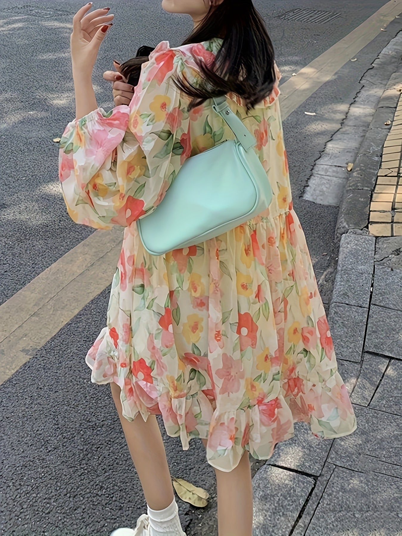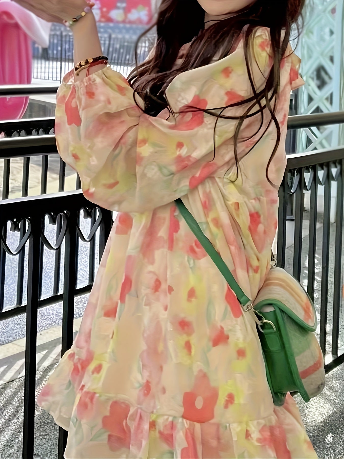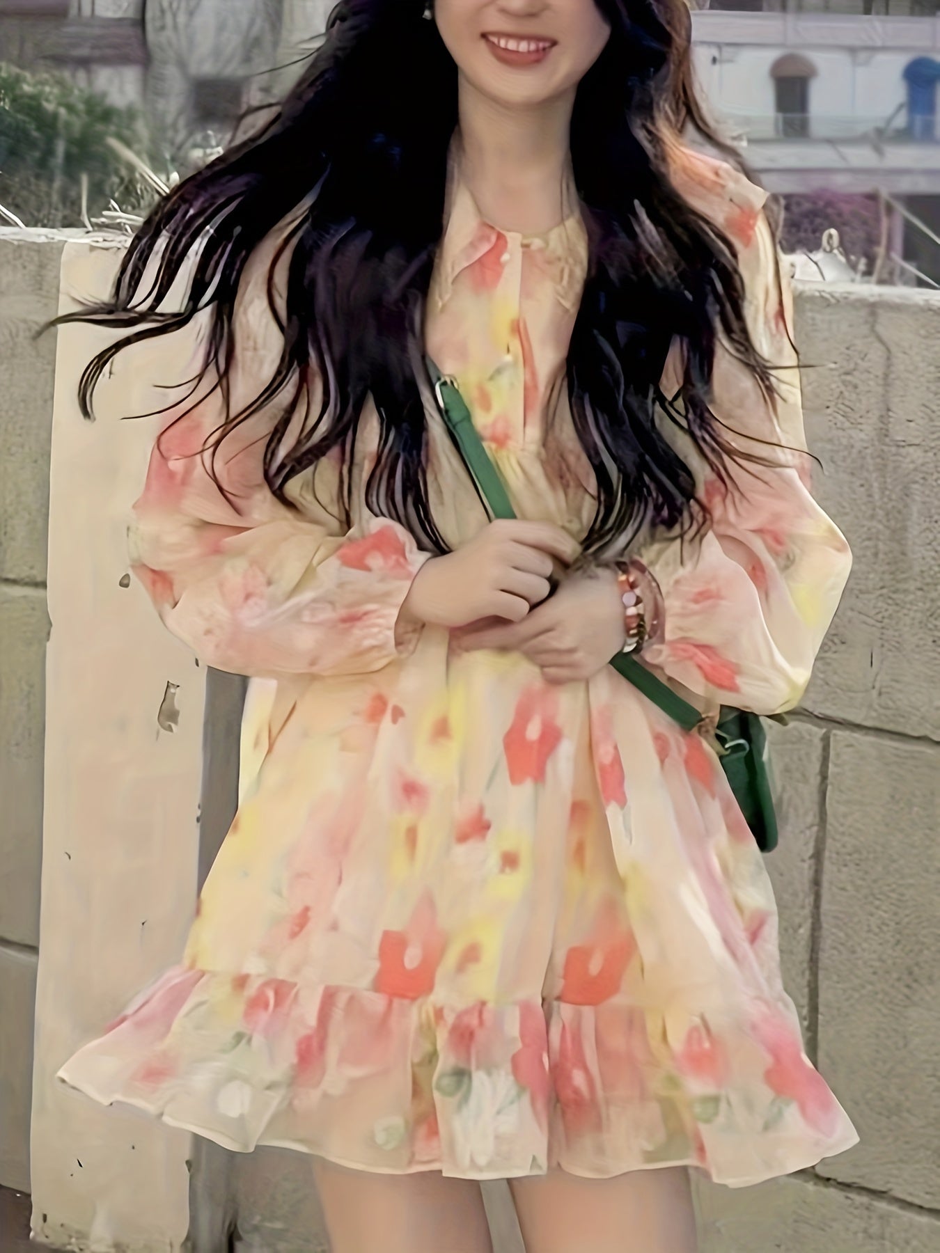 Sixsr Floral Print Round Collar Ruffle Chiffon Dress, Lantern Long Sleeve Casual Dress, Women's Clothing