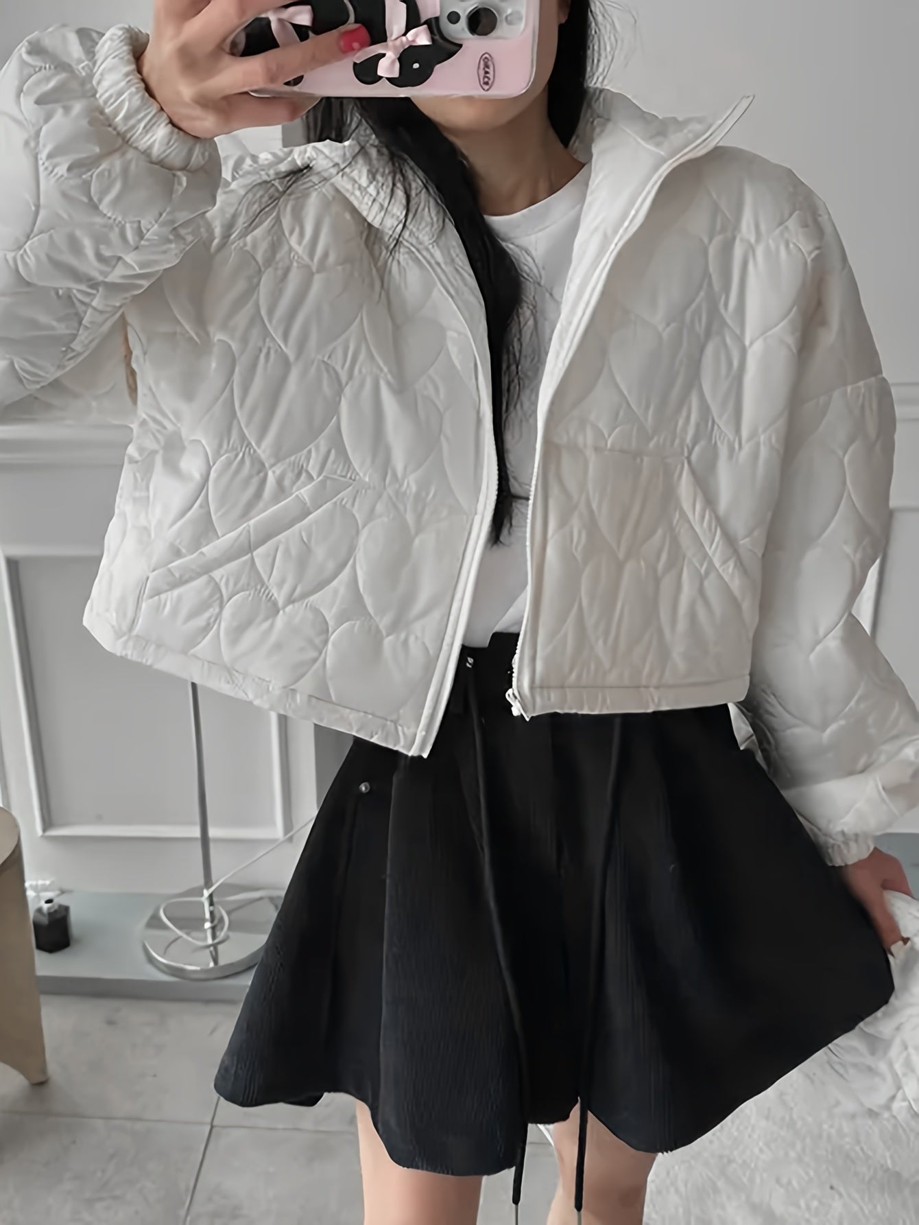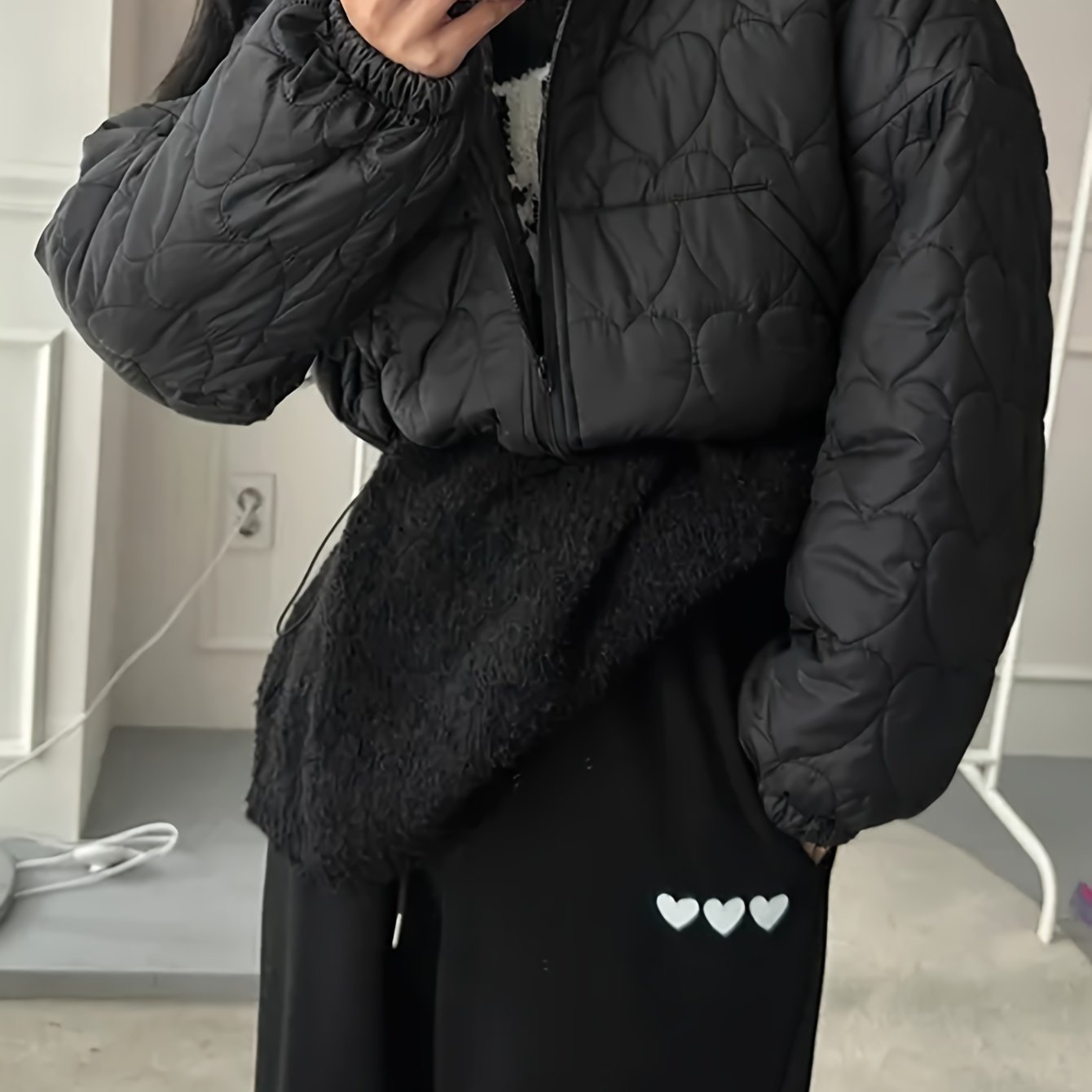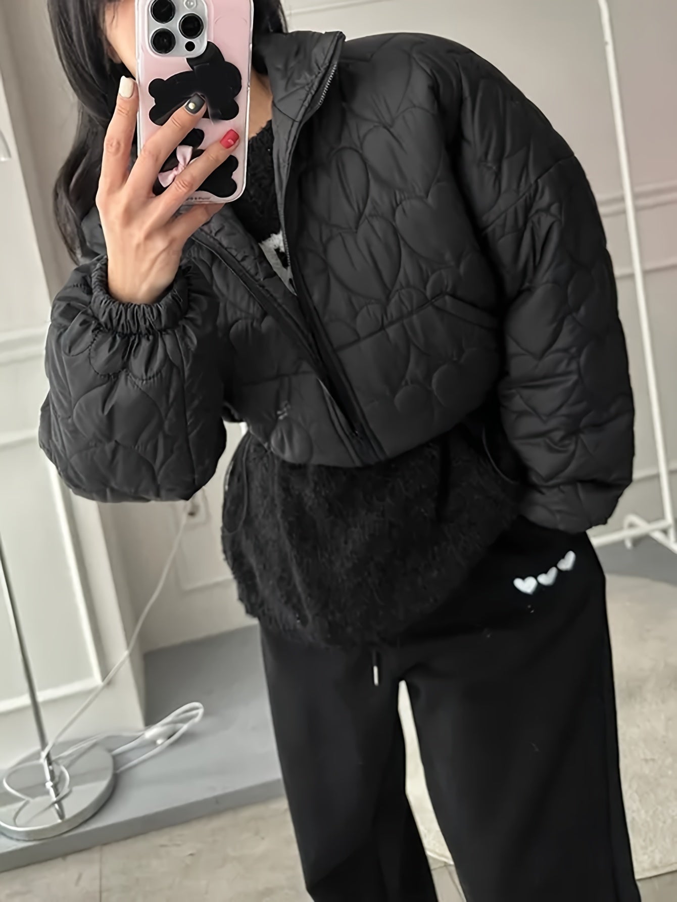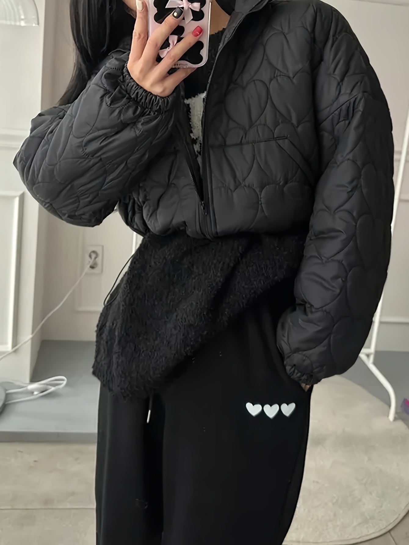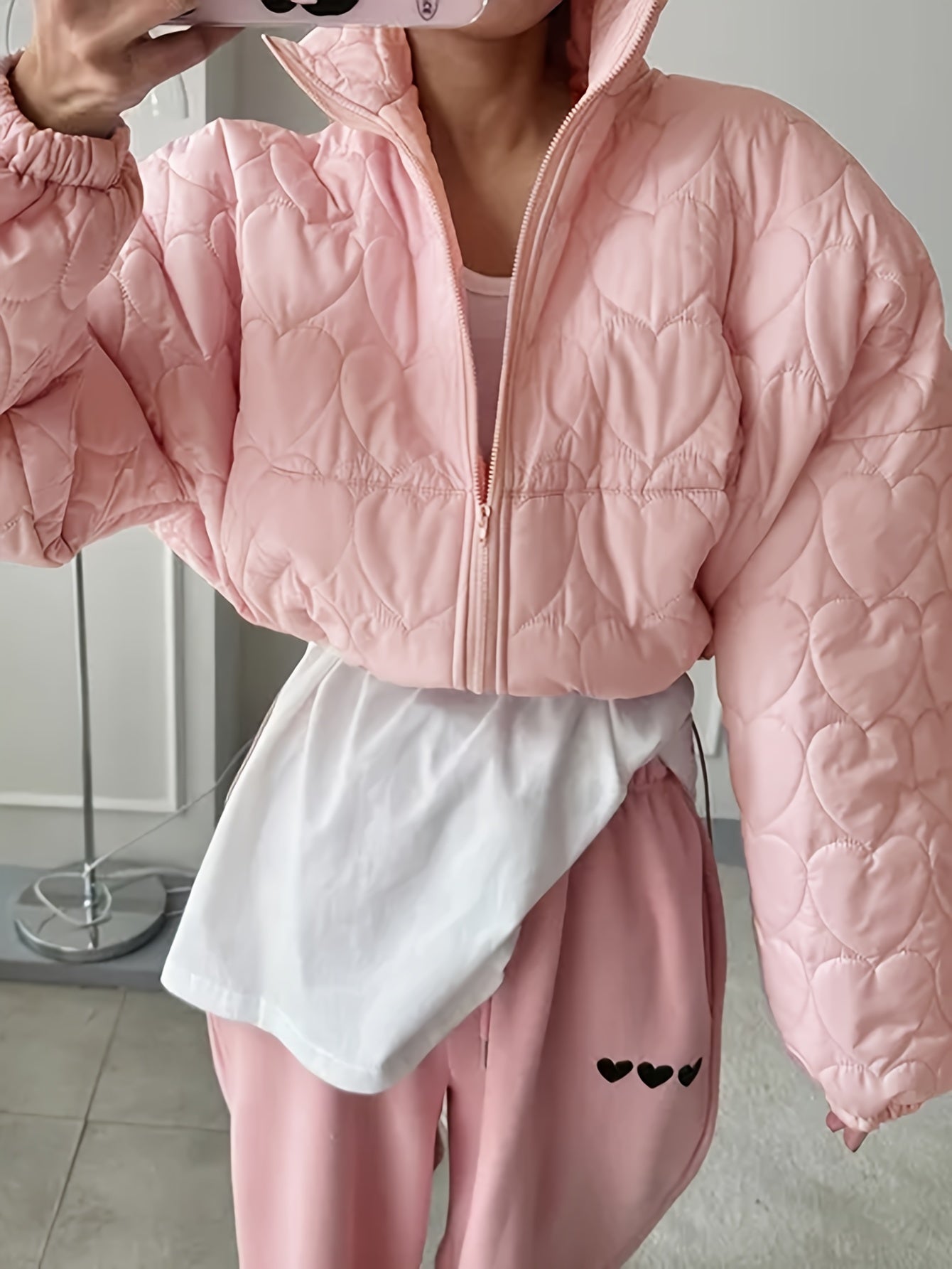 Sixsr Heart Pattern Zip Up Jacket, Casual Collared Long Sleeve Warm Outerwear For Fall & Winter, Women's Clothing