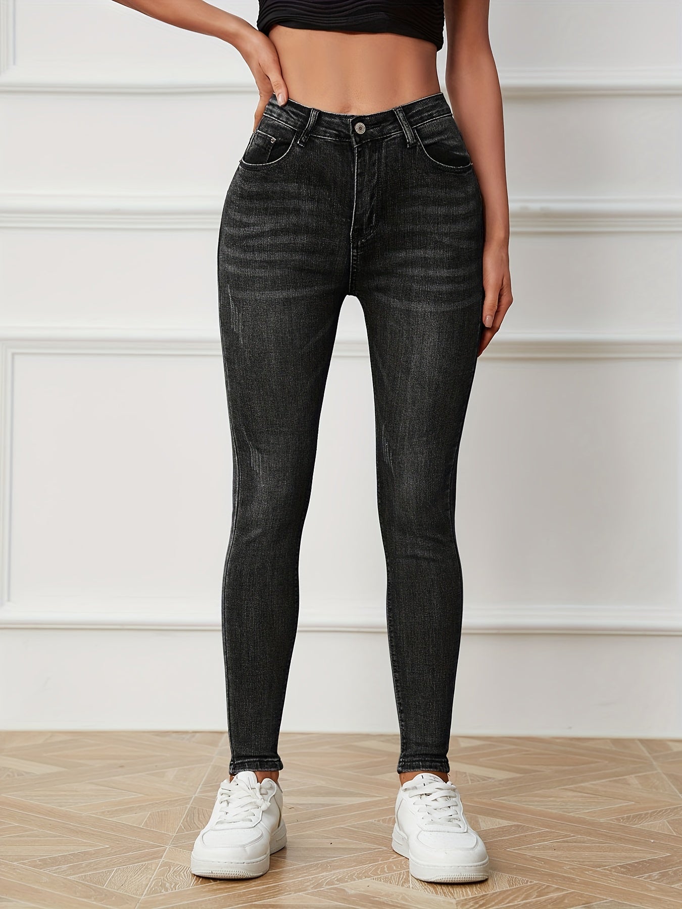Sixsr High Rise Water Ripple Embossed Skinny Jeans, High Waist Zipper Button Closure Solid Color Skinny Pants, Women's Denim Jeans, Women's Clothing