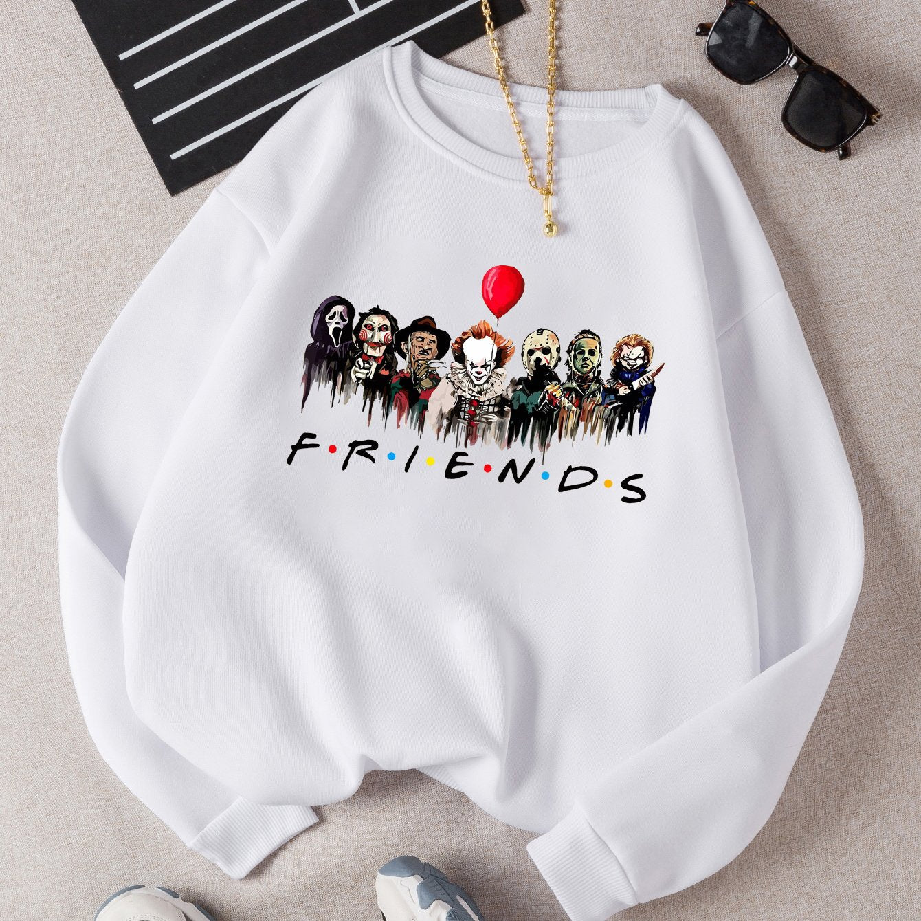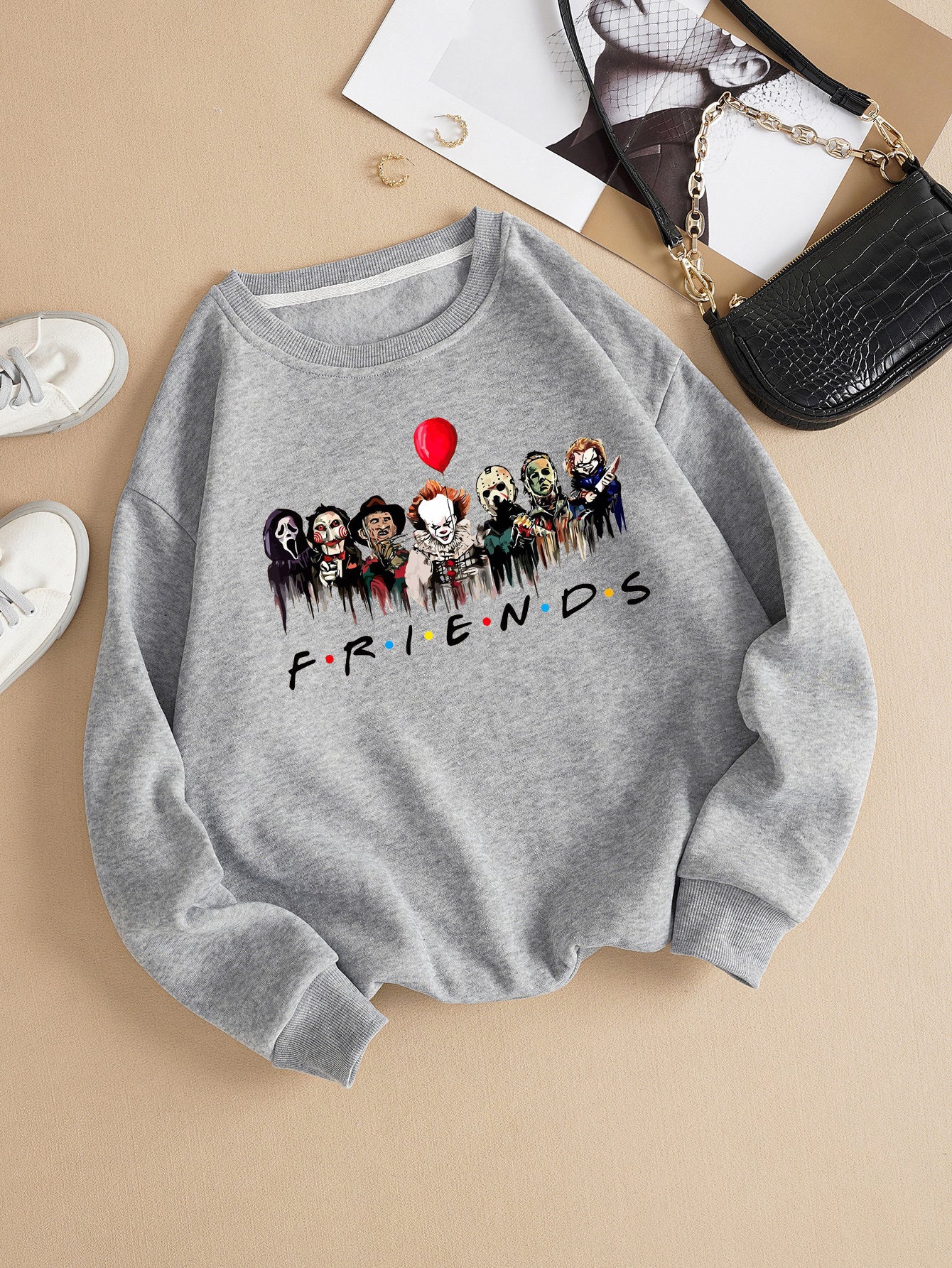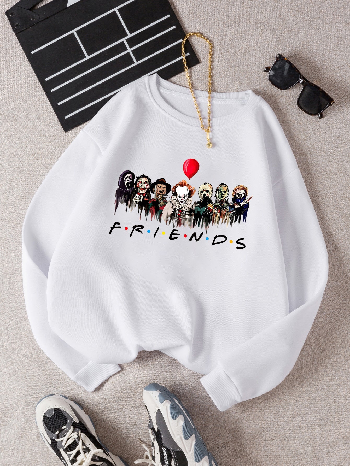 Sixsr Horror Characters Friends Graphic Print Round Neck Long Sleeve Pullover, Casual Drop Shoulder Comfy Sweatshirt, Women's Clothing