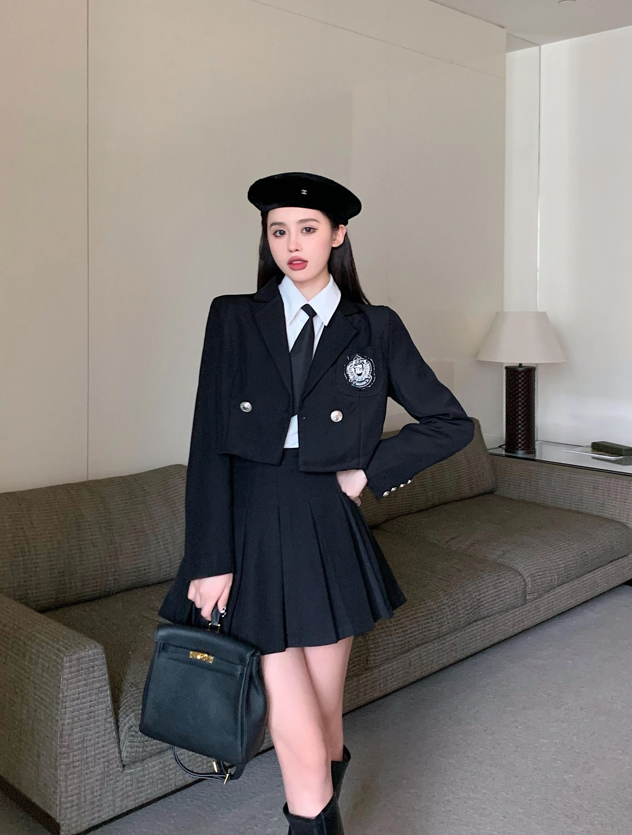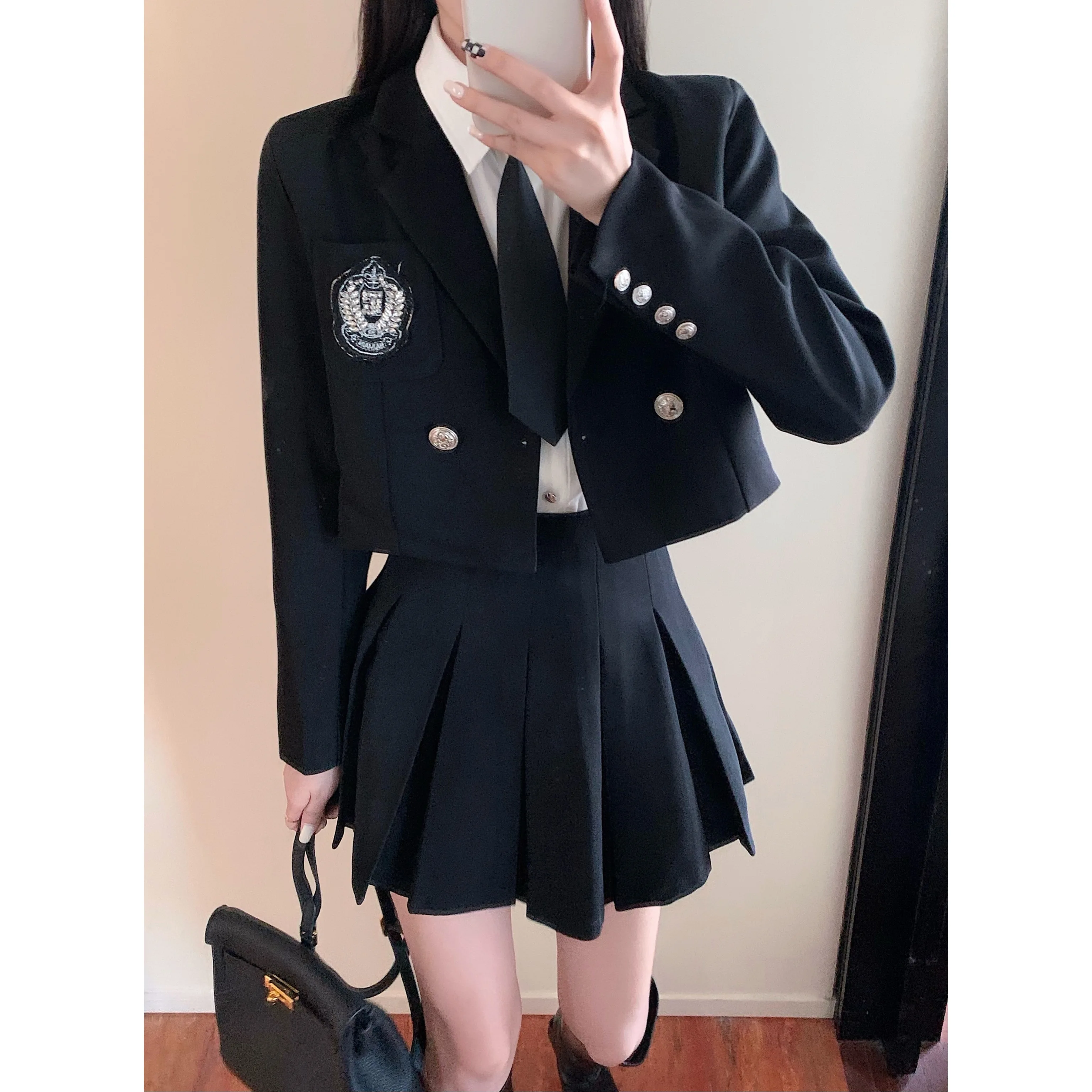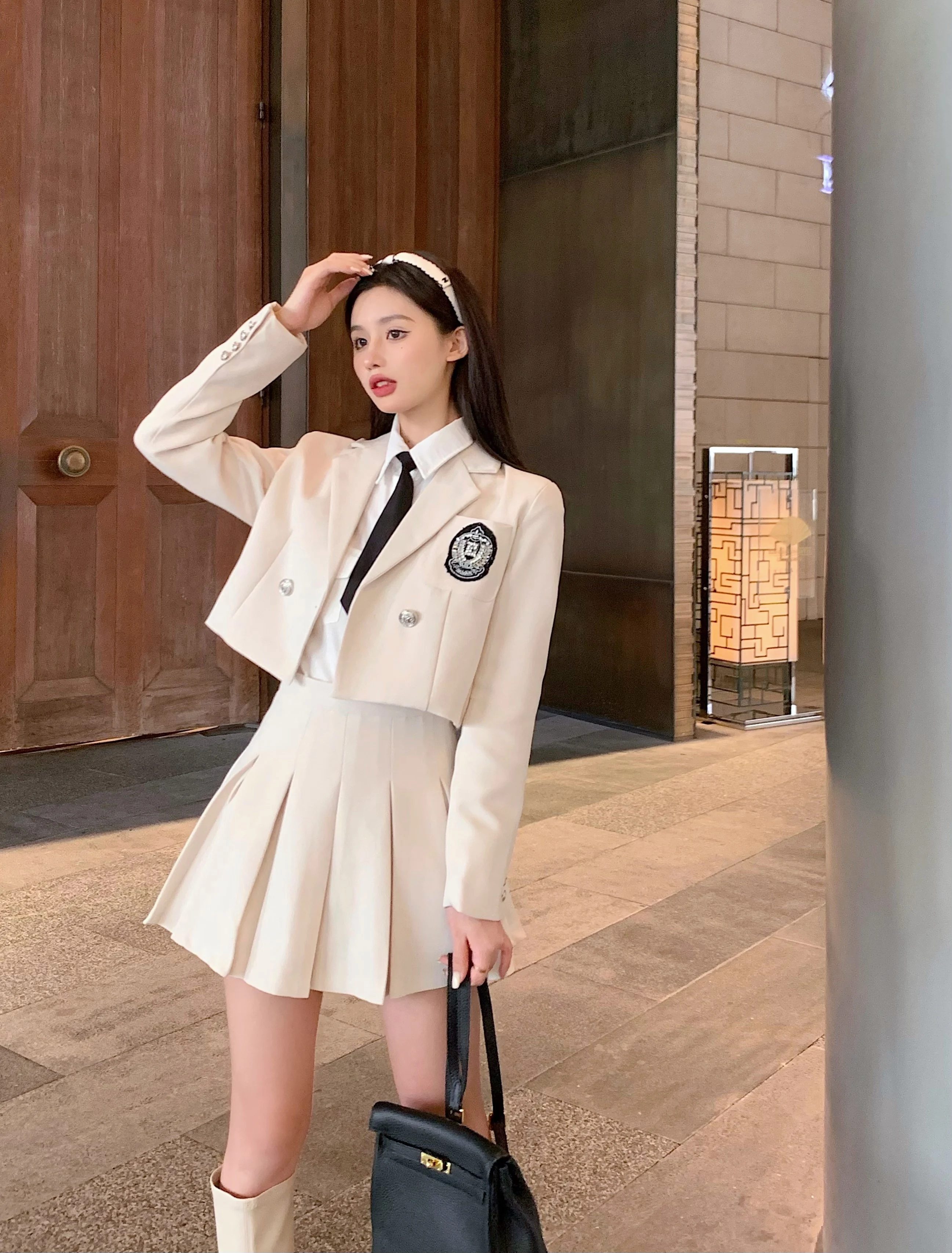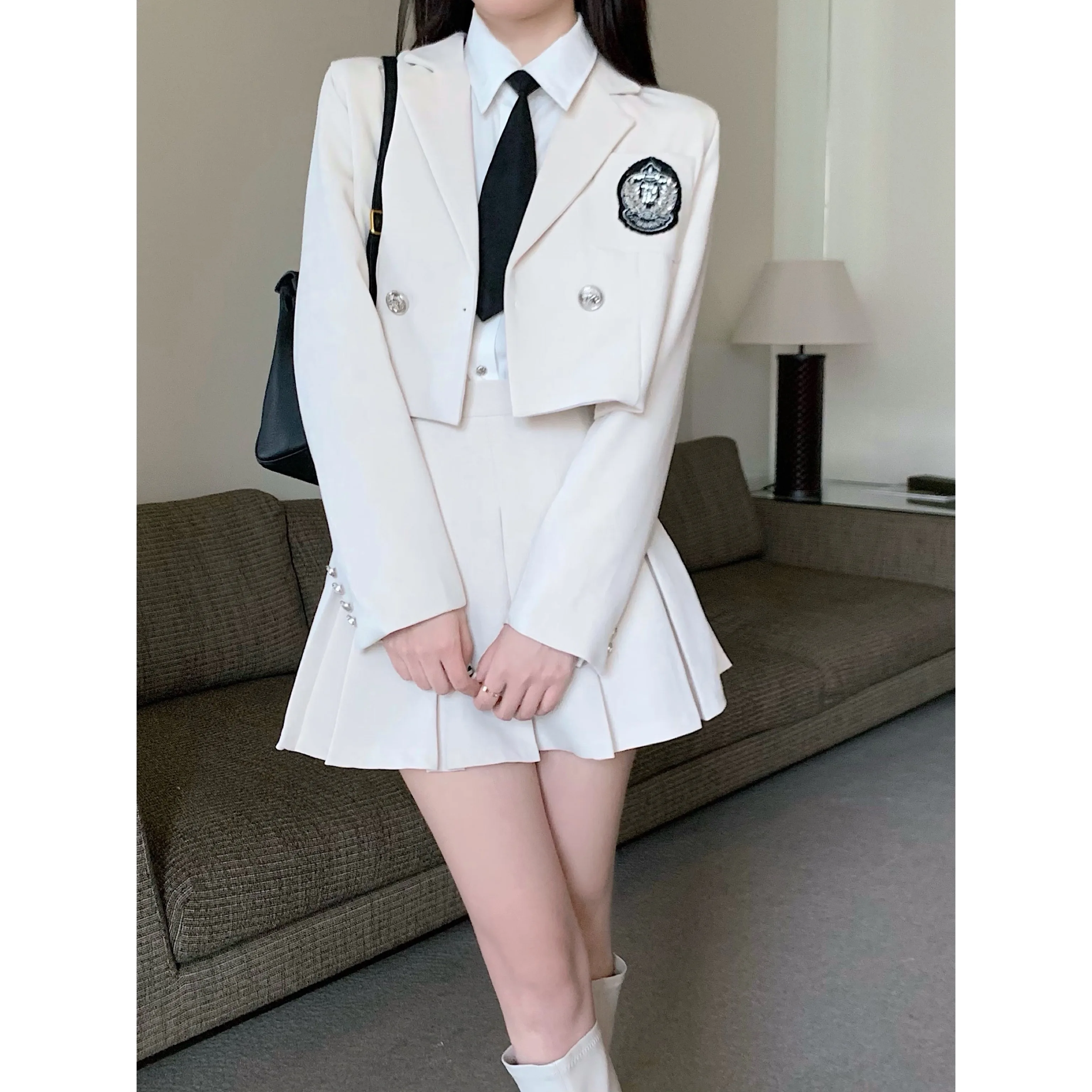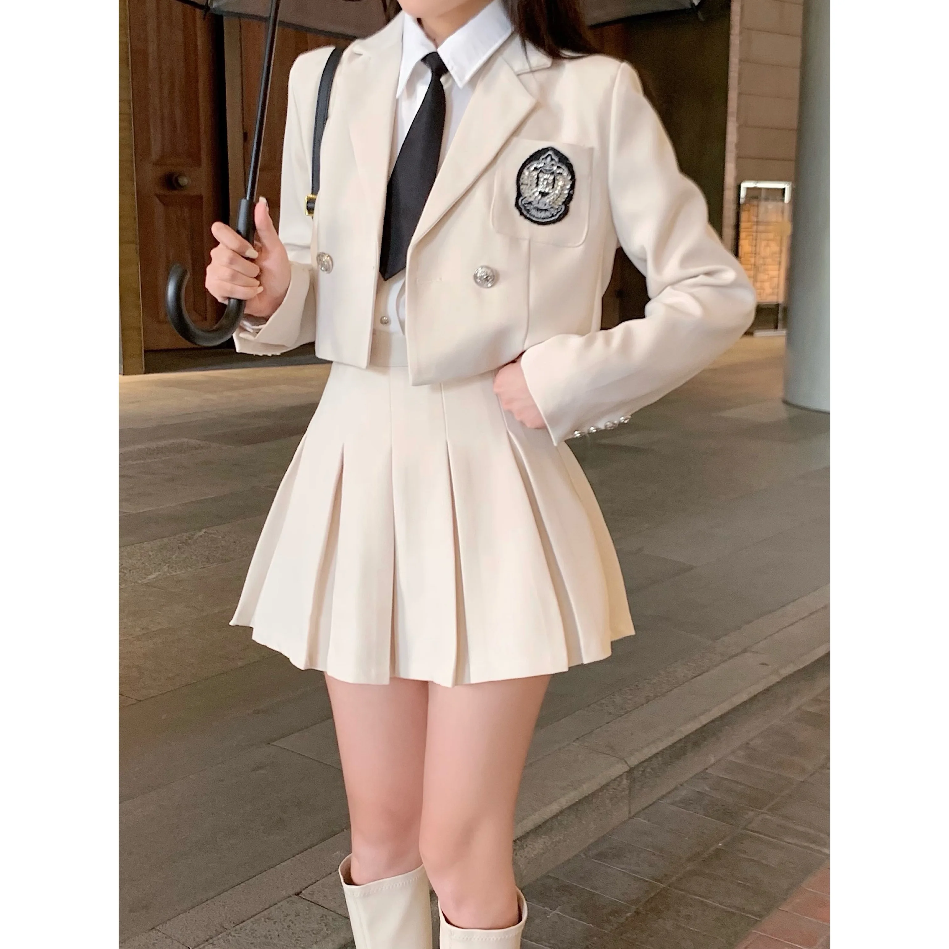 sixsr JK Blazer Skirt Set Female Short Suit Jacket + Pleated Skirt Spring Autumn Professional Wear Elegant Goddess Two-piece Set