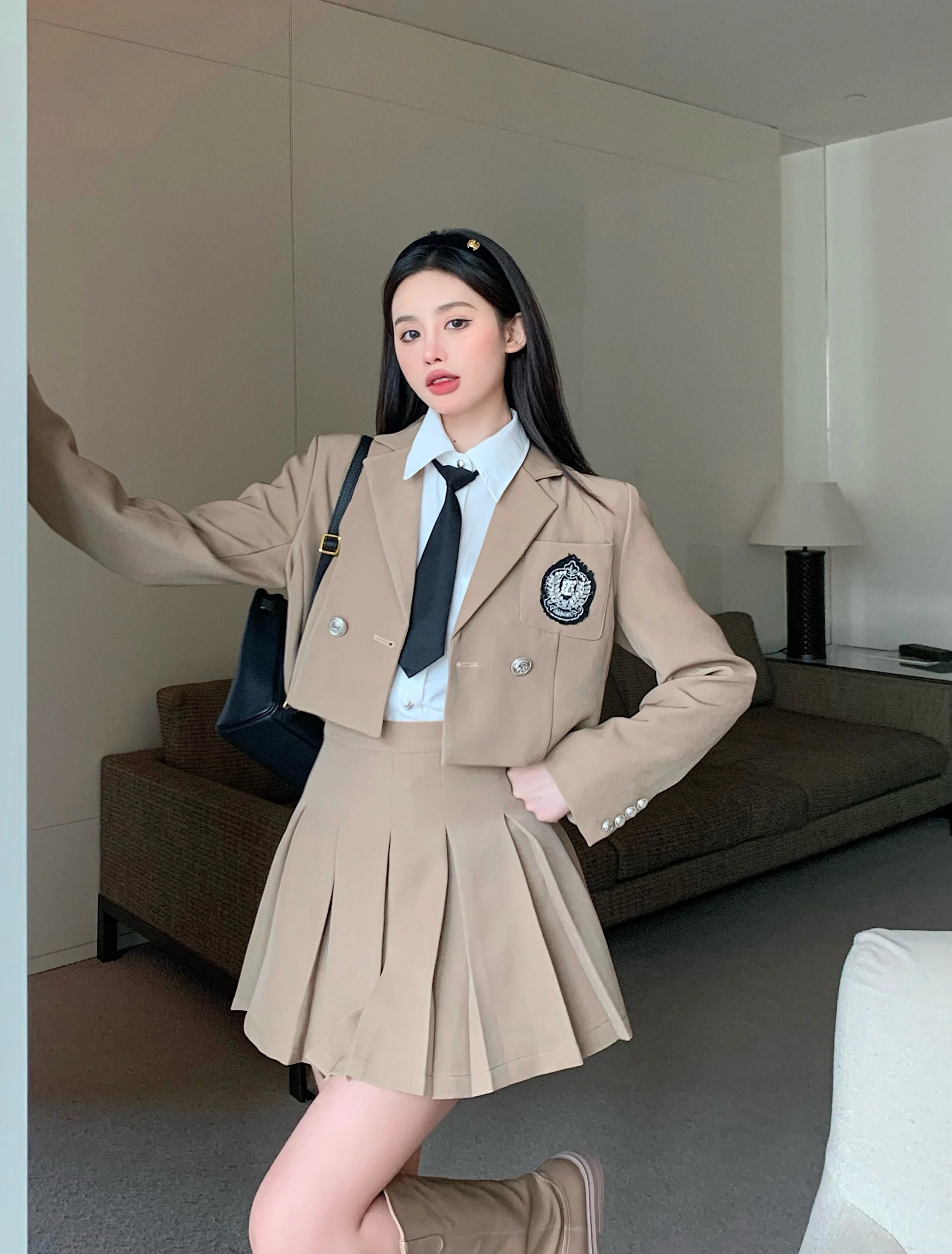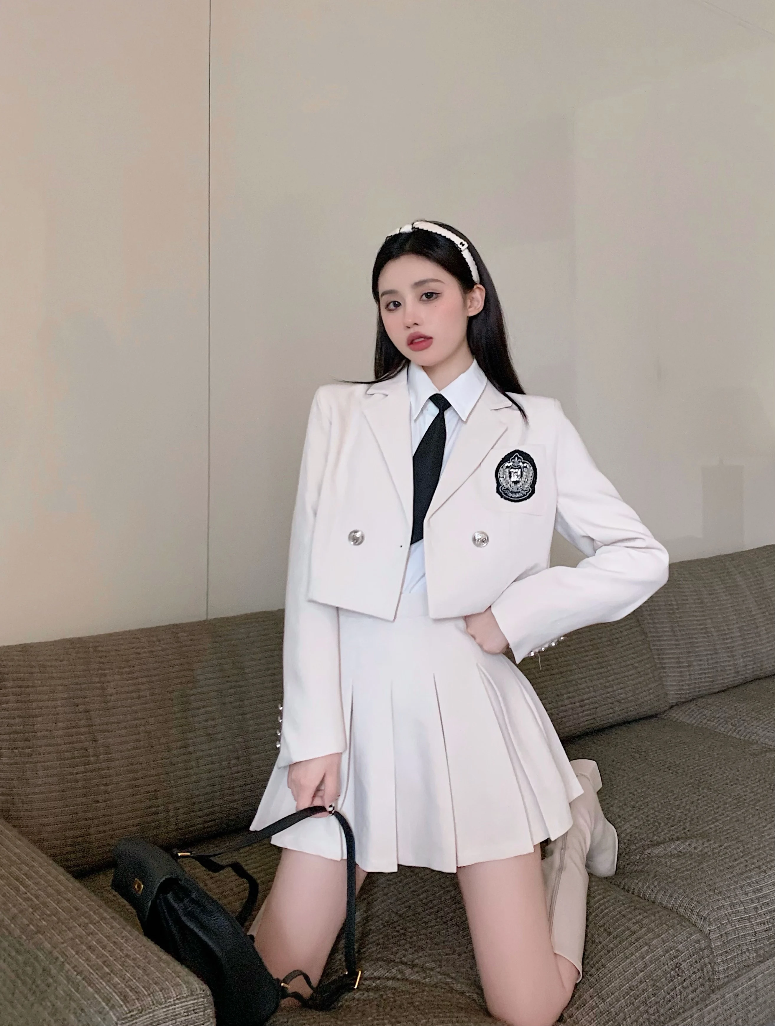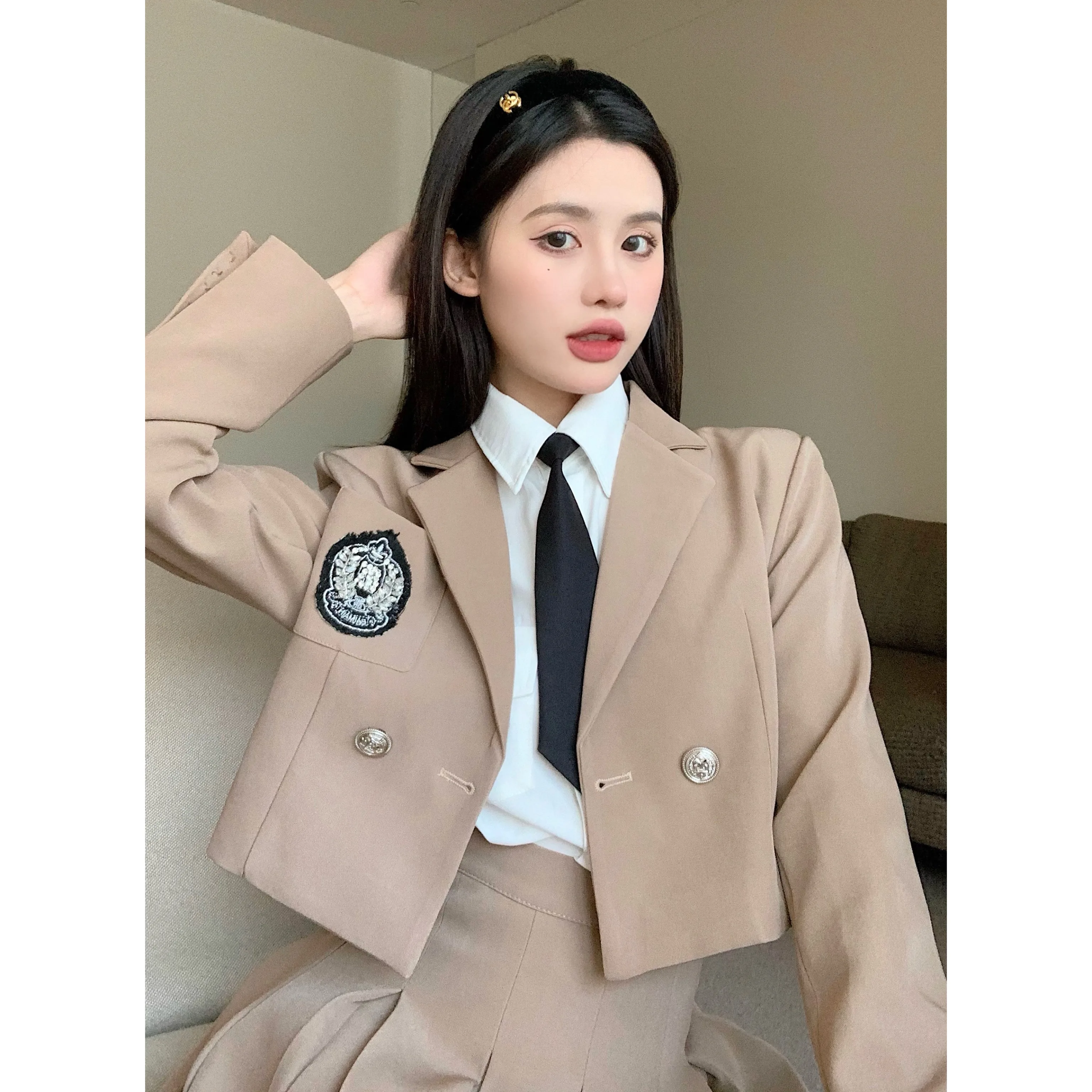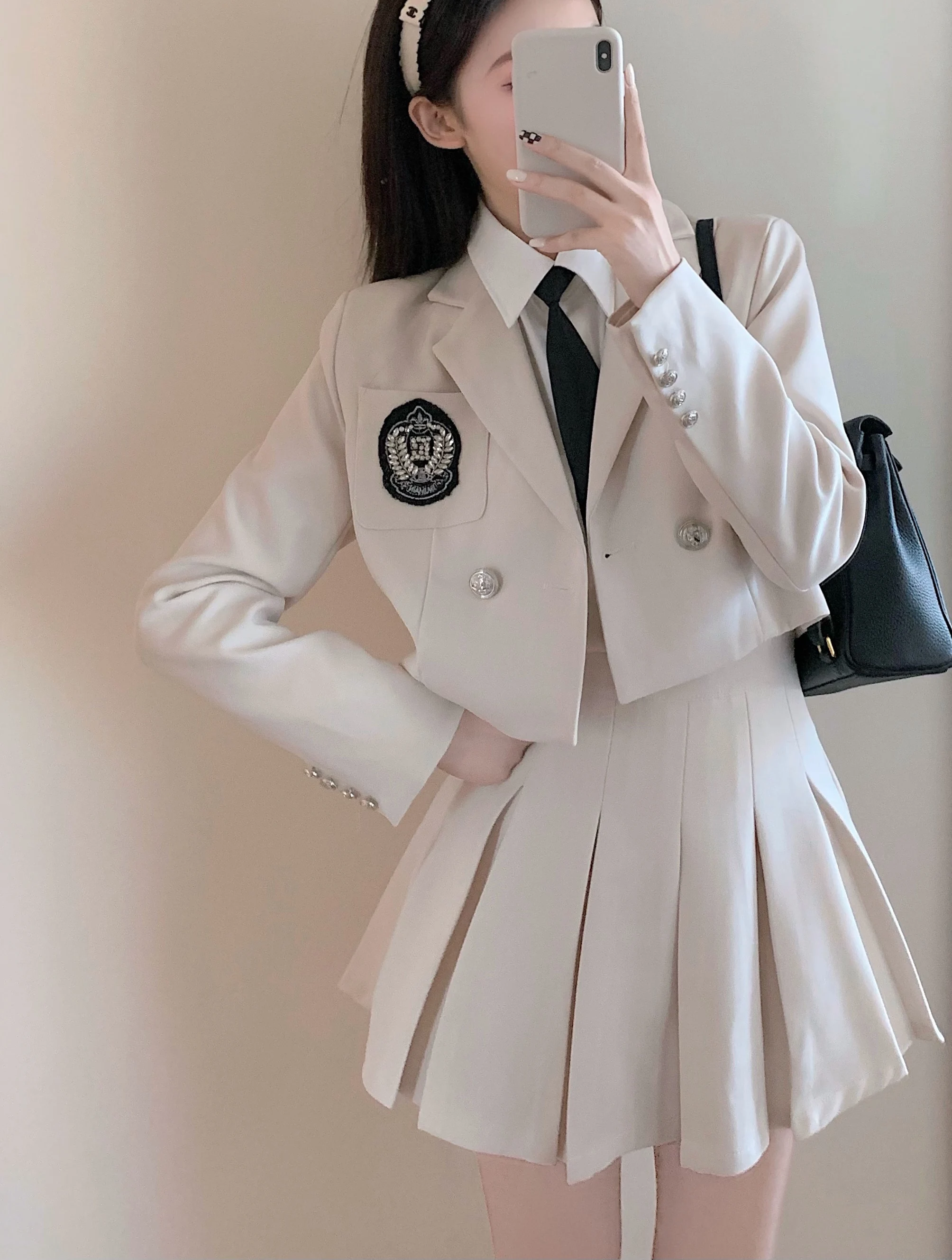 sixsr JK Blazer Skirt Set Female Short Suit Jacket + Pleated Skirt Spring Autumn Professional Wear Elegant Goddess Two-piece Set