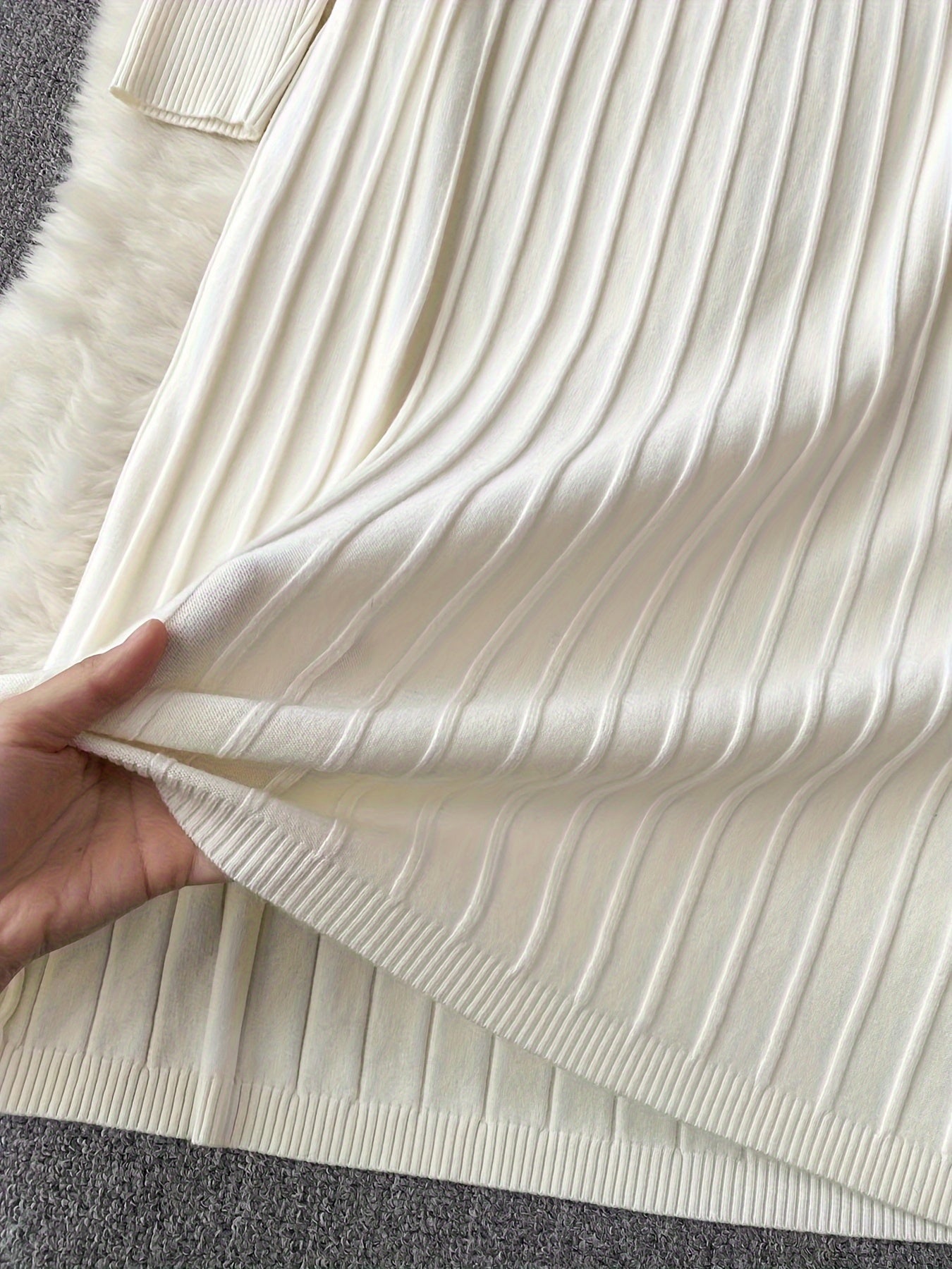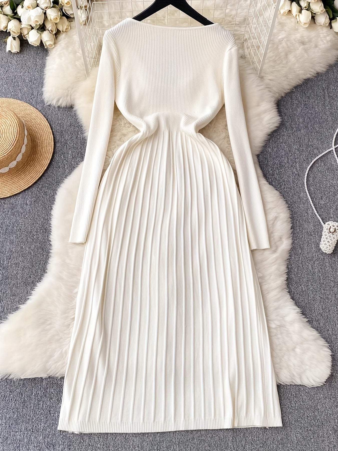 Sixsr Keyhole Ruched V Neck Knit Dress, Chic Long Sleeve Pleated Dress, Women's Clothing