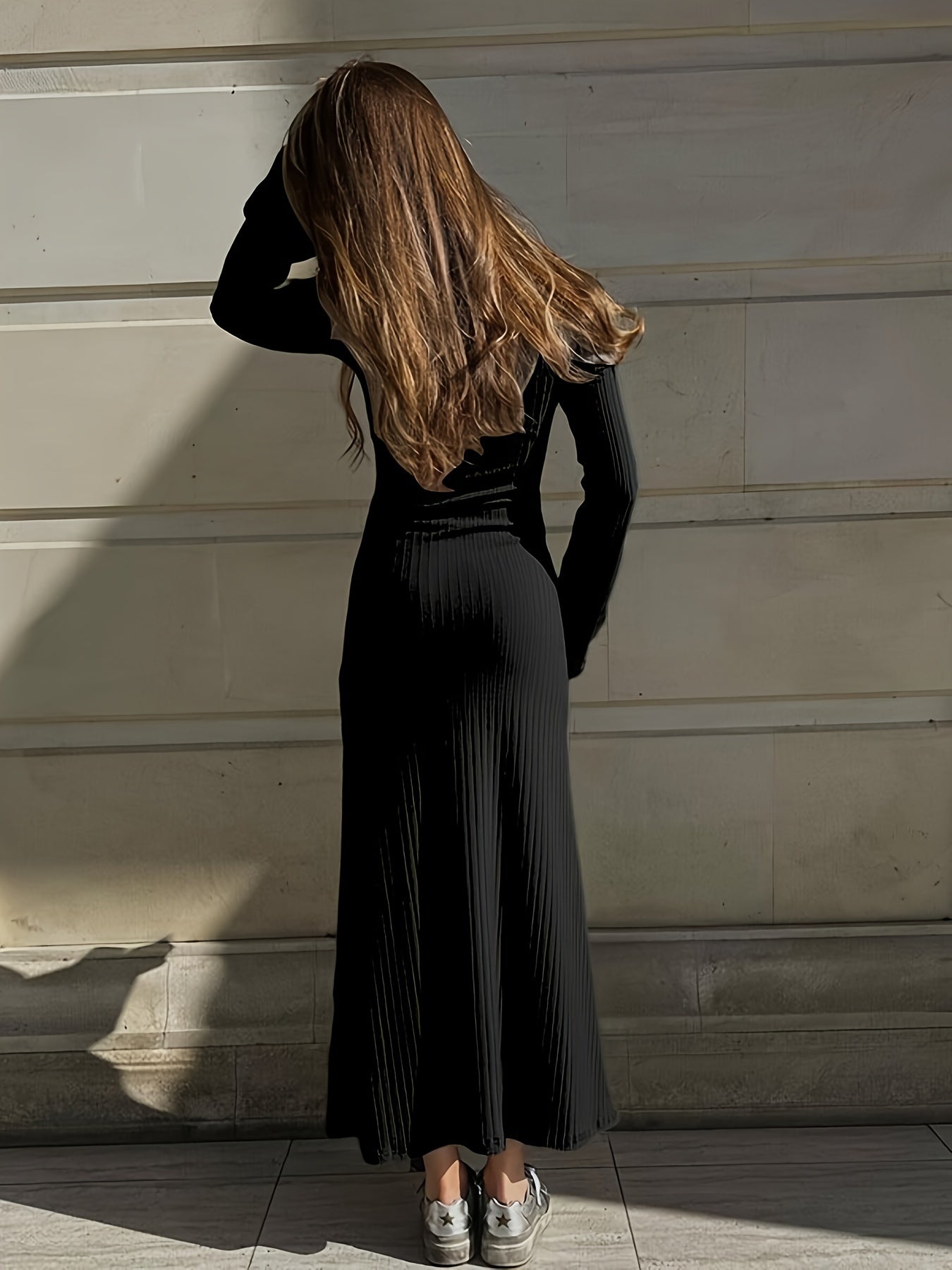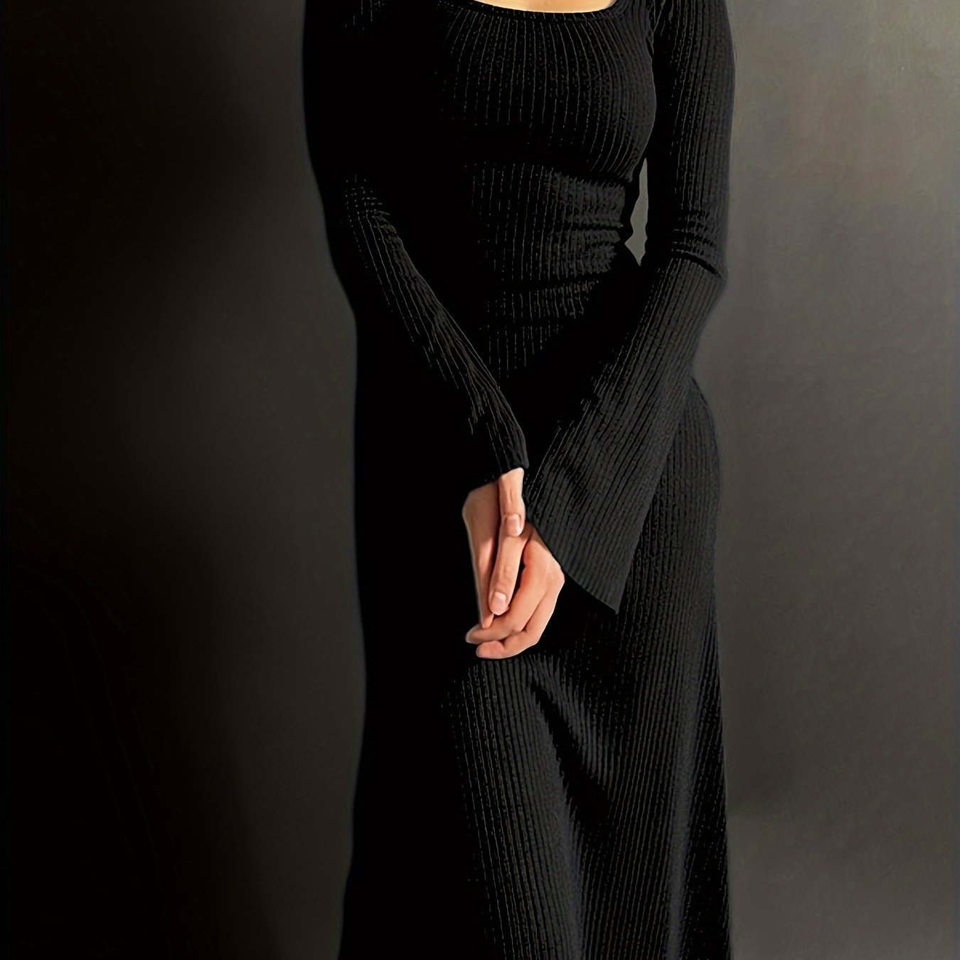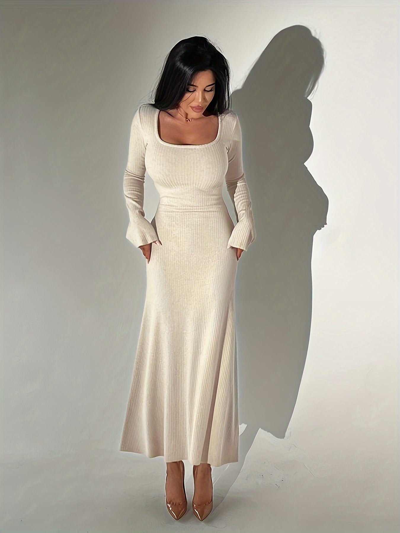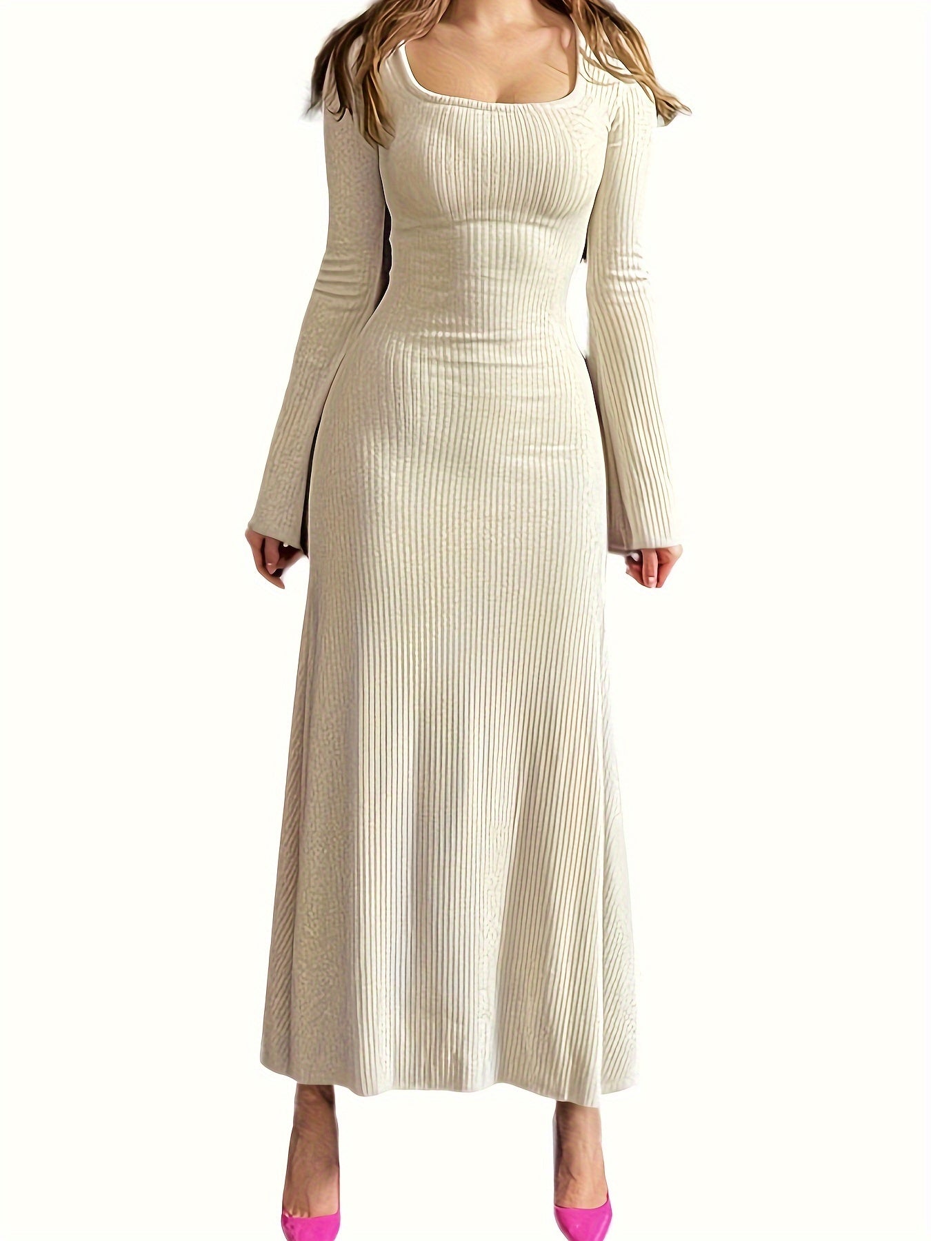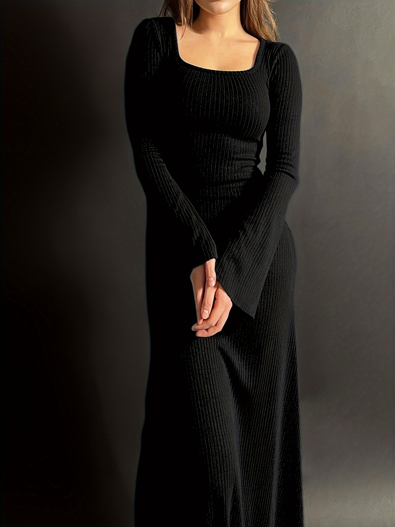 Sixsr Lettuce Trim Squared Neck Dress, Elegant Solid Long Sleeve Dress, Women's Clothing