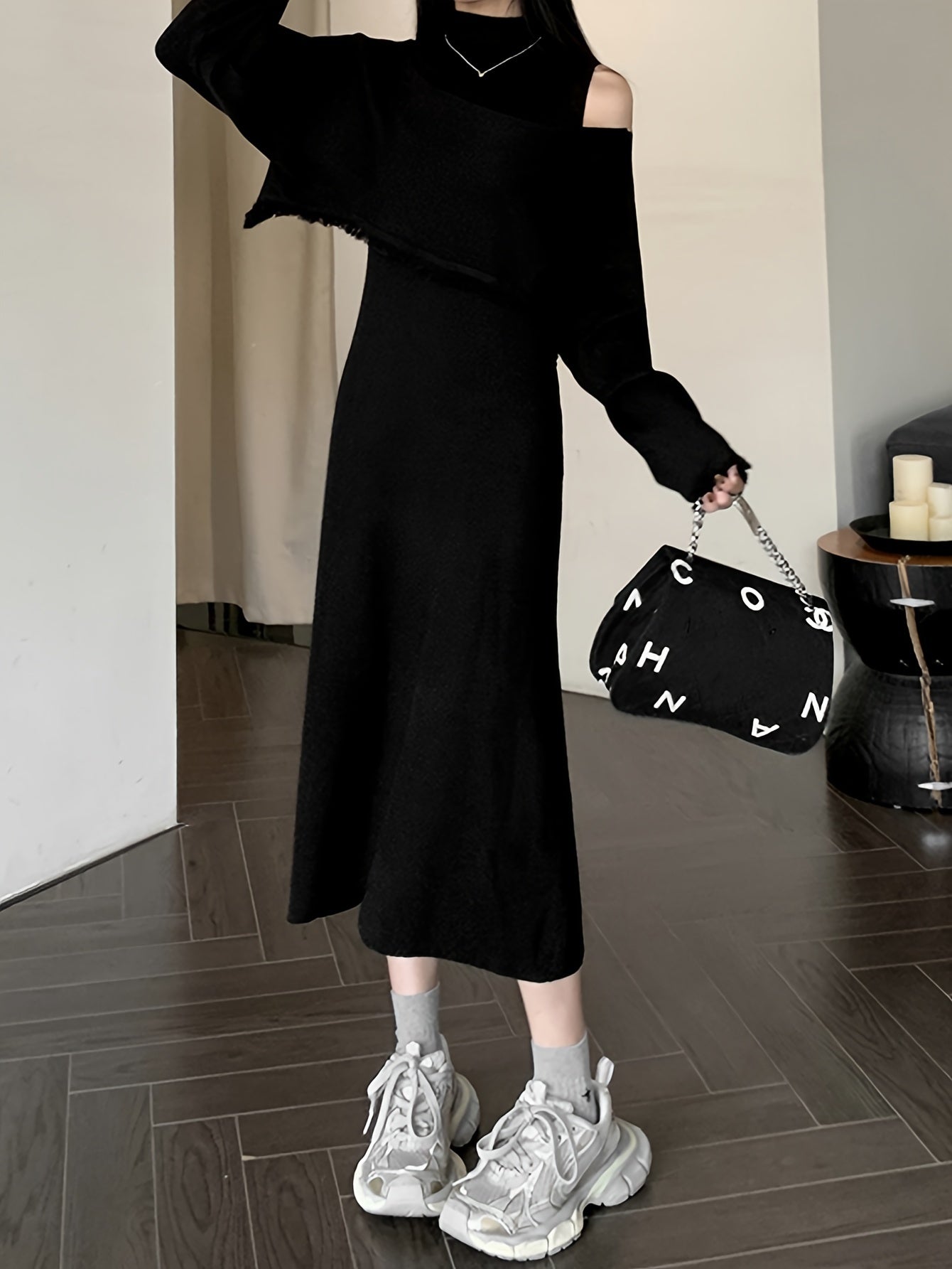 Sixsr Mock Neck Knit Tank Dress, Solid Sleeveless A-line Midi Length Tank Dress, Women's Clothing