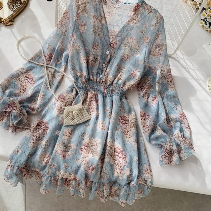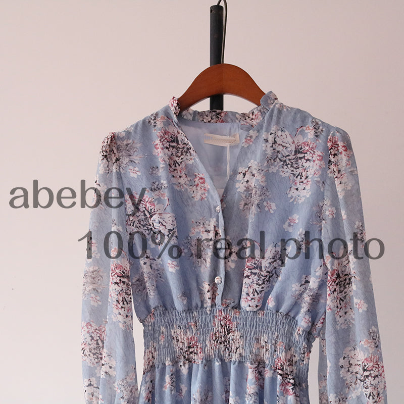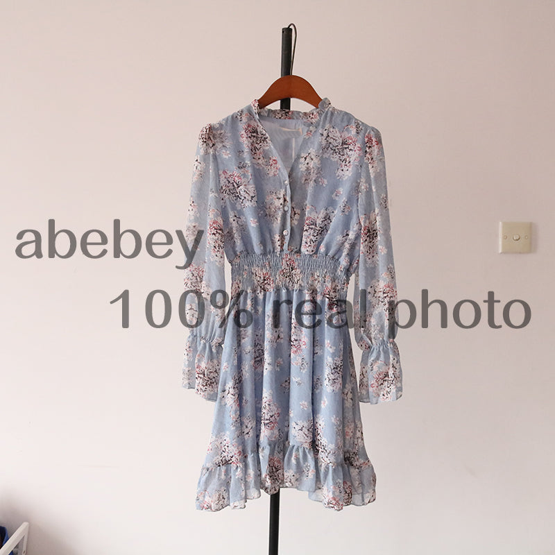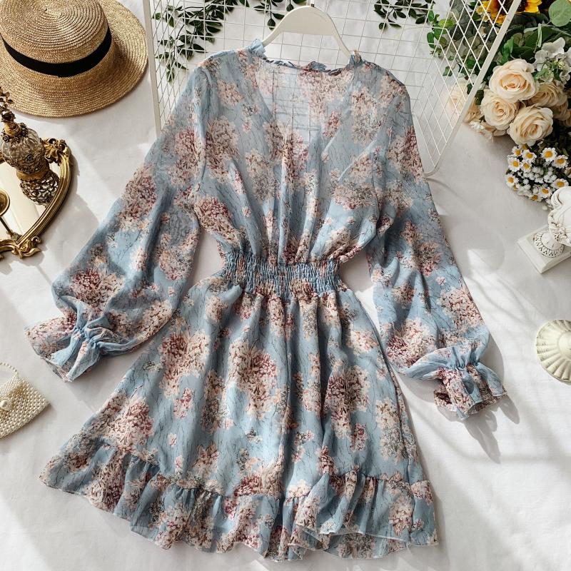 Sixsr Mothers Day Gifts new fashion women's French dress female temperament V-neck long-sleeved chiffon floral dresses