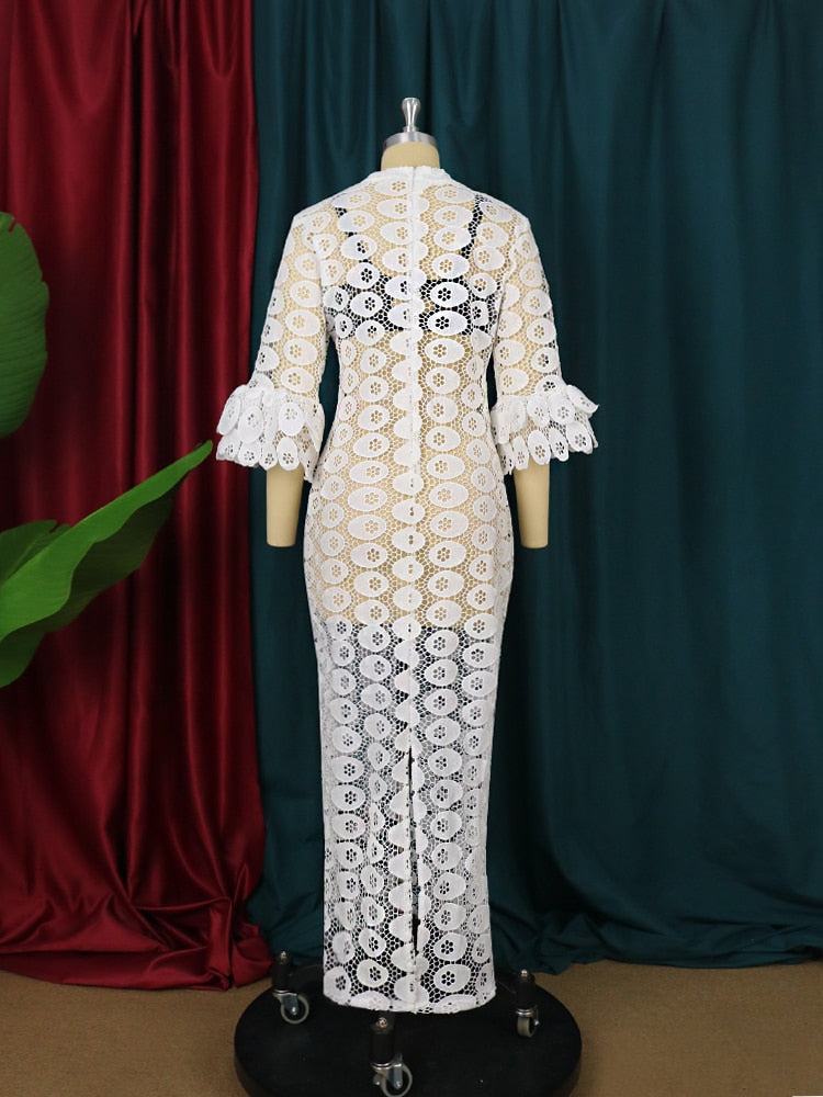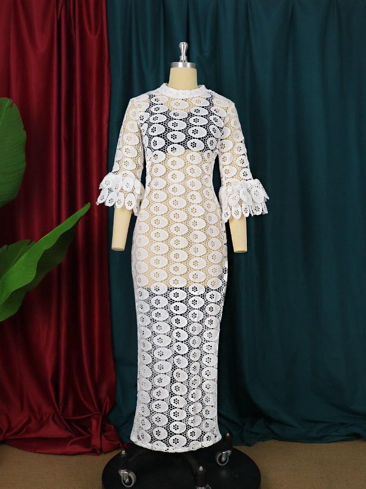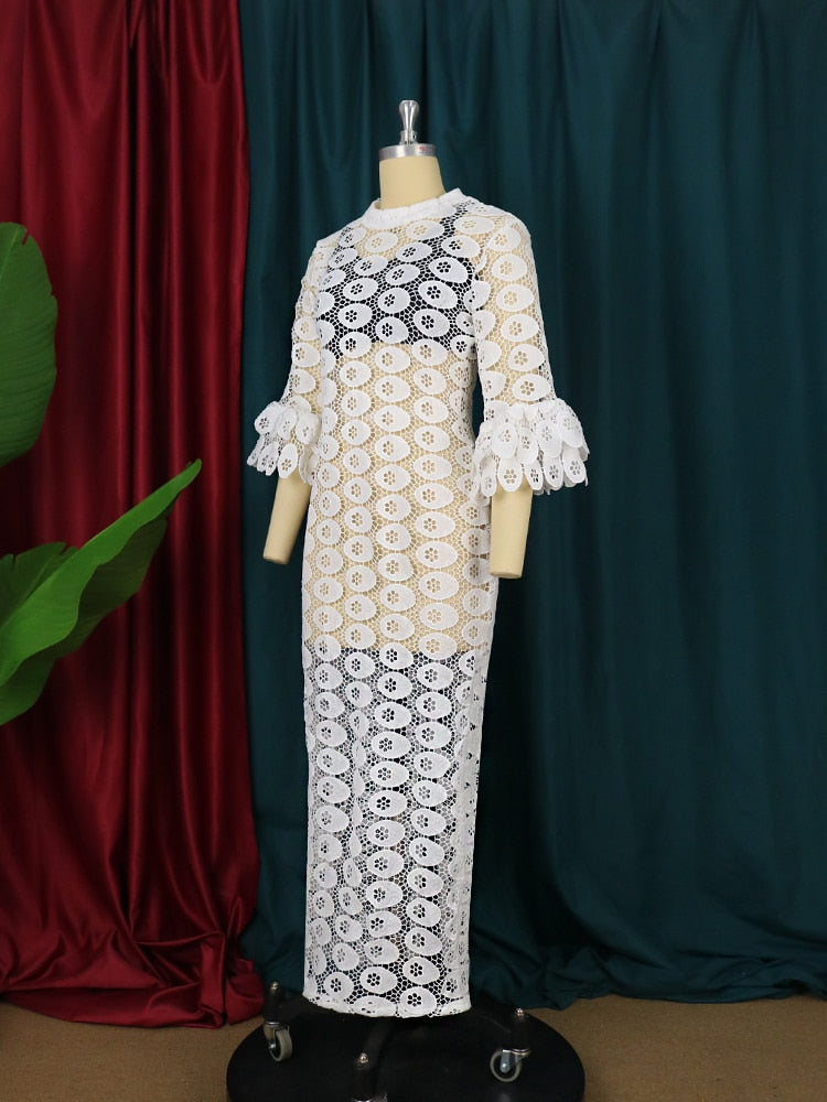Sixsr New Fashion African Women Dresses Dashiki Elegant Maxi Long White Lace Hollow Out Muslim Fashion Abayas Robe Abaya Dubai Luxe Party Clothes