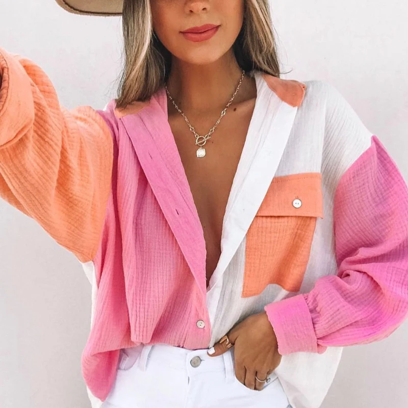 New Spring Summer Fashion Women New Patchwork Shirt Elegant Commute Contrast Lapel Buttons Cardigan Streetwear Ladies Casual Blouses