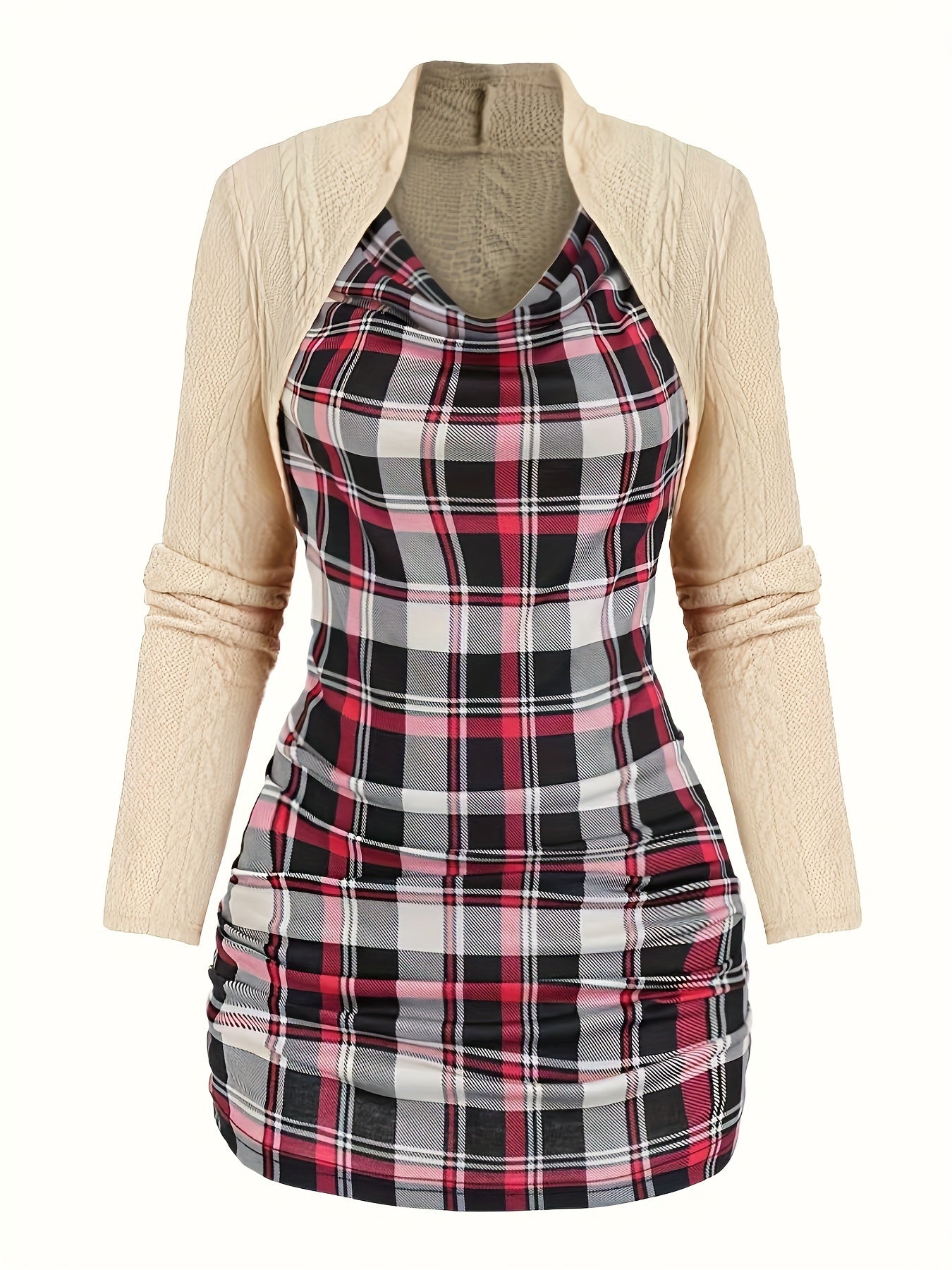 Sixsr Plaid Print Cowl Neck Pullover Sweater, Y2K Spliced Twist Long Sleeve Knitted Sweater For Every Day, Women's Clothing