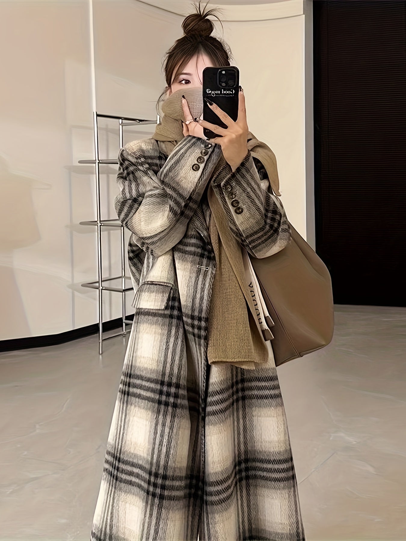 Sixsr Plaid Print Double-breasted Coat, Casual Long Sleeve Notched Collar Coat For Fall & Winter, Women's Clothing