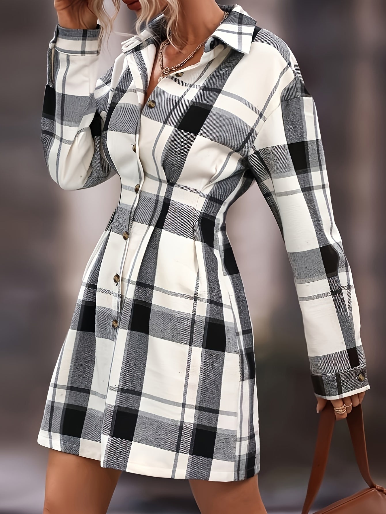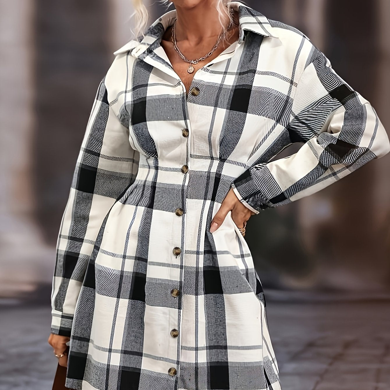 Sixsr Plaid Print Shirt Dress, Casual Button Front Long Sleeve Dress, Women's Clothing