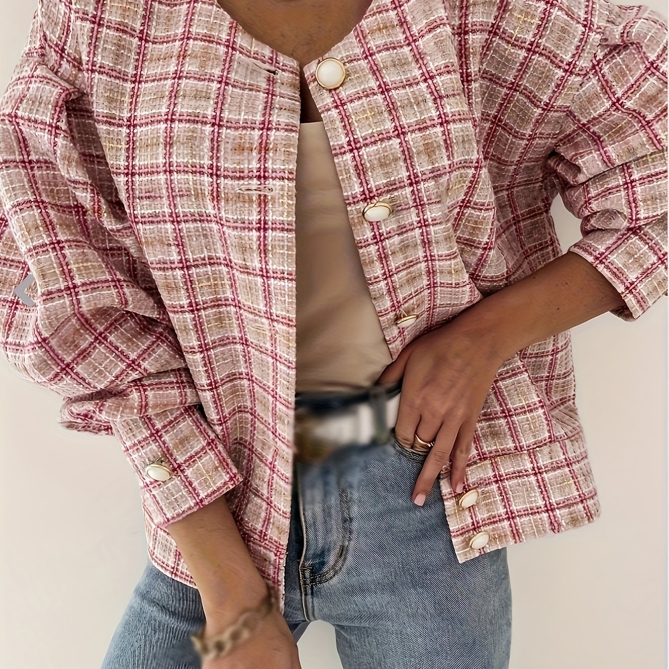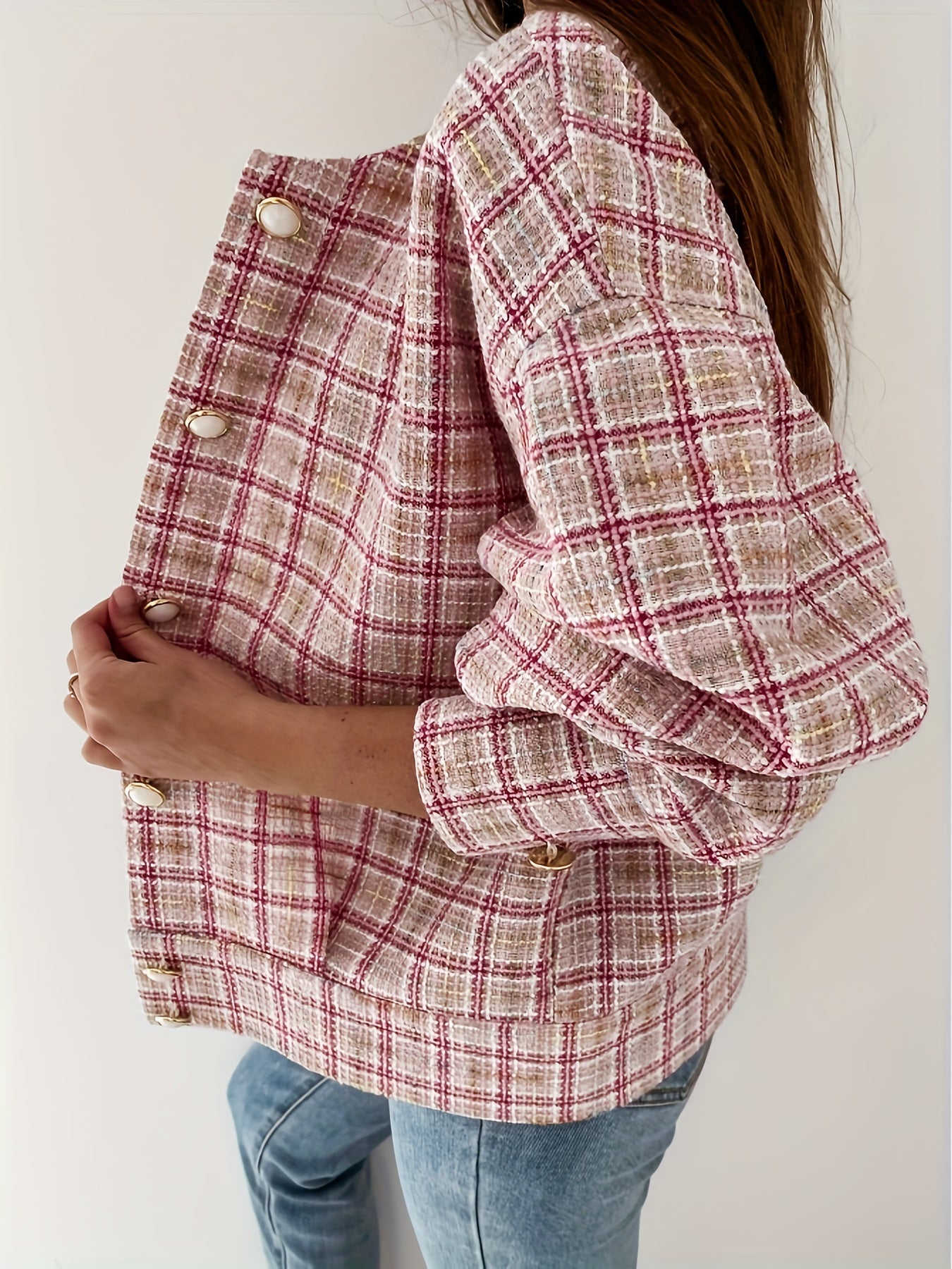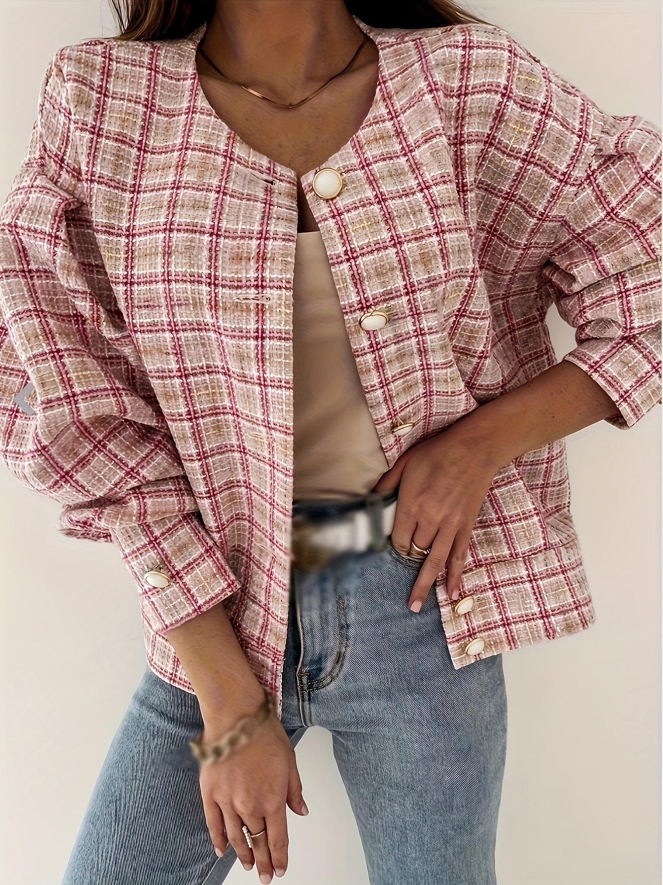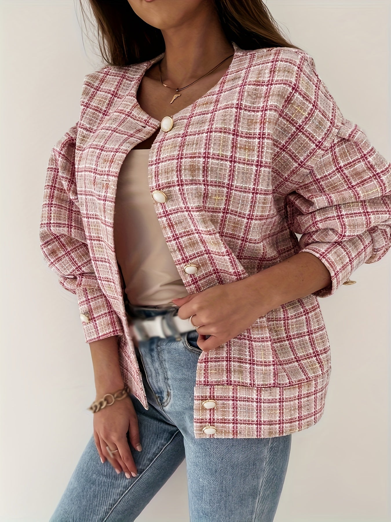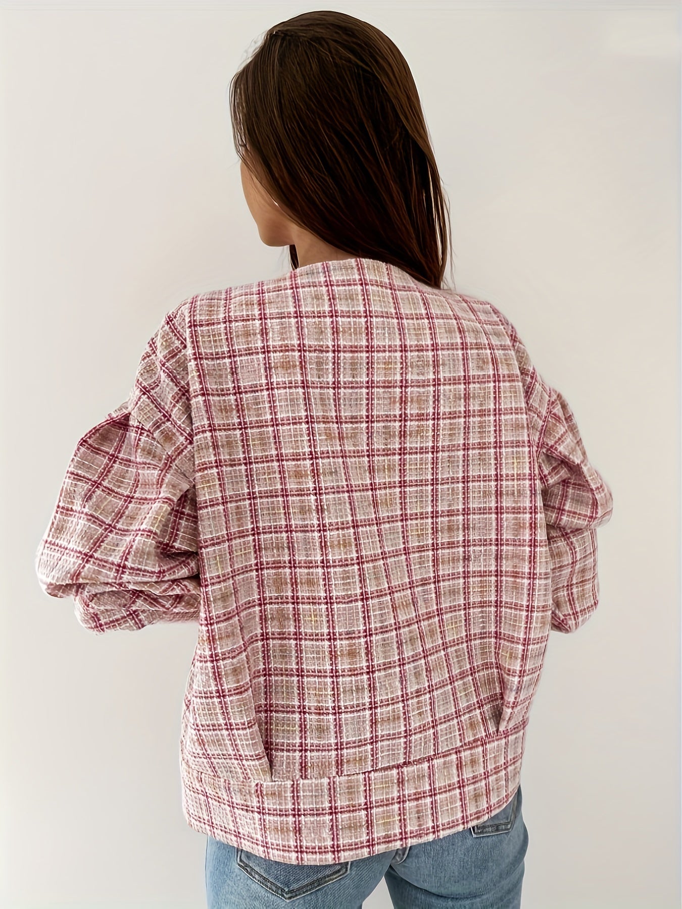 Sixsr Plaid Print Simple Jacket, Casual Button Front Long Sleeve Outerwear, Women's Clothing