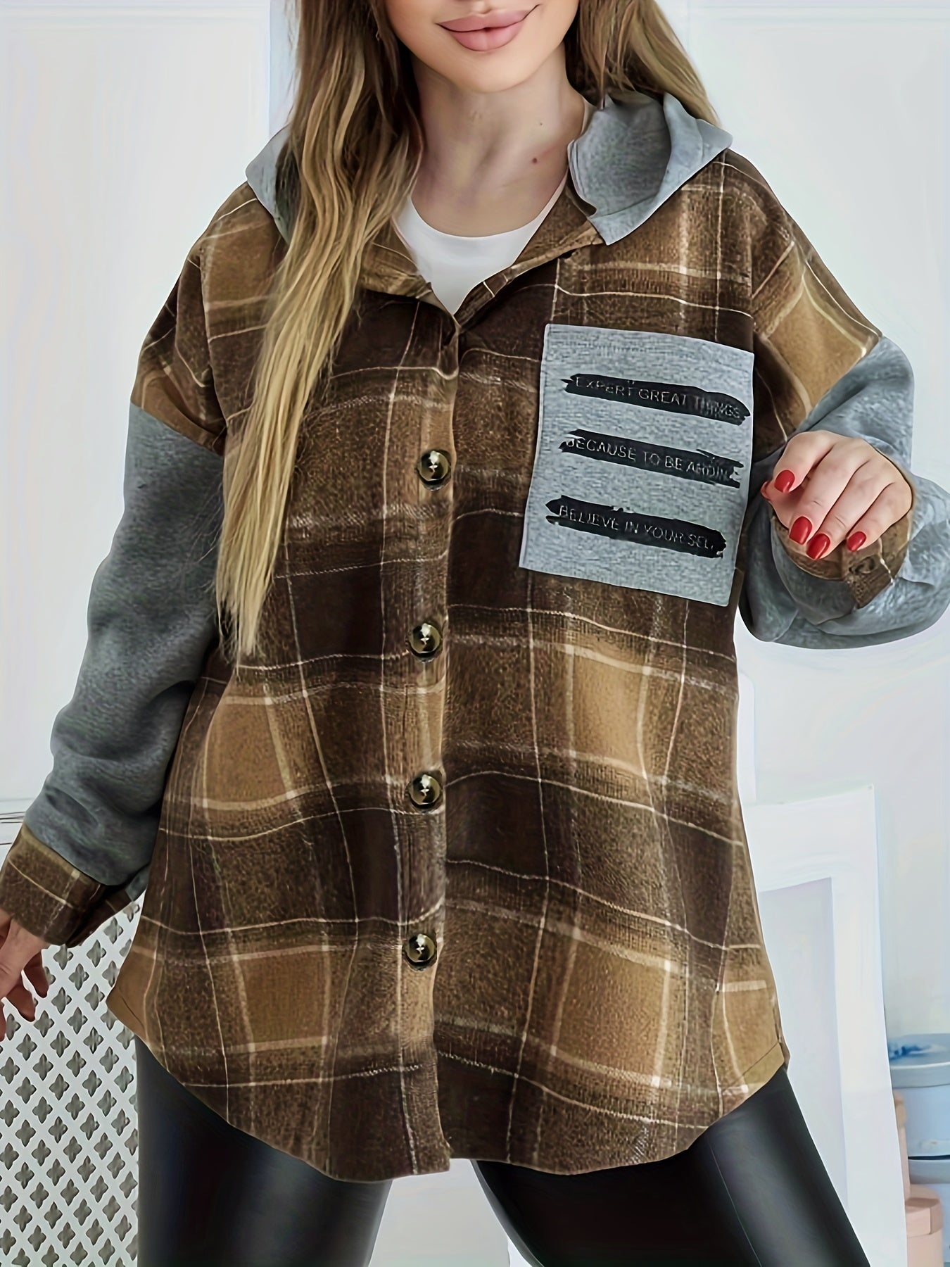 Sixsr Plus Size Casual Coat, Women's Plus Colorblock Plaid & Letter Print Button Up Long Sleeve Hoodie Shirt Coat