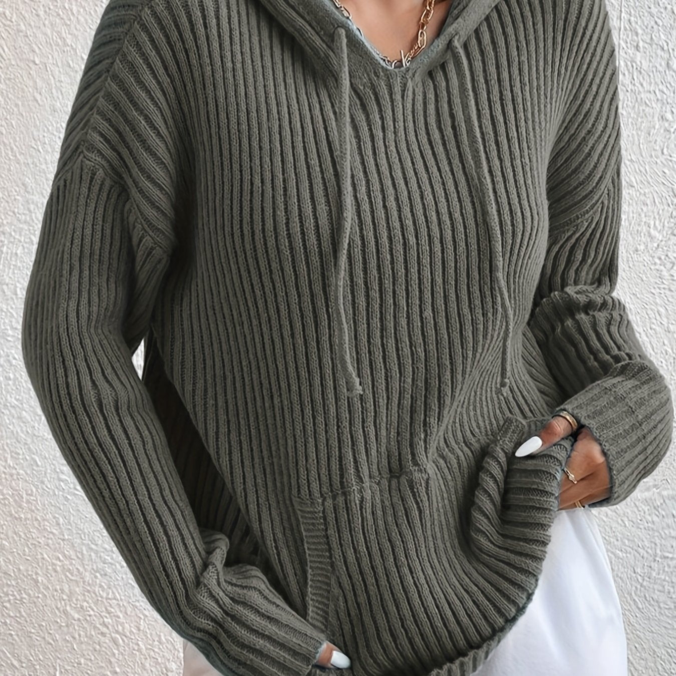 Sixsr Plus Size Casual Knit Top, Women's Plus Solid Ribbed Long Sleeve Drawstring Hooded Knit Top