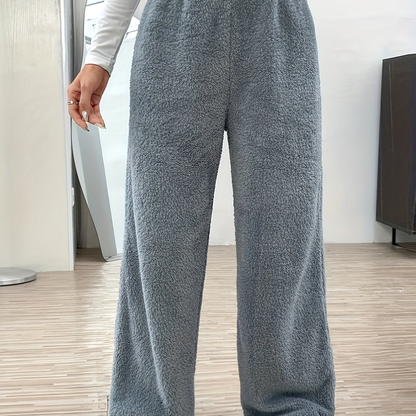 Sixsr Plus Size Casual Pants, Women's Plus Solid Teddy Fleece Elastic High Rise Slight Stretch Wide Leg Trousers