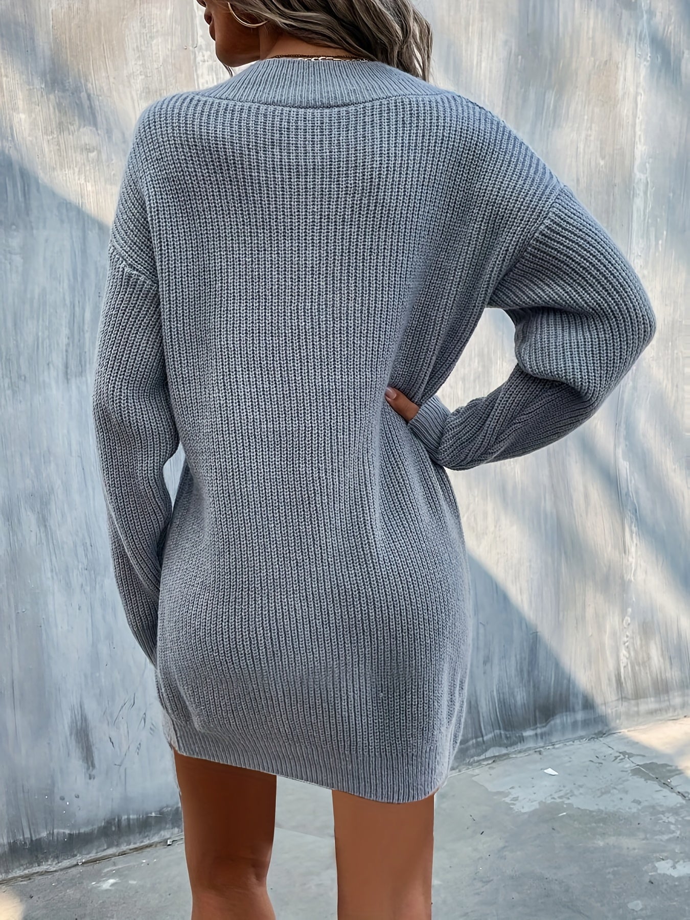 Sixsr Plus Size Casual Sweater Dress, Women's Plus Solid V Neck Long Sleeve High Stretch Mini Knit Dress