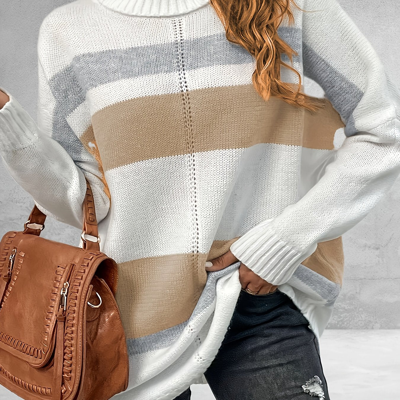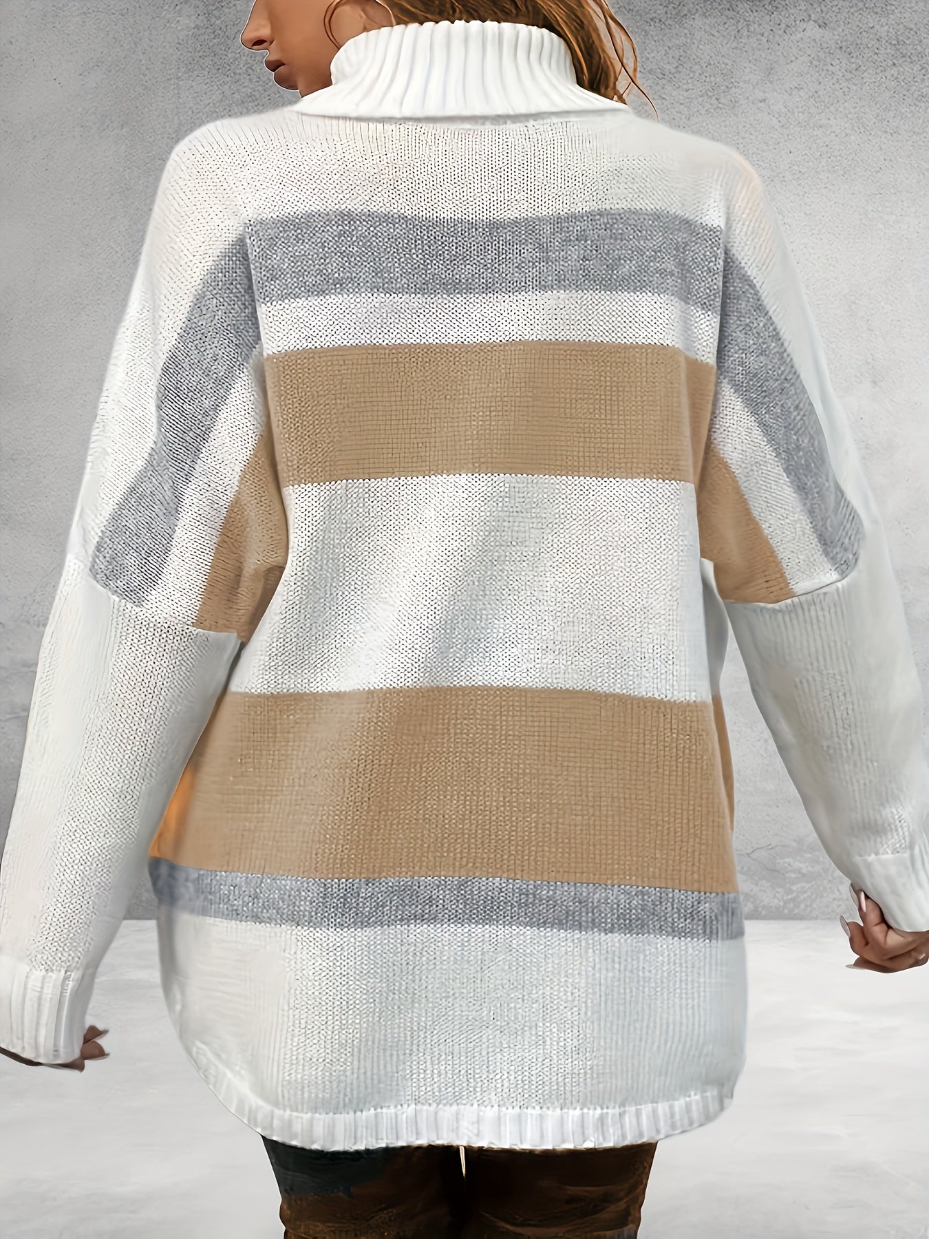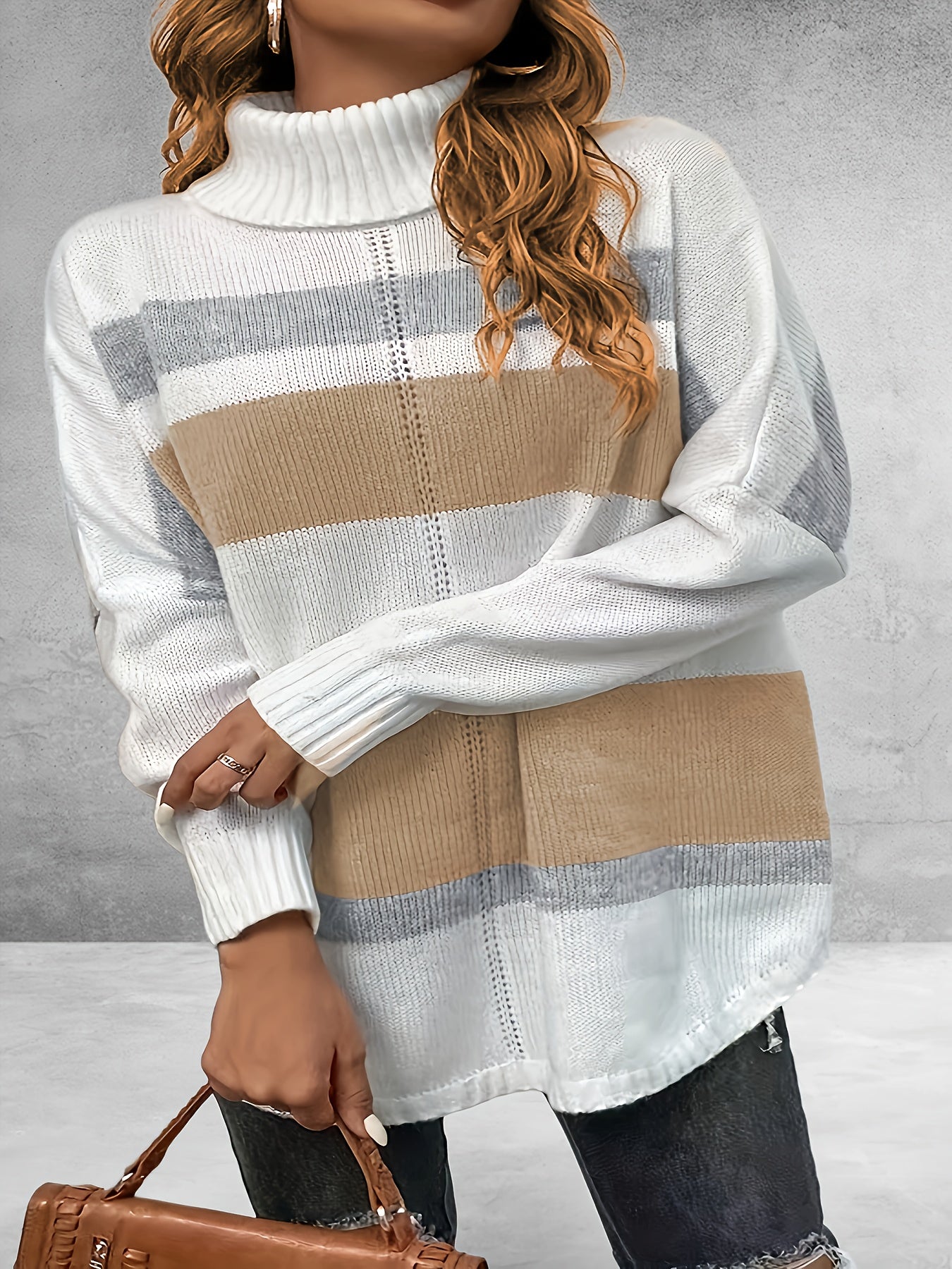 Sixsr Plus Size Casual Sweater, Women's Plus Colorblock Long Sleeve Turtle Neck Slight Stretch Sweater