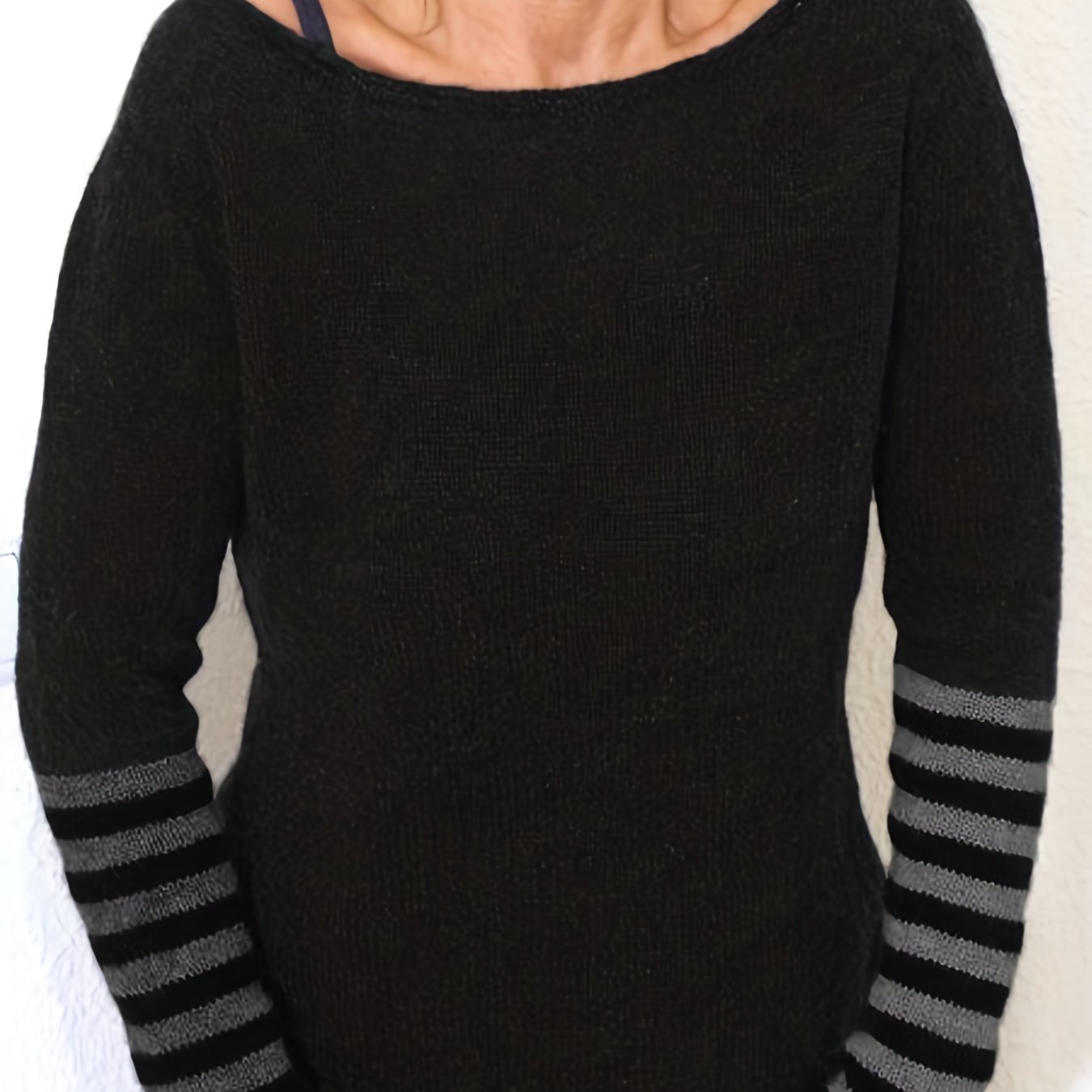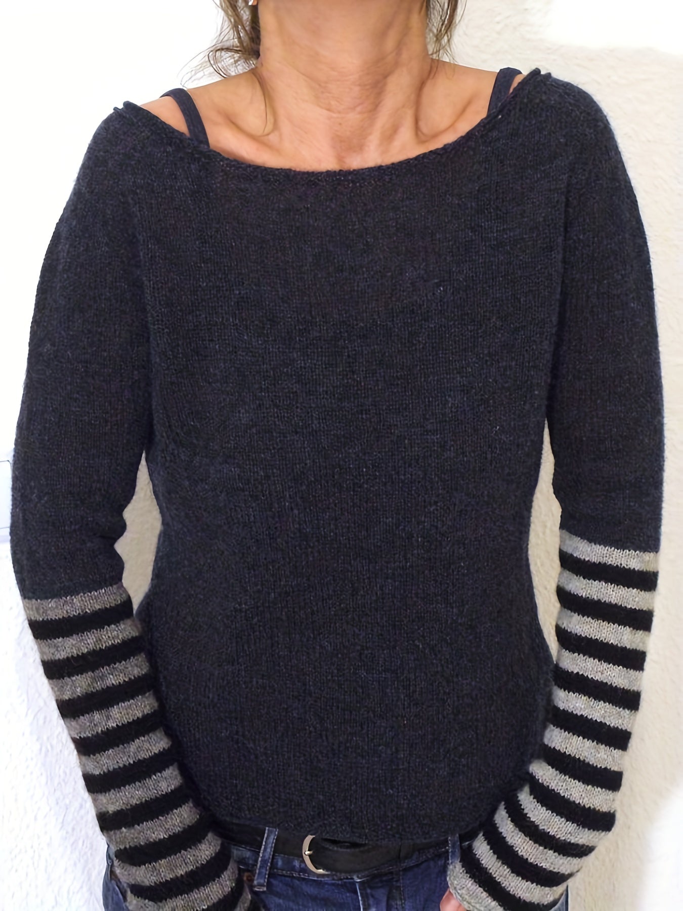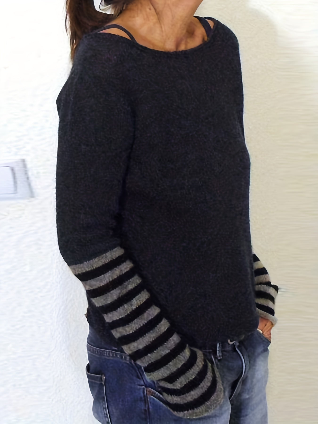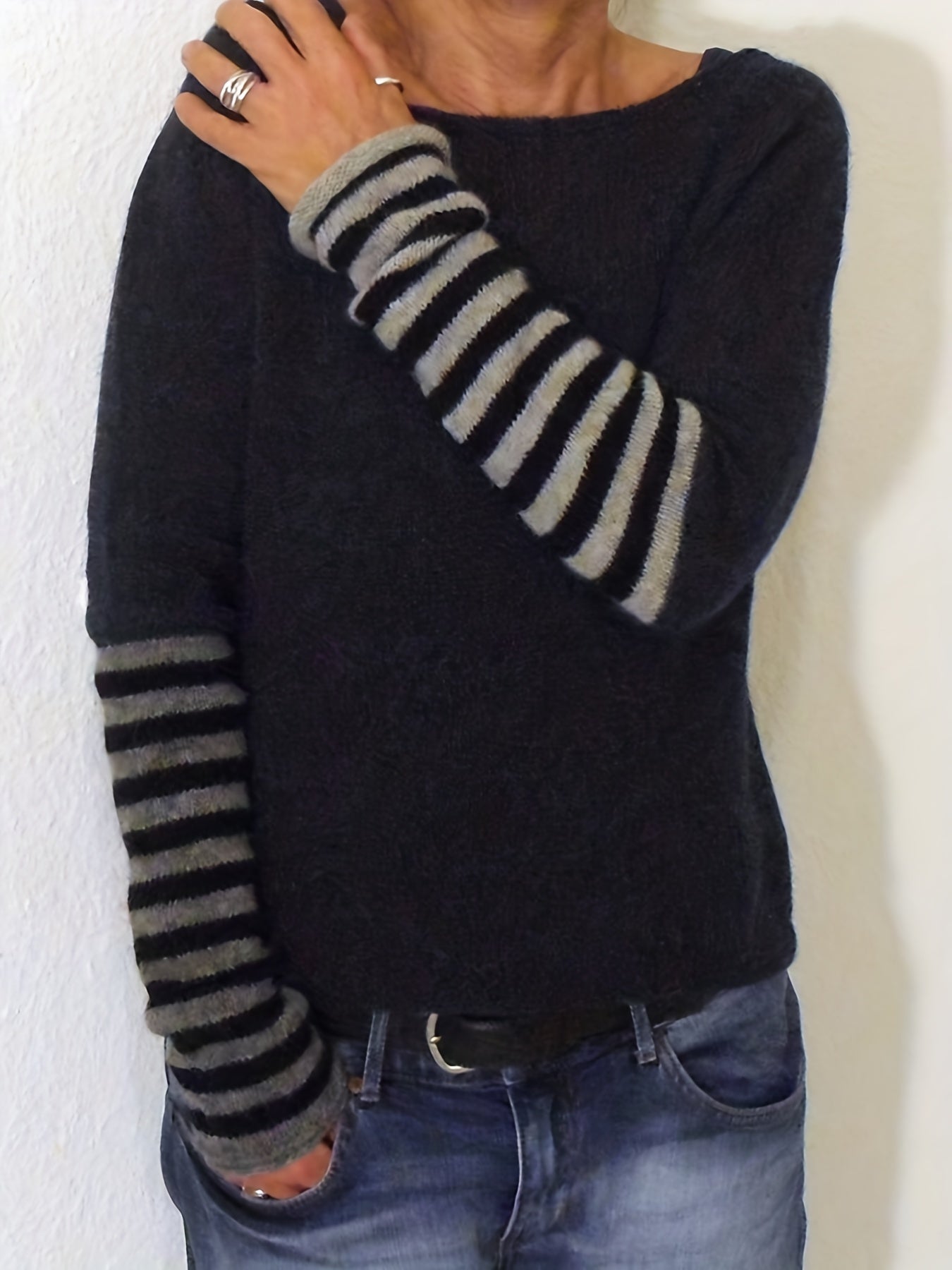 Sixsr Plus Size Casual Sweater, Women's Plus Colorblock Stripe Print Long Sleeve Boat Neck Sweater
