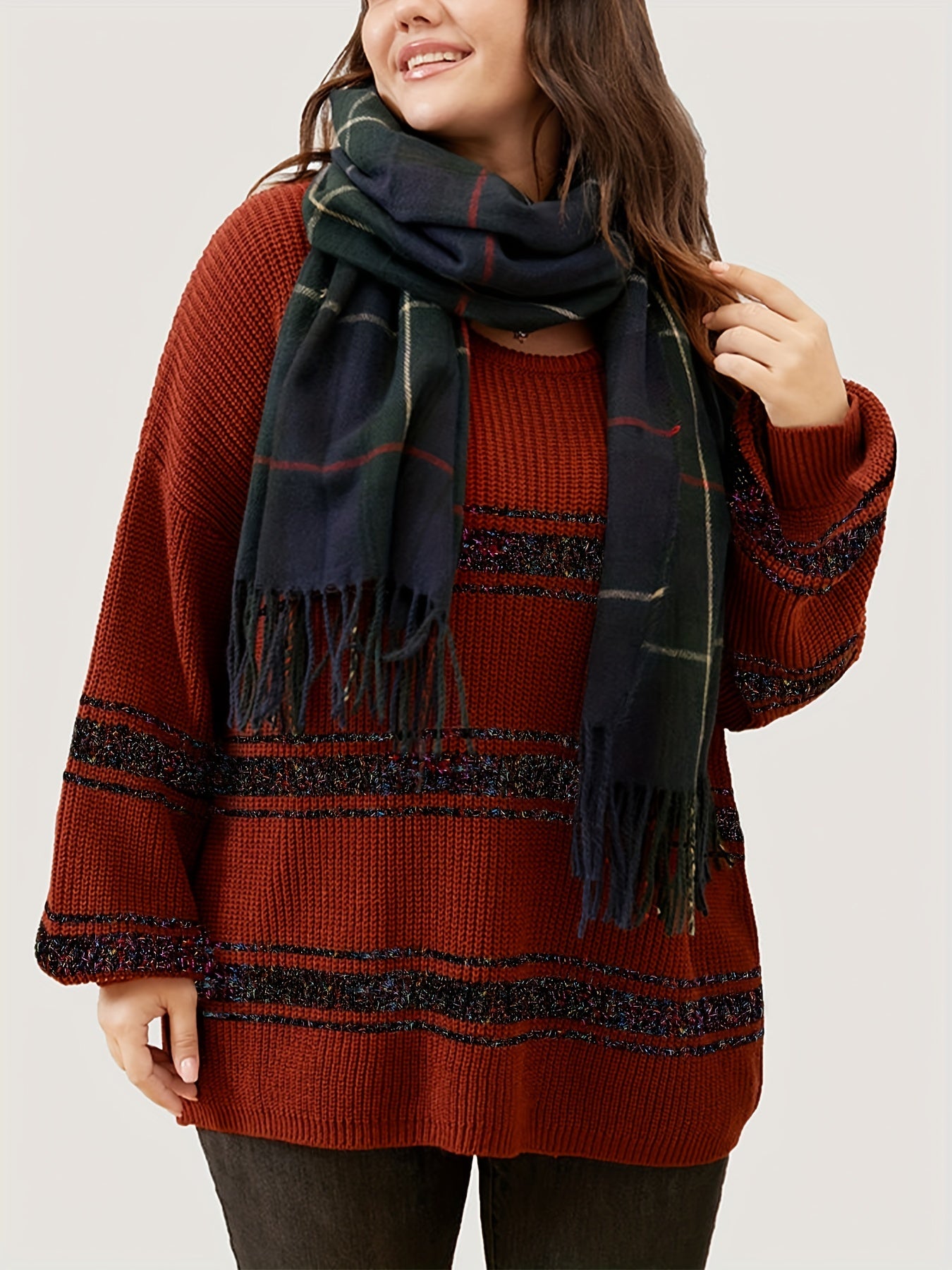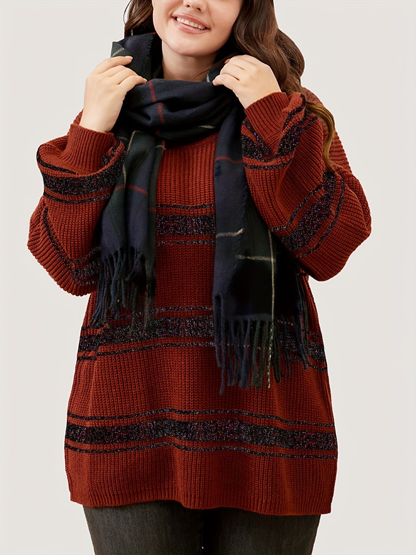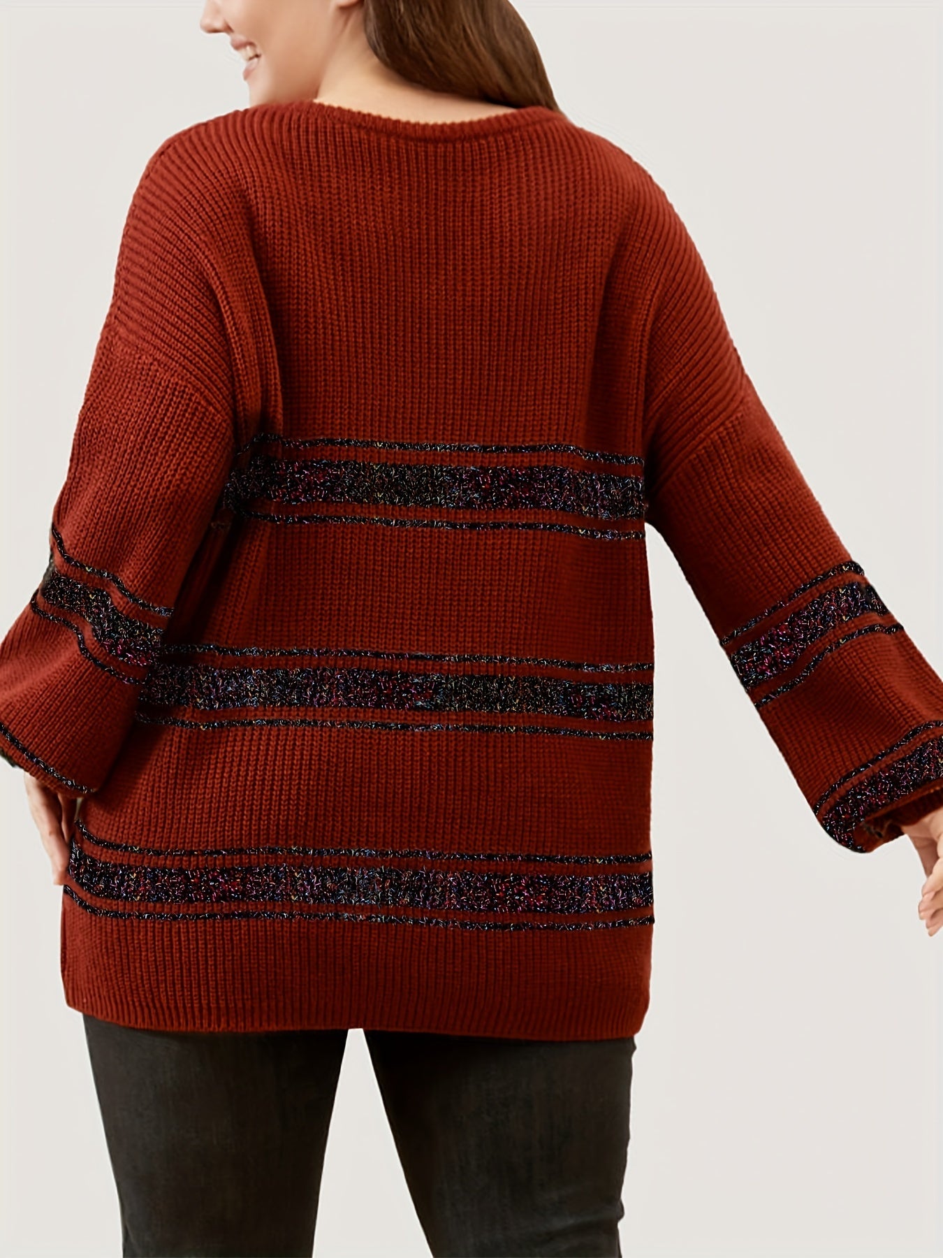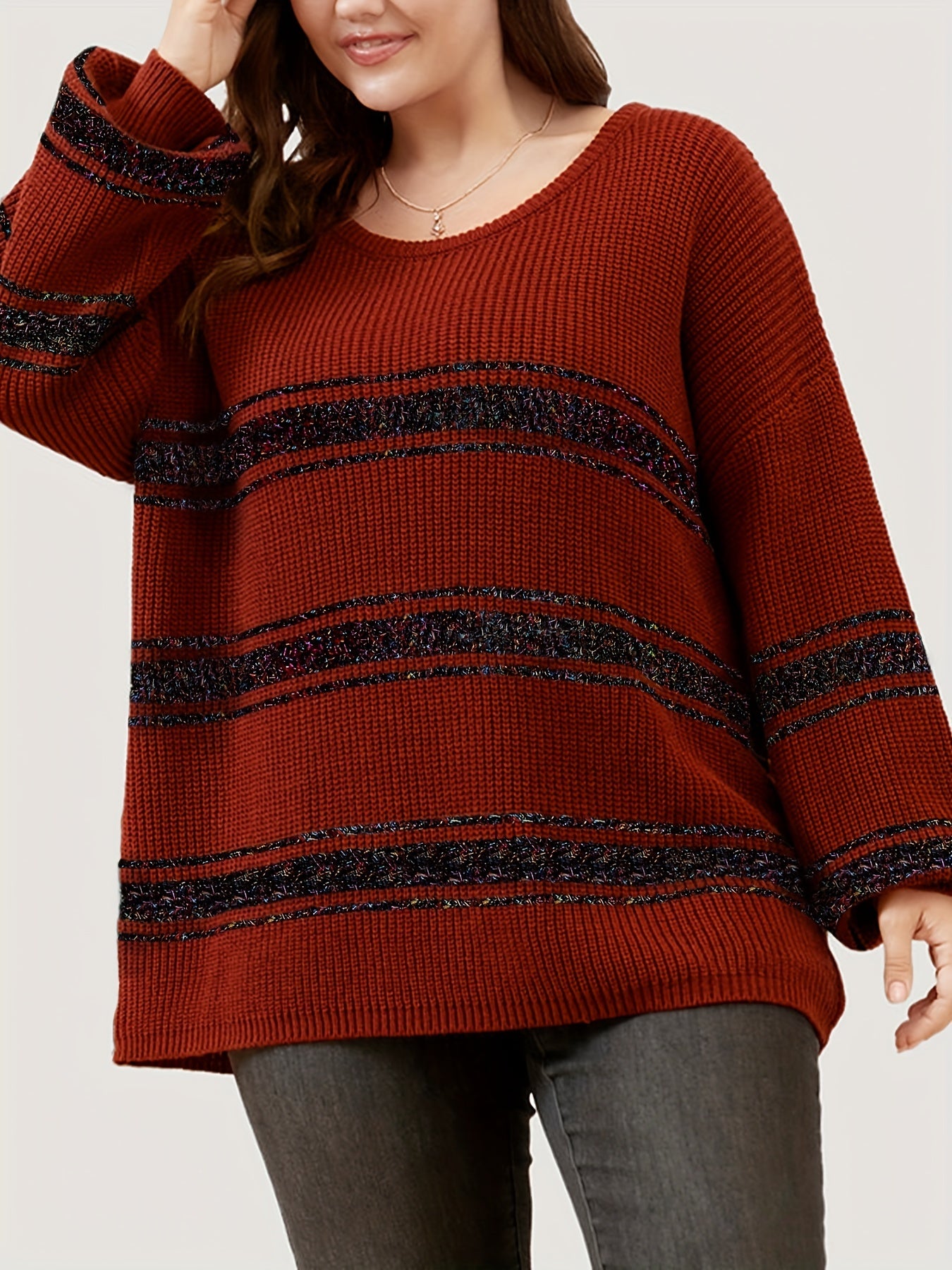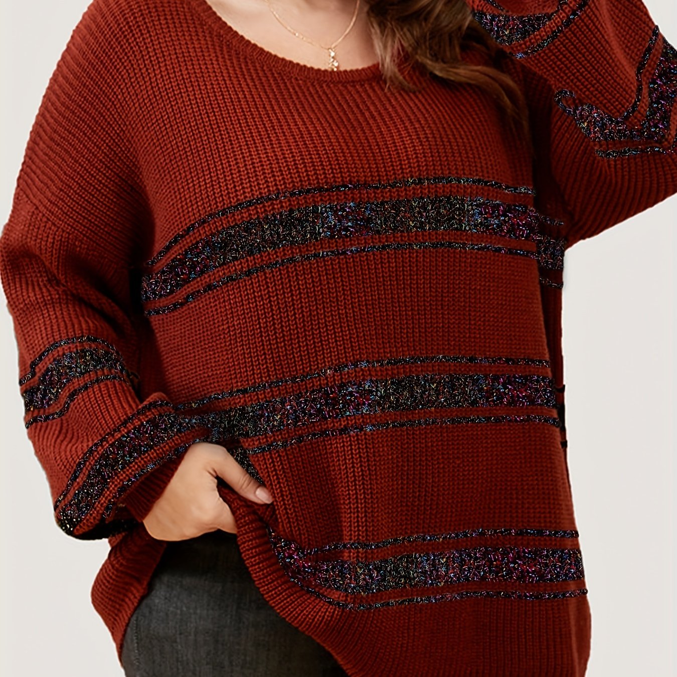 Sixsr Plus Size Casual Sweater, Women's Plus Colorblock Striped Sequin Lantern Sleeve Round Neck Pullover Sweater