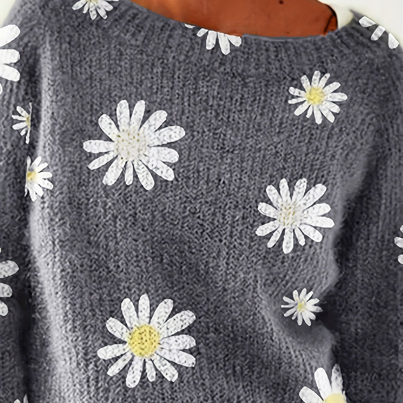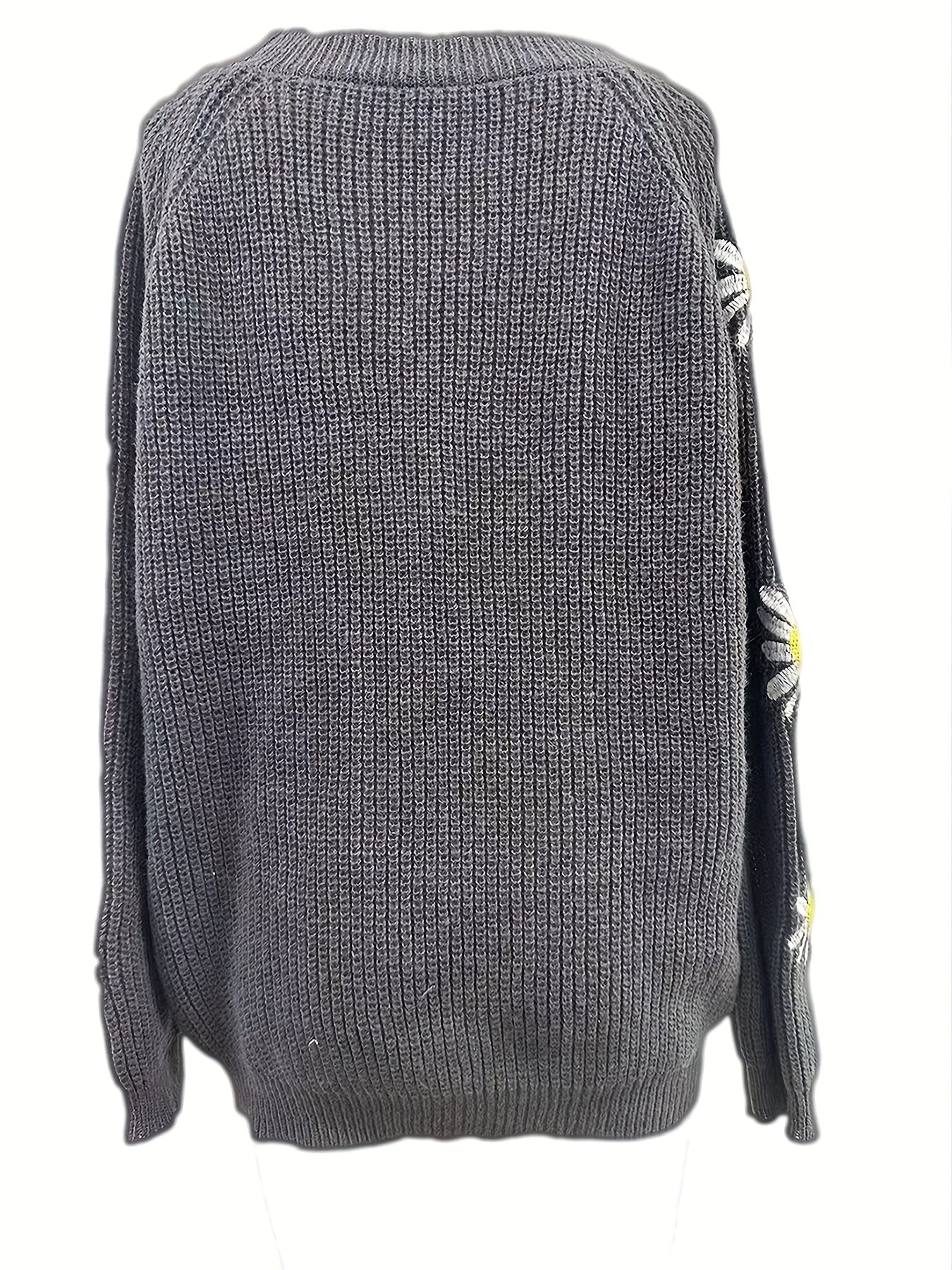 Sixsr Plus Size Casual Sweater, Women's Plus Floral Embroidery Long Sleeve Round Neck Slight Stretch Sweater