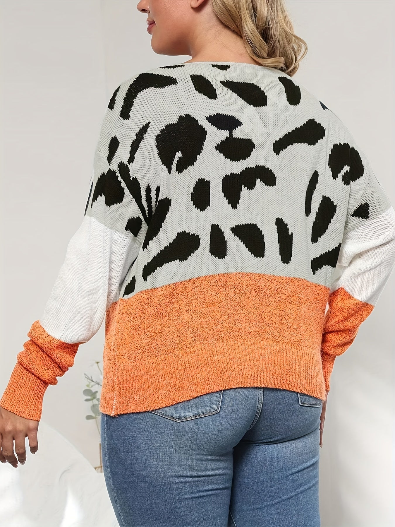 Sixsr Plus Size Casual Sweater, Women's Plus Graphic Print Drop Shoulder Long Sleeve Round Neck Medium Stretch Sweater