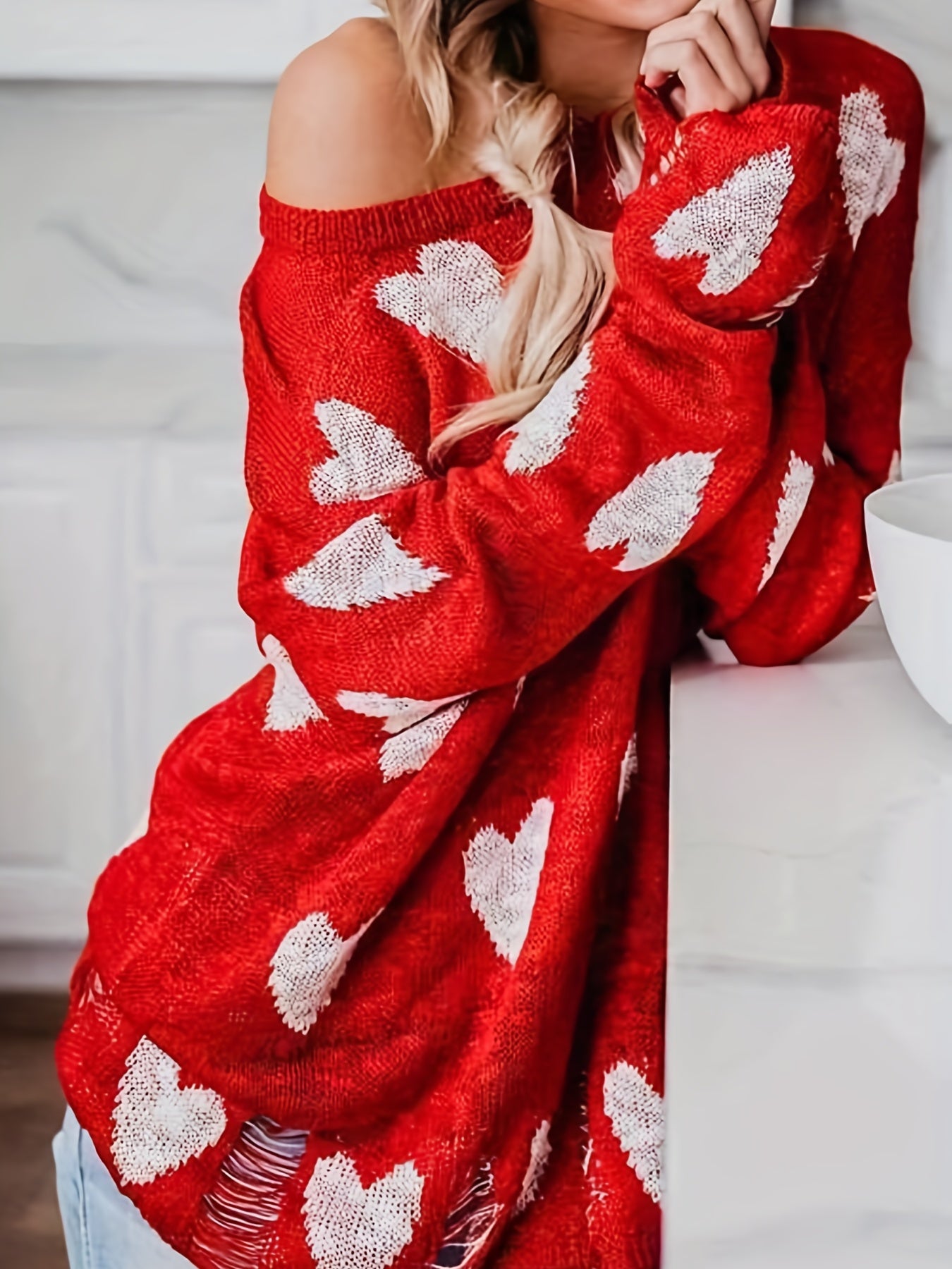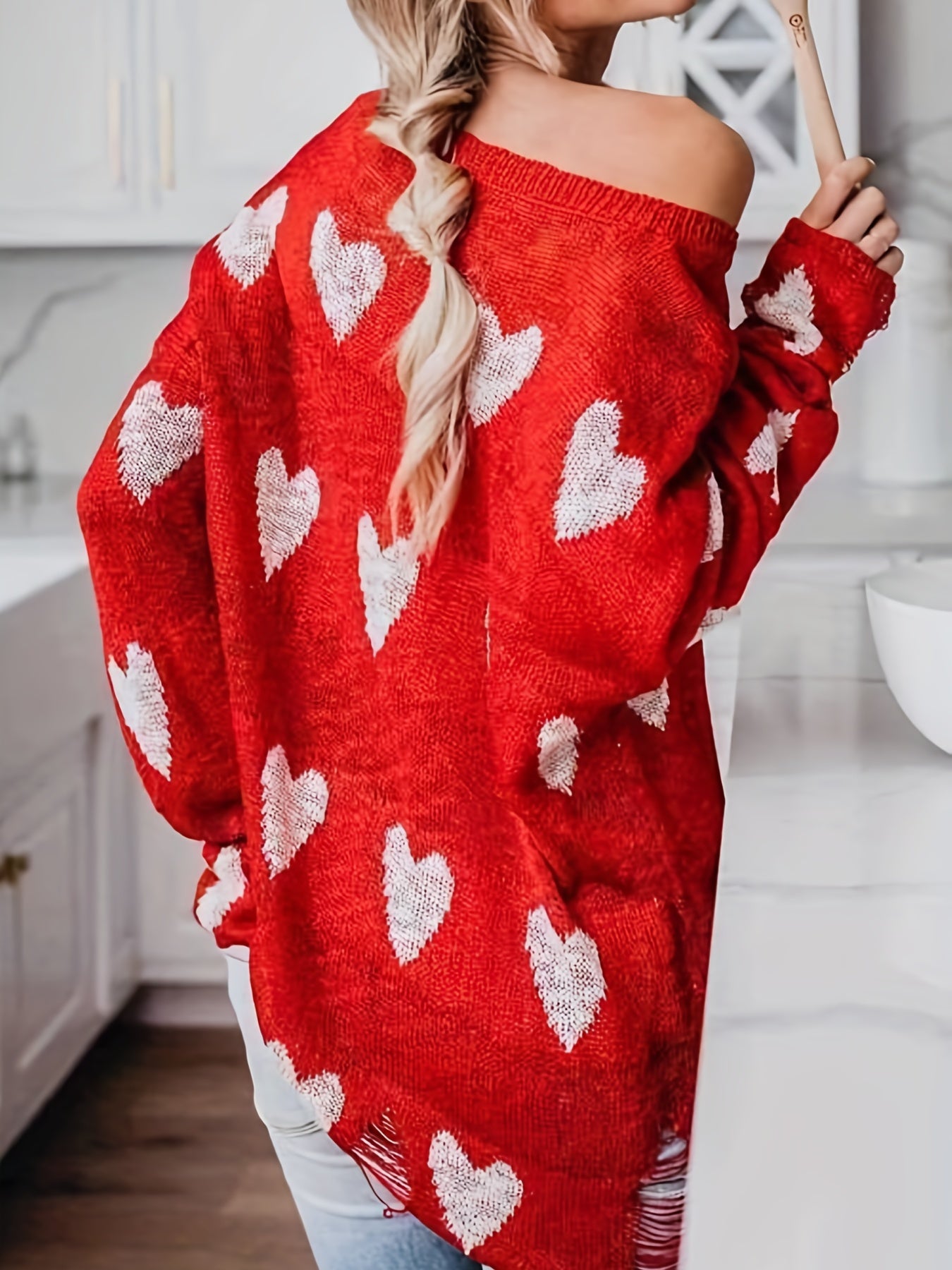Sixsr Plus Size Casual Sweater, Women's Plus Heart Print Ripped Long Sleeve One Shoulder Sweater