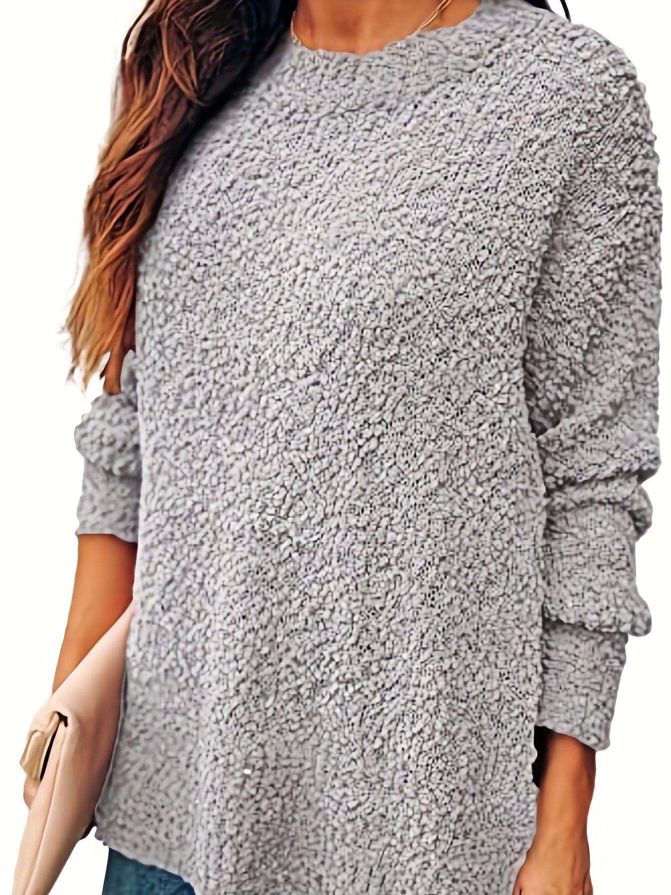 Sixsr Plus Size Casual Sweater, Women's Plus Solid Fluffy Long Sleeve Split Hem Pullover Sweater