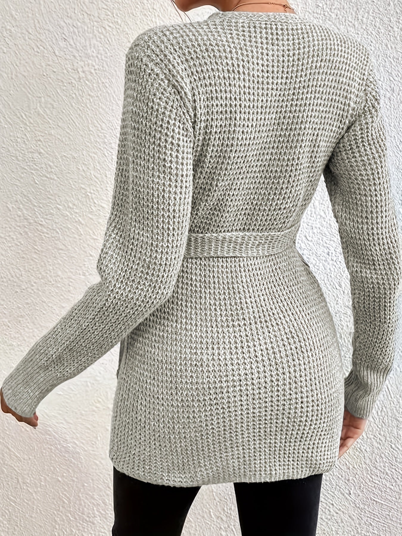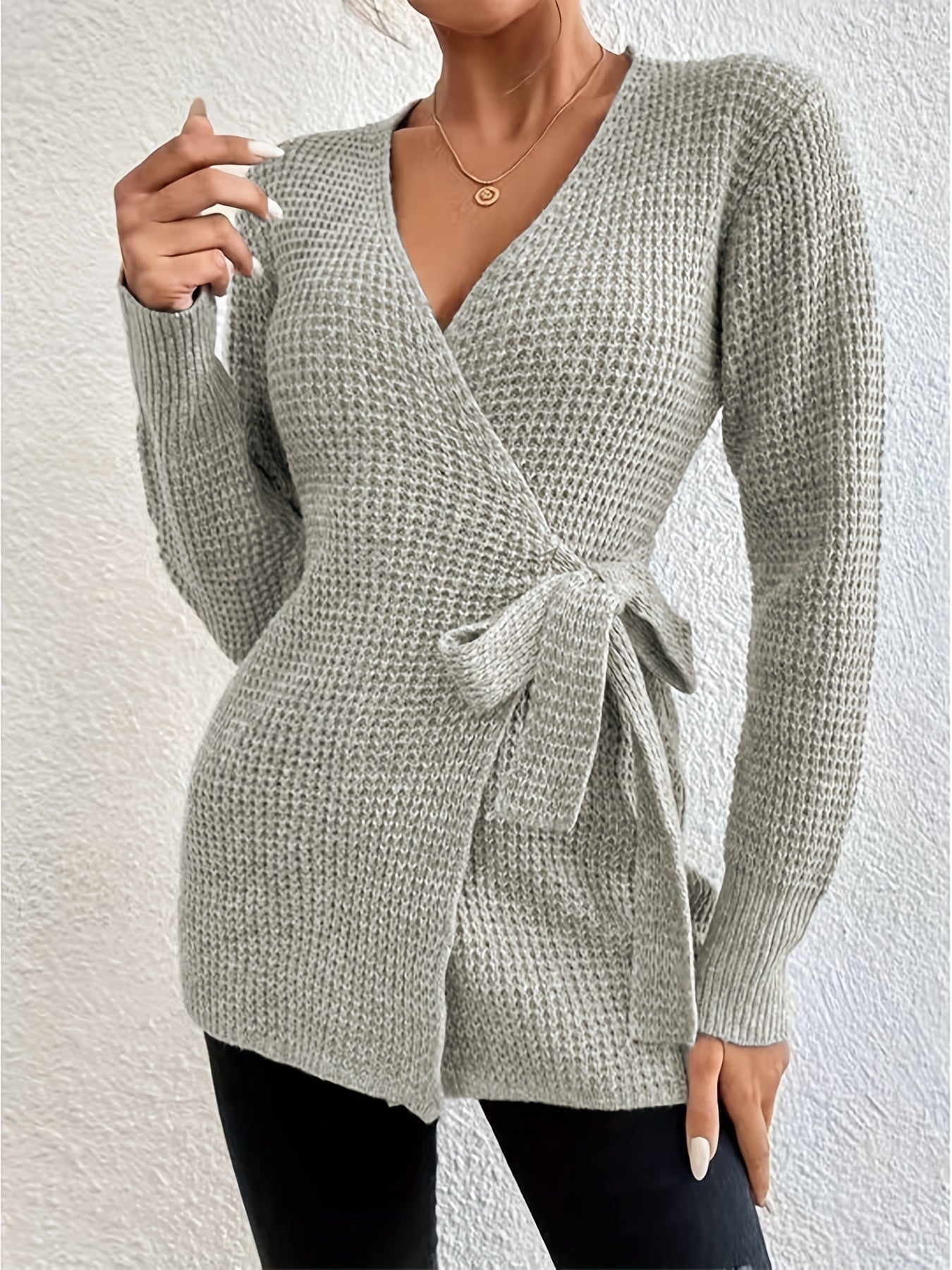 Sixsr Plus Size Casual Sweater, Women's Plus Solid Long Sleeve Surplice Neck Knot Wrap Jumper