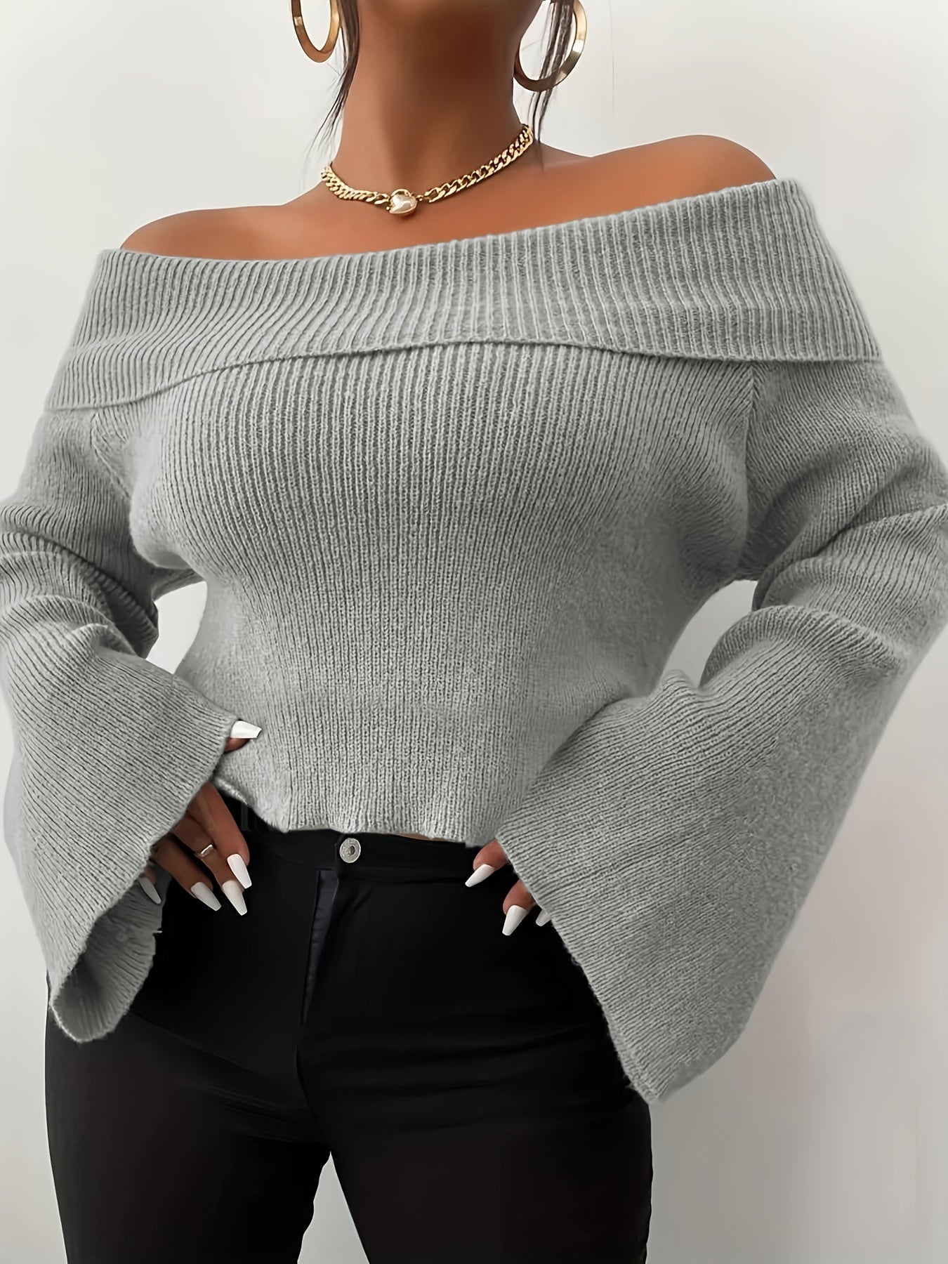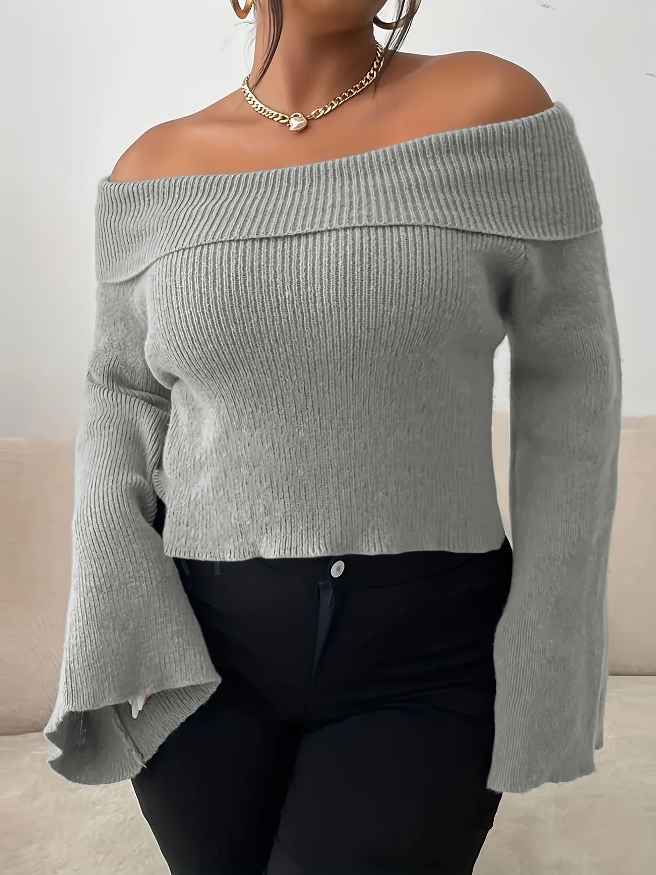 Sixsr Plus Size Casual Sweater, Women's Plus Solid Off Shoulder Bell Sleeve Slight Stretch Jumper