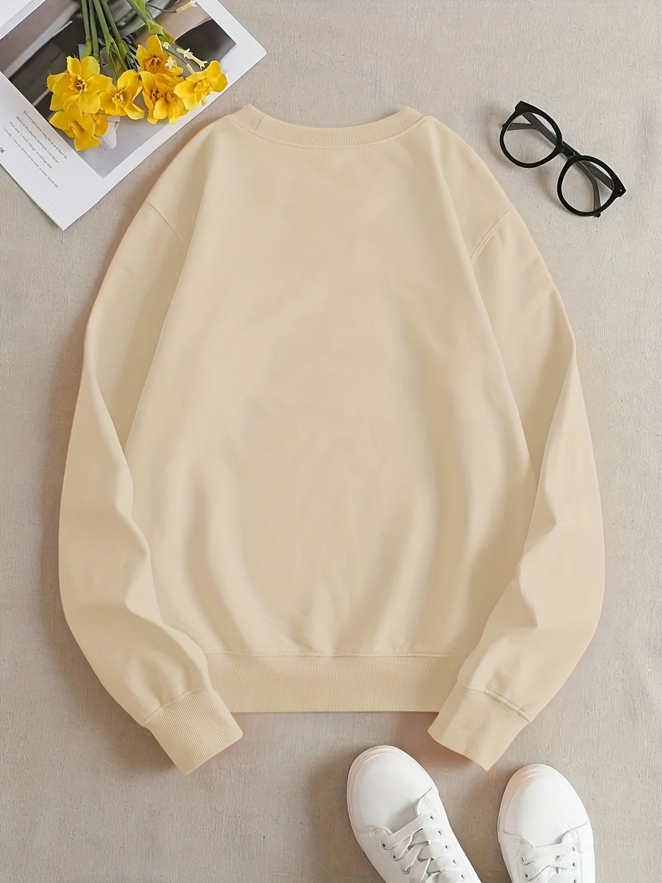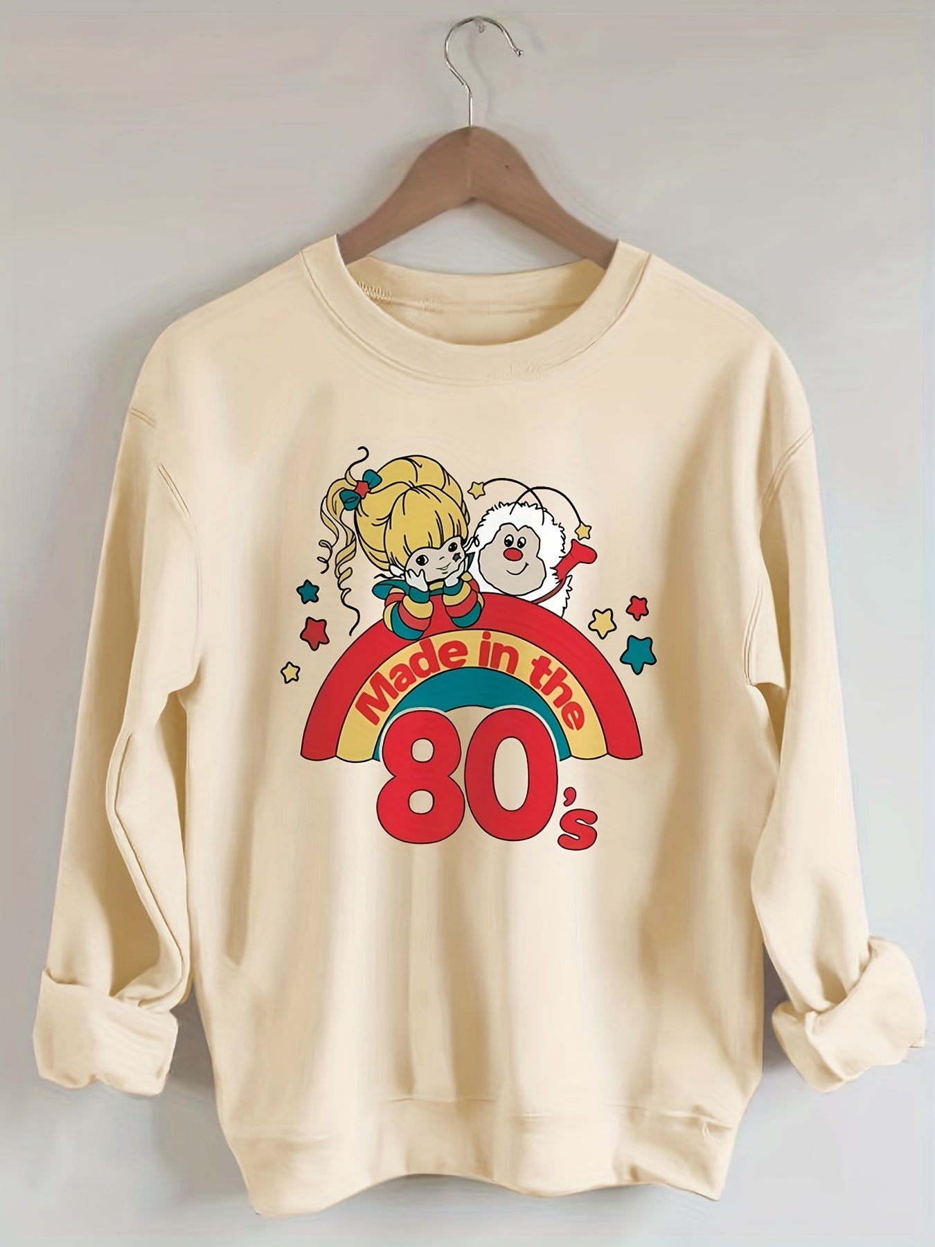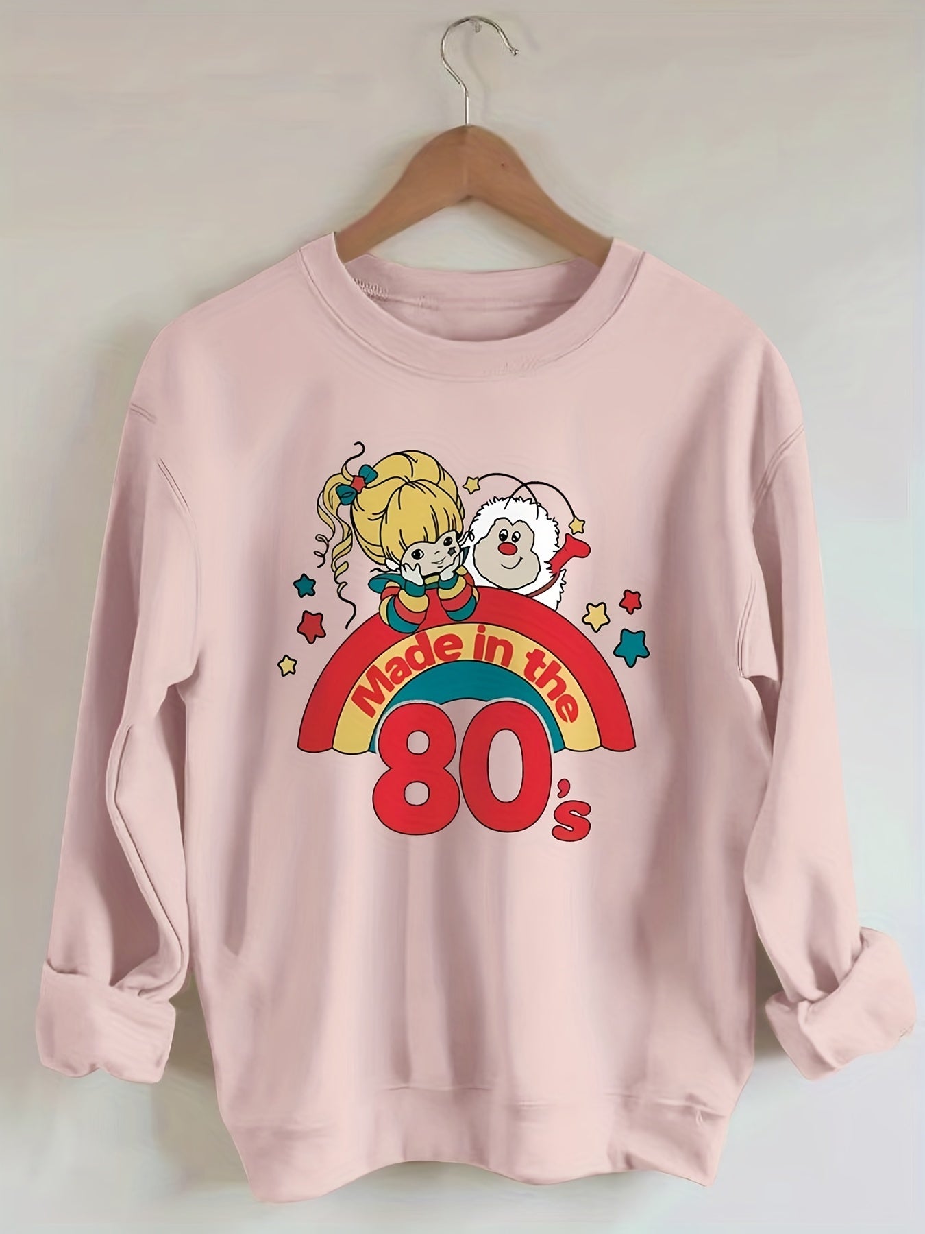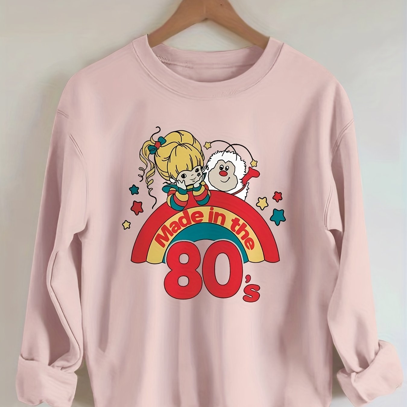 Sixsr Plus Size Casual Sweatshirt, Women's Plus Cartoon Figure & Rainbow & Letter "80s" Print Long Sleeve Round Neck Slight Stretch Sweatshirt