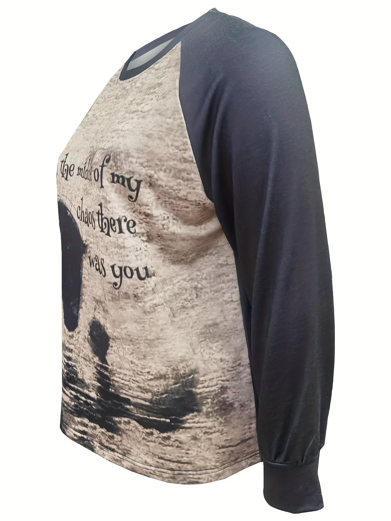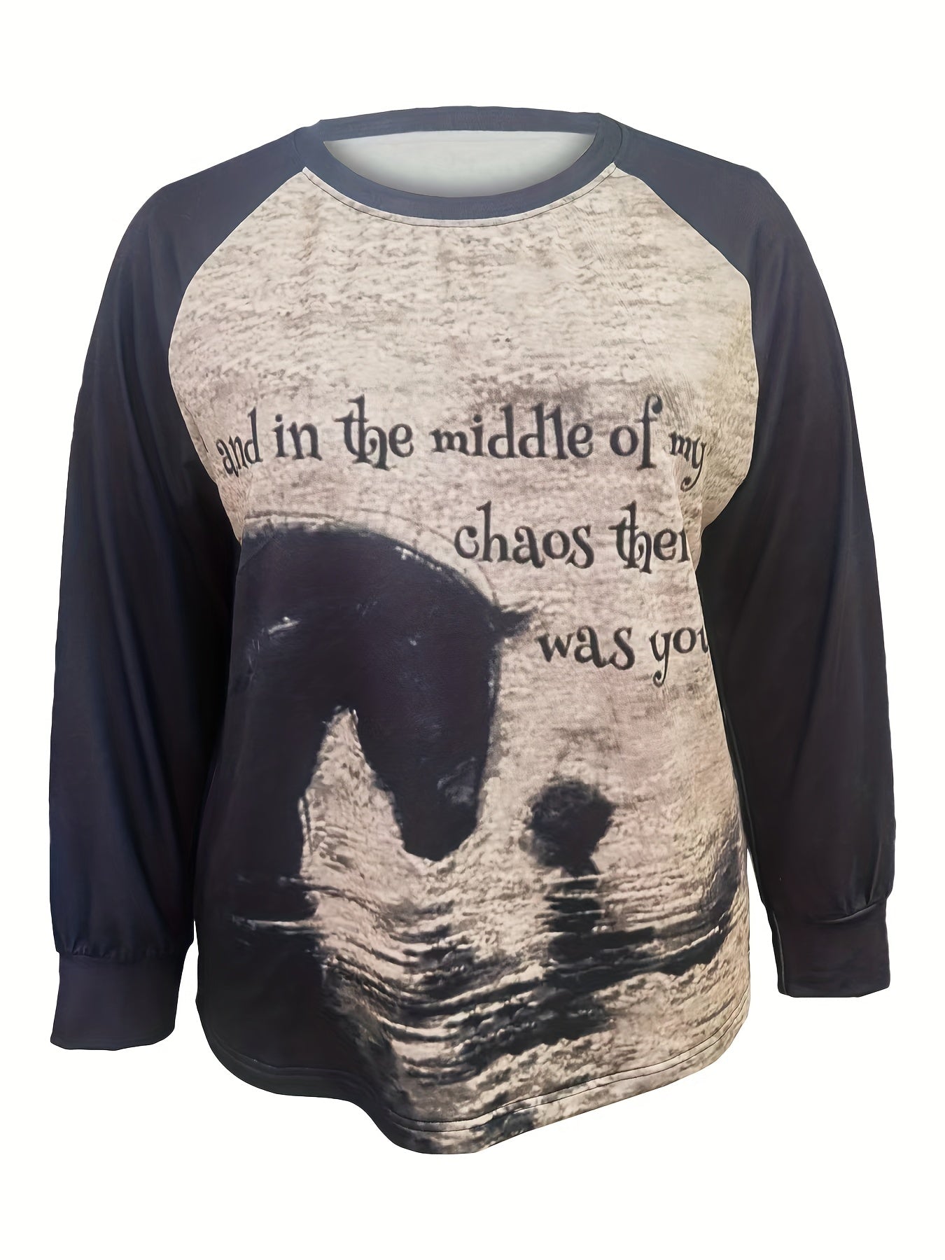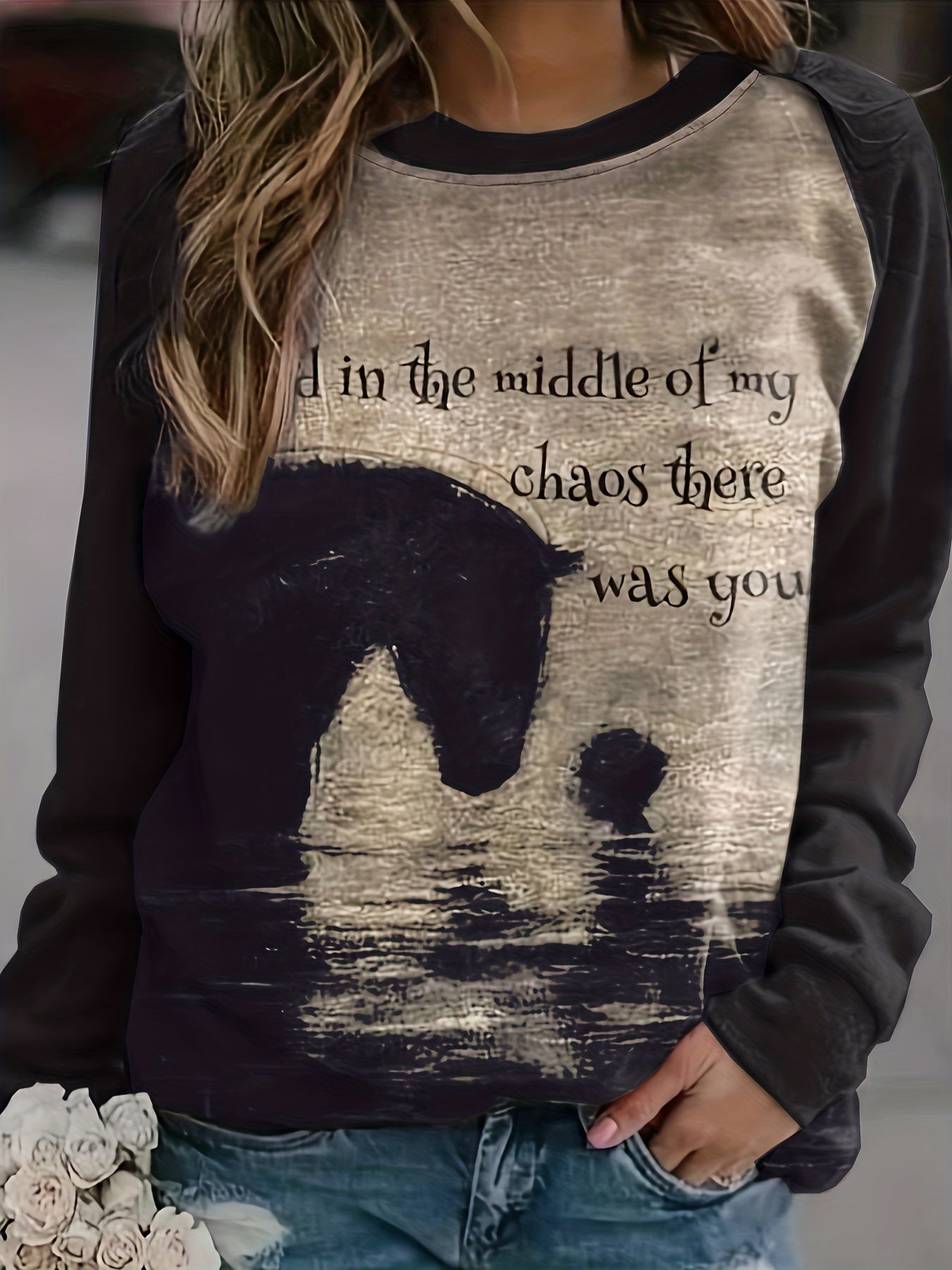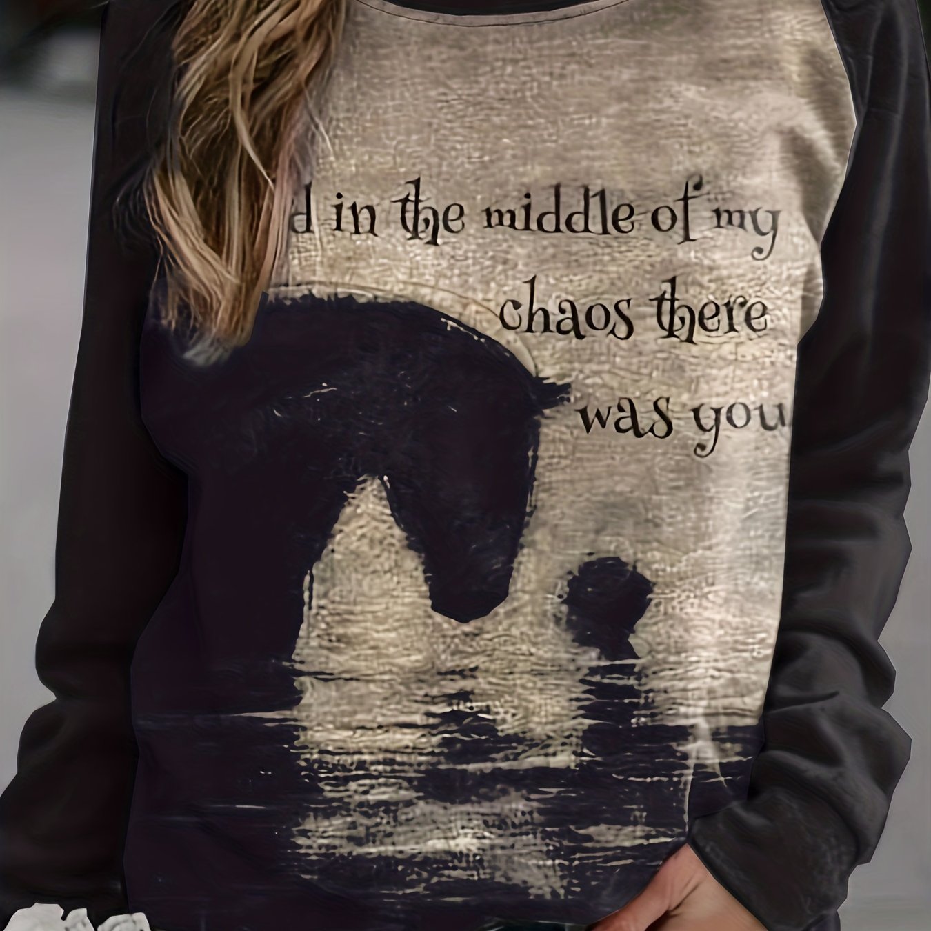 Sixsr Plus Size Casual Sweatshirt, Women's Plus Colorblock Slogan & Horse Print Long Sleeve Round Neck Sweatshirt