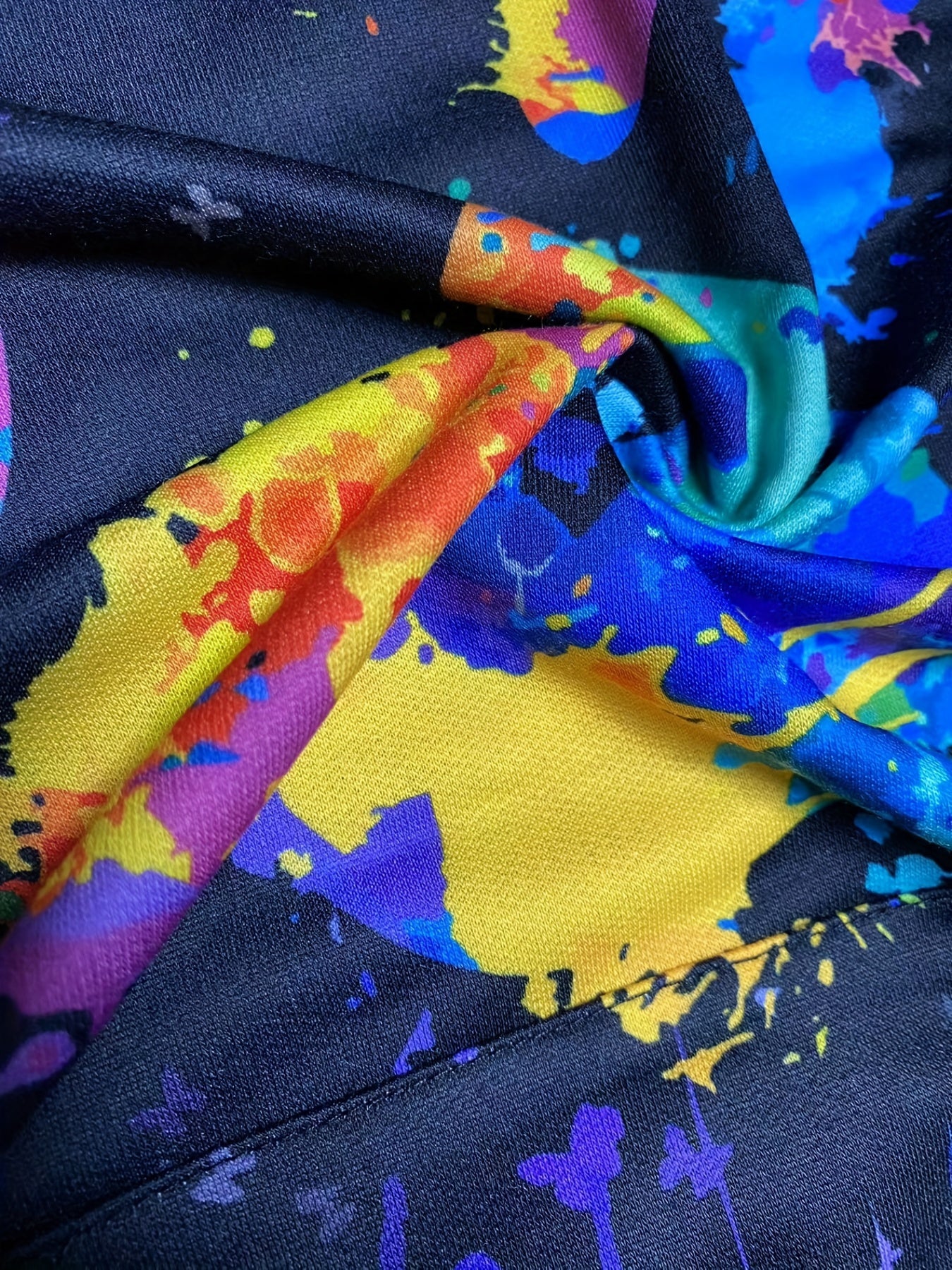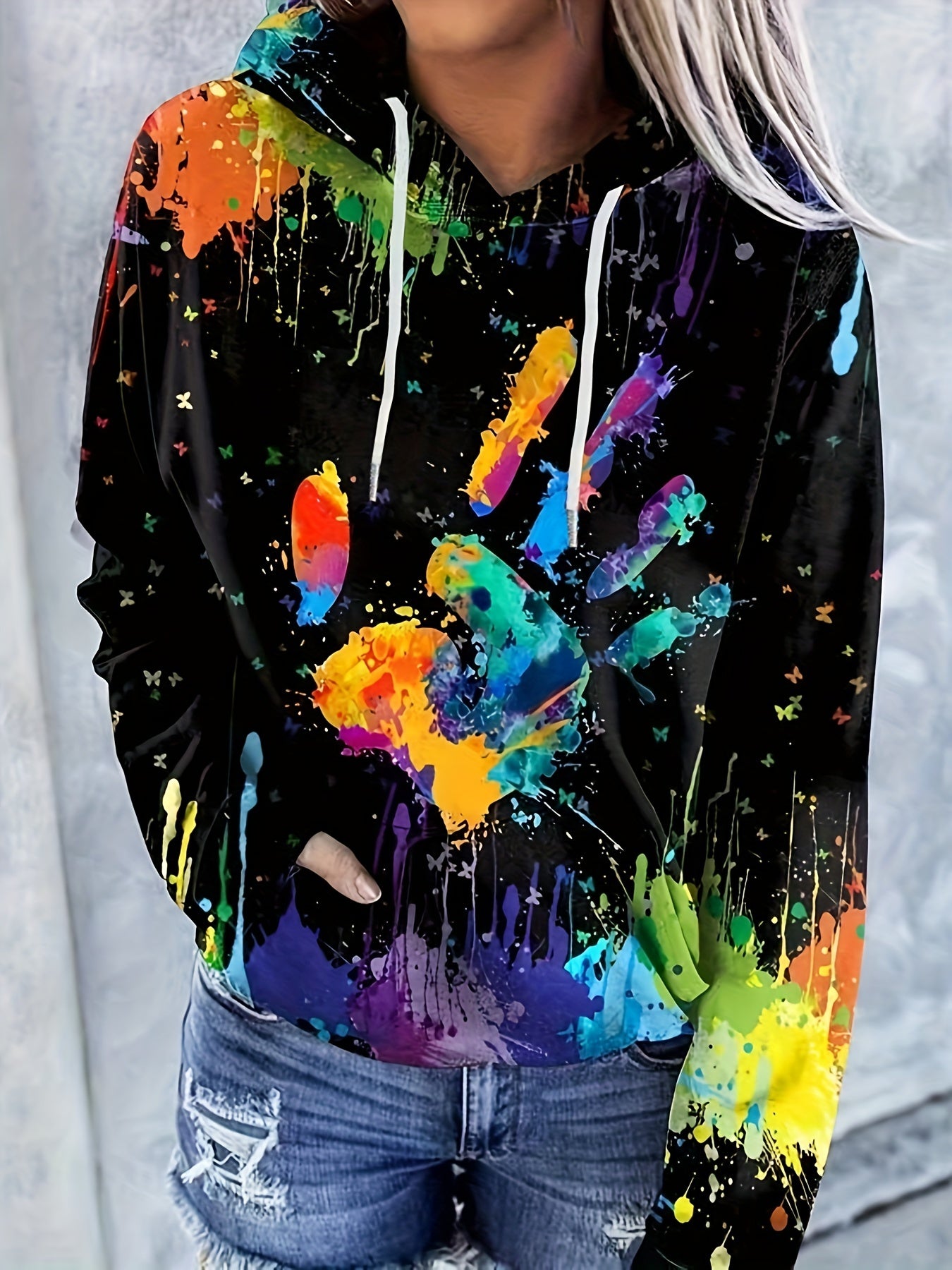 Sixsr Plus Size Casual Sweatshirt, Women's Plus Hand & Splash Painting Print Long Sleeve Drawstring Hooded Pullover Sweatshirt With Kangaroo Pockets, Casual Tops For Fall & Winter, Plus Size Women's Clothing
