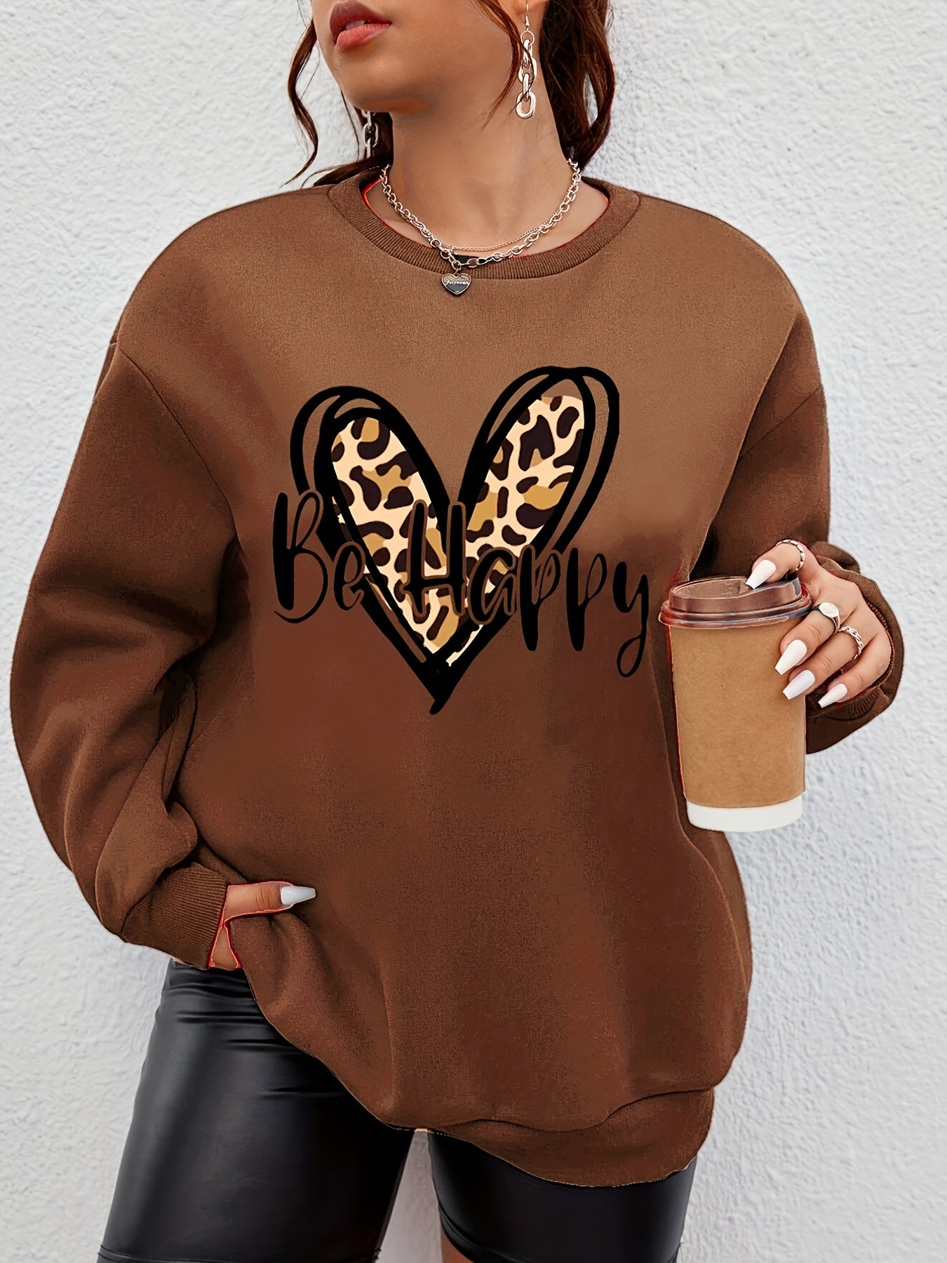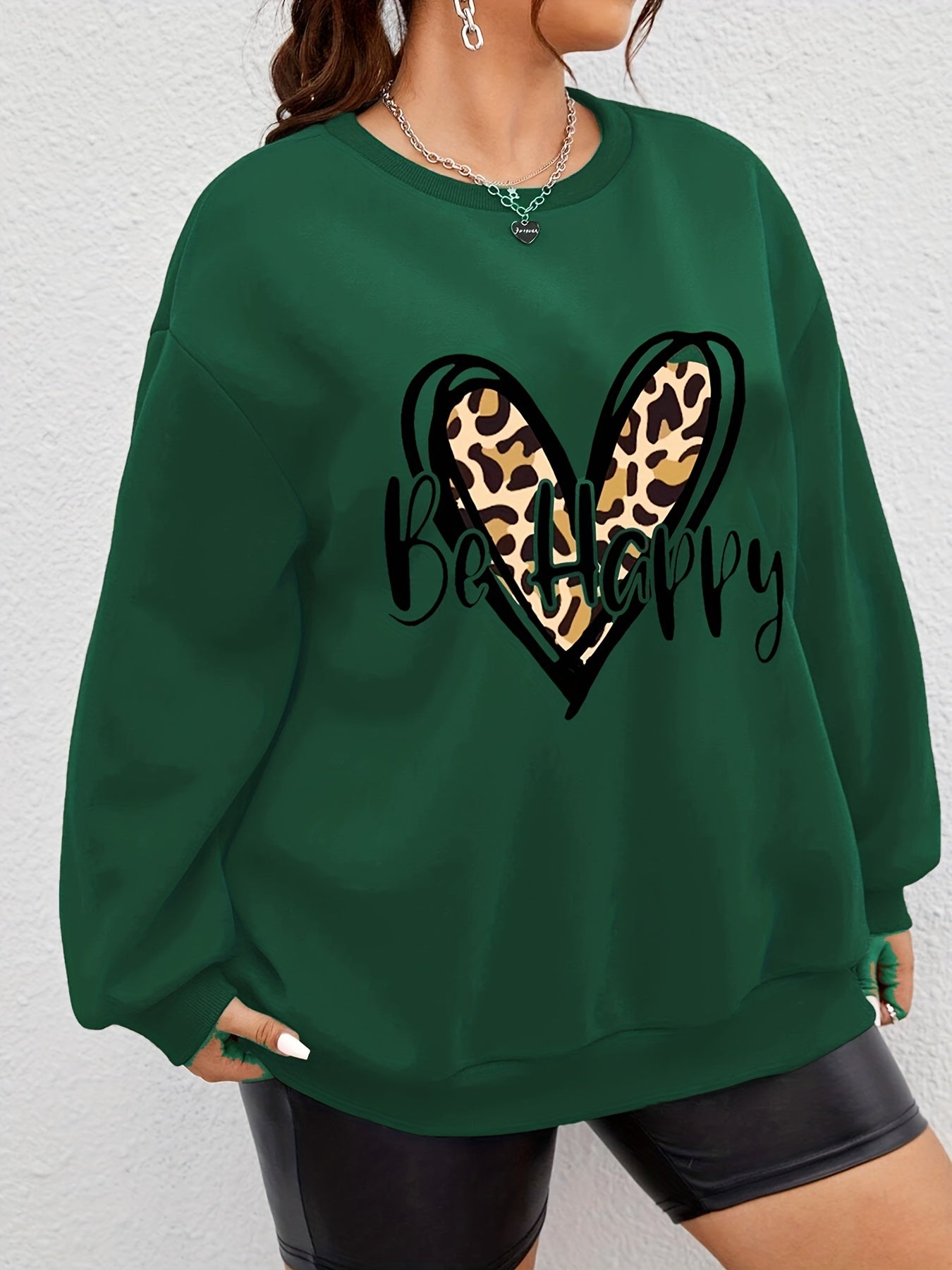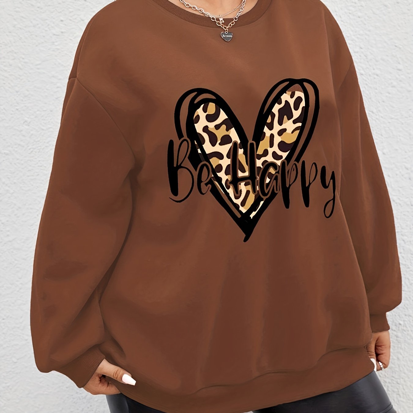 Sixsr Plus Size Casual Sweatshirt, Women's Plus Leopard Heart & Slogan Print Long Sleeve Round Neck Sweatshirt