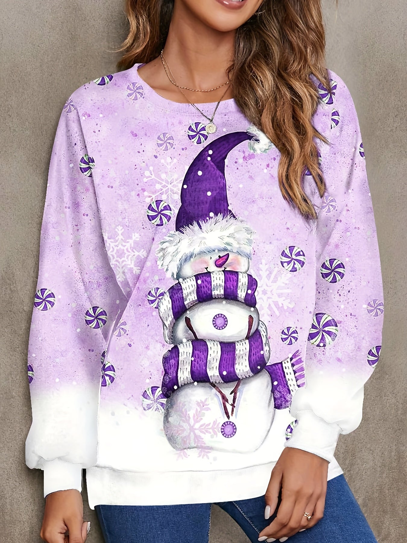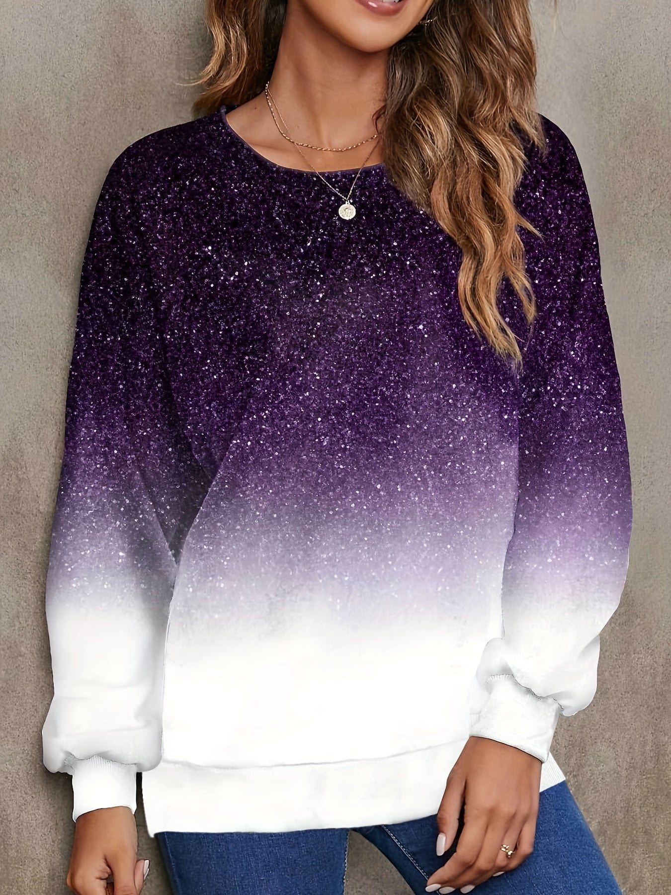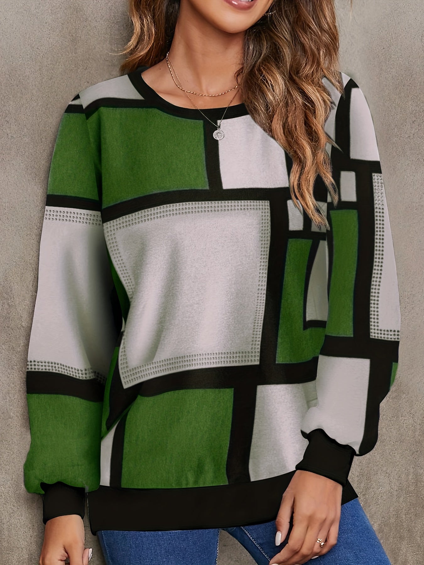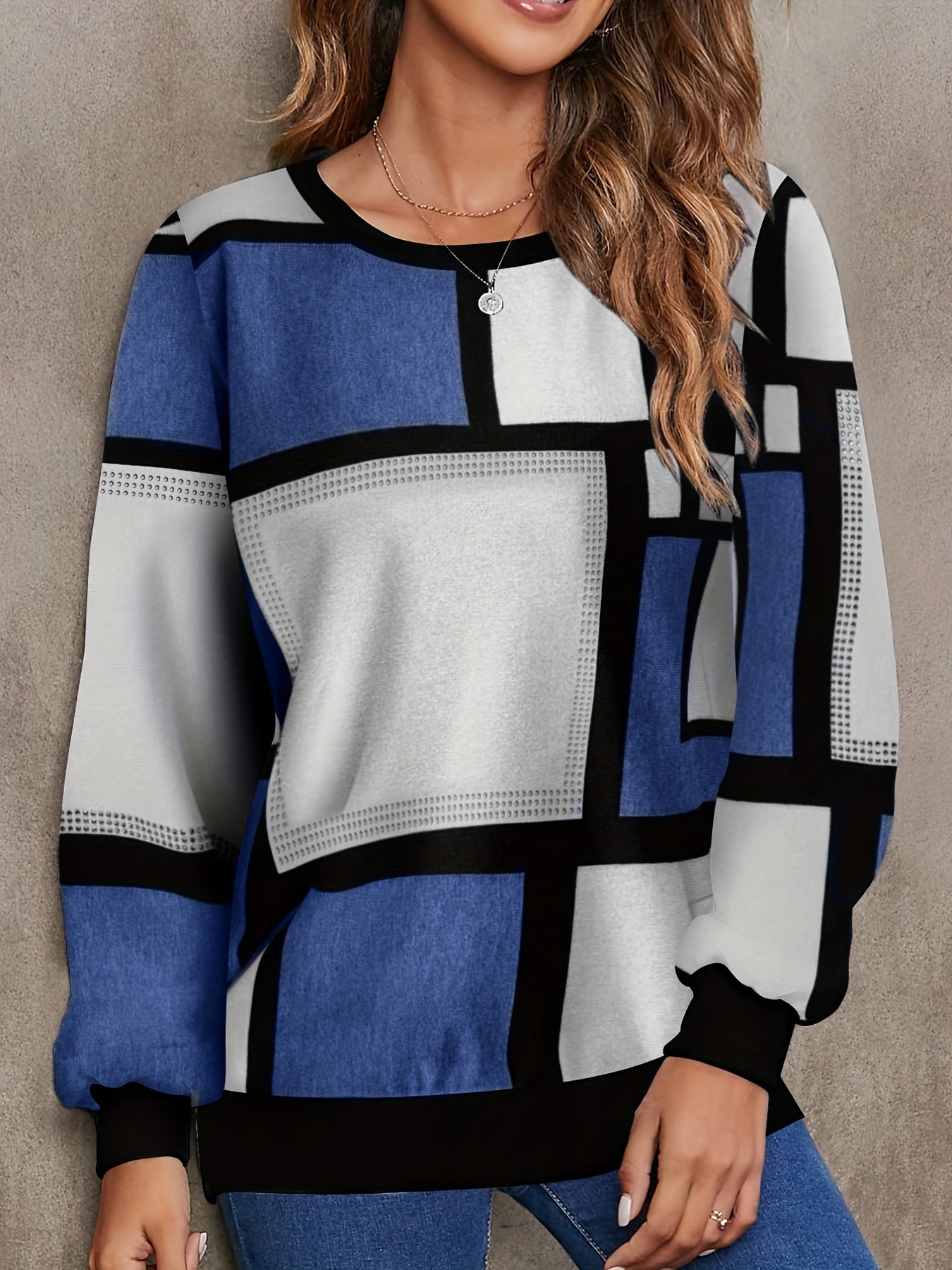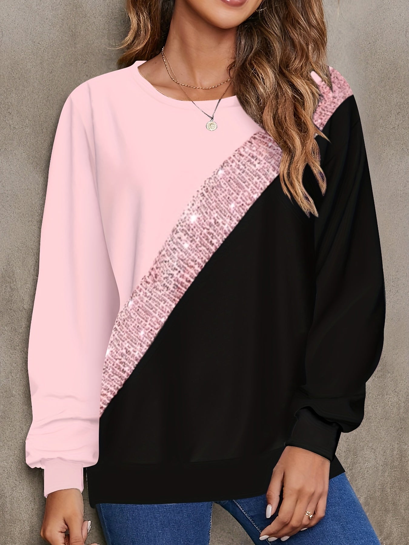 Sixsr Plus Size Casual Sweatshirt, Women's Plus Rhinestone Colorblock Long Sleeve Round Neck Slight Stretch Sweatshirt
