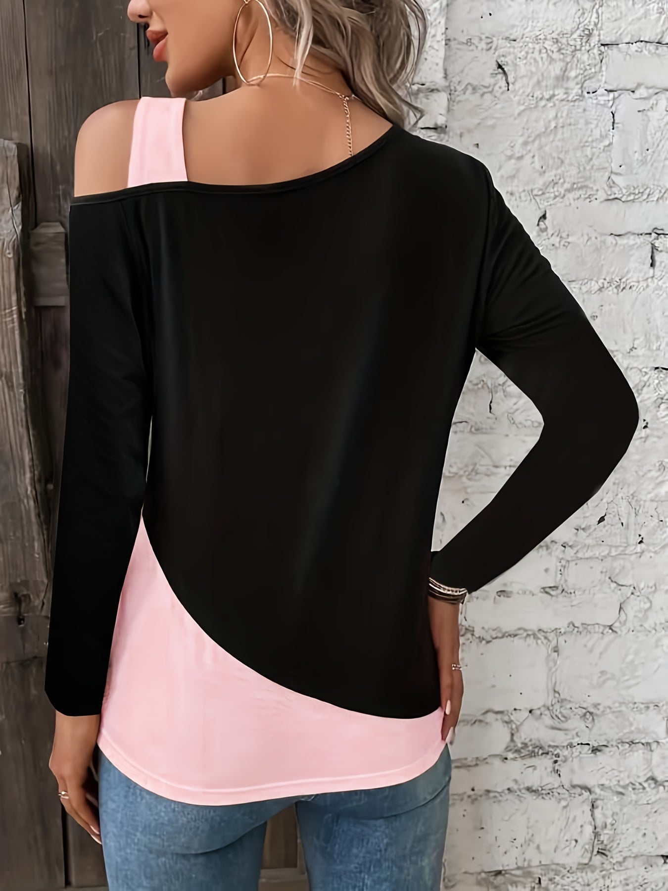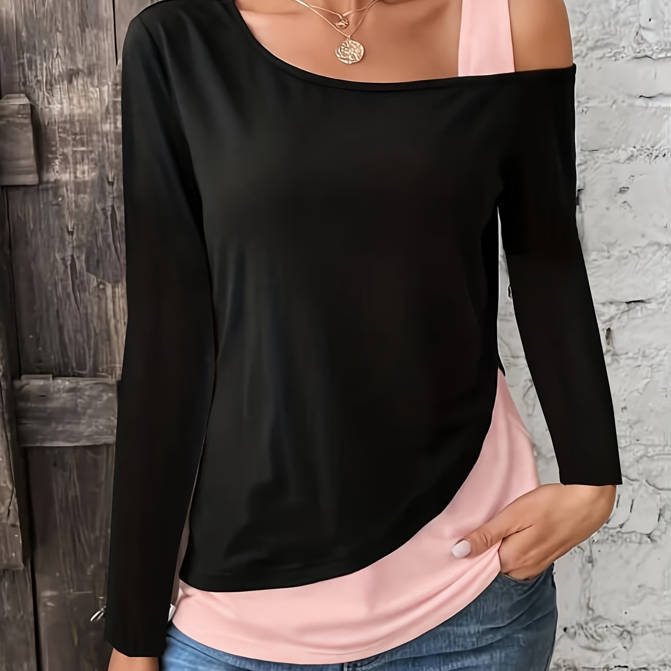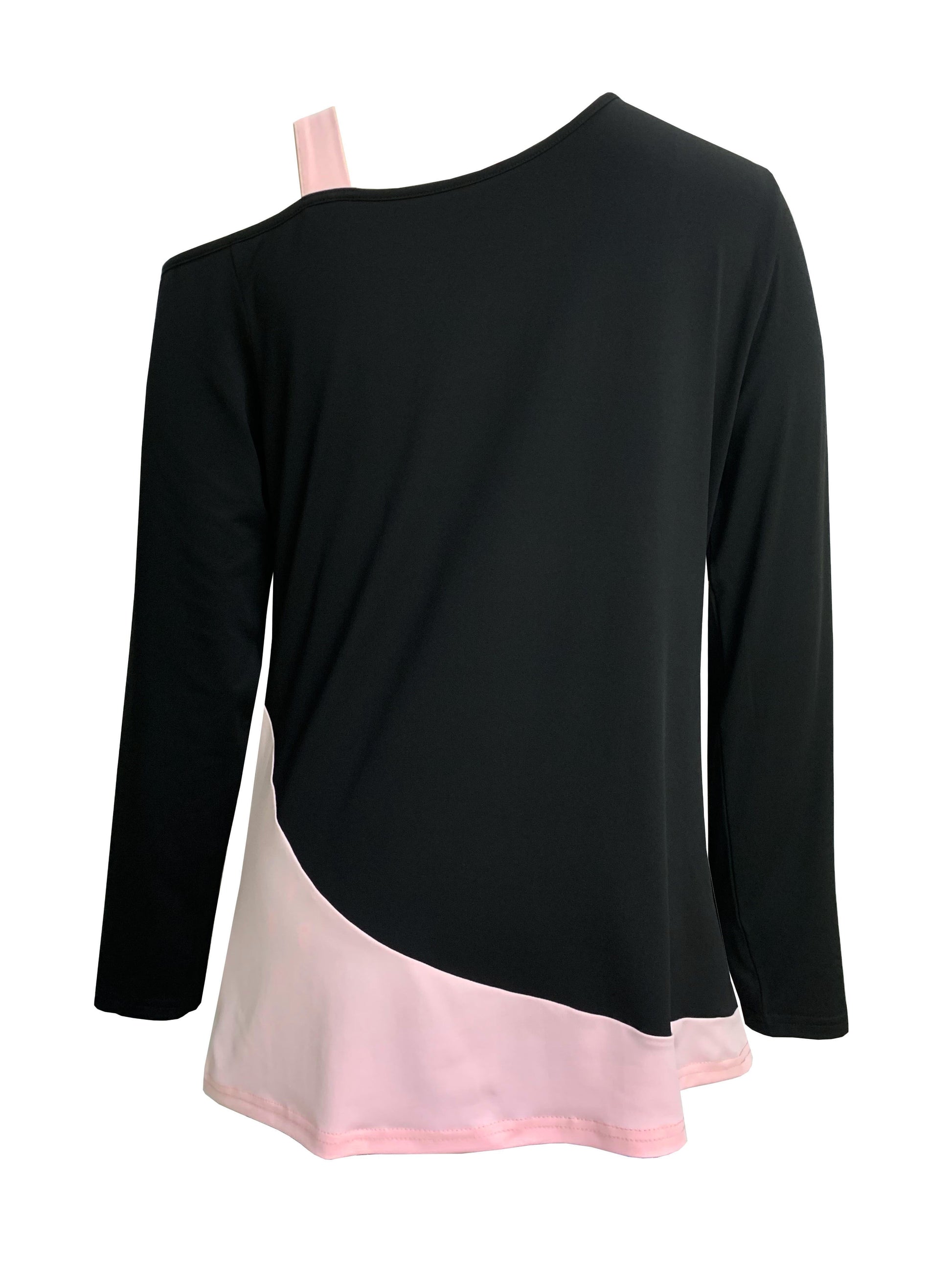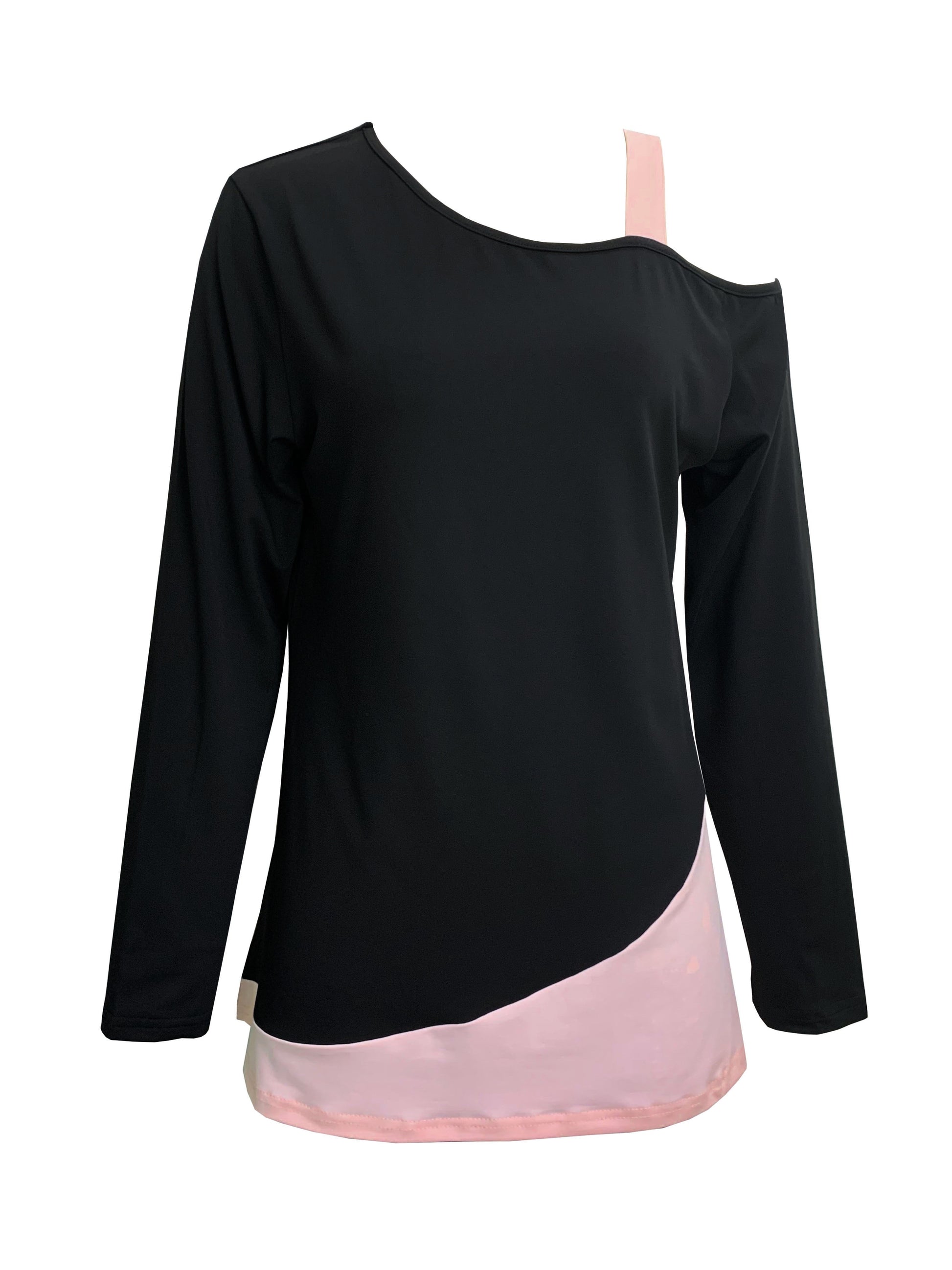 Sixsr Plus Size Casual Top, Women's Plus Colorblock Long Sleeve One Shoulder Medium Stretch Top