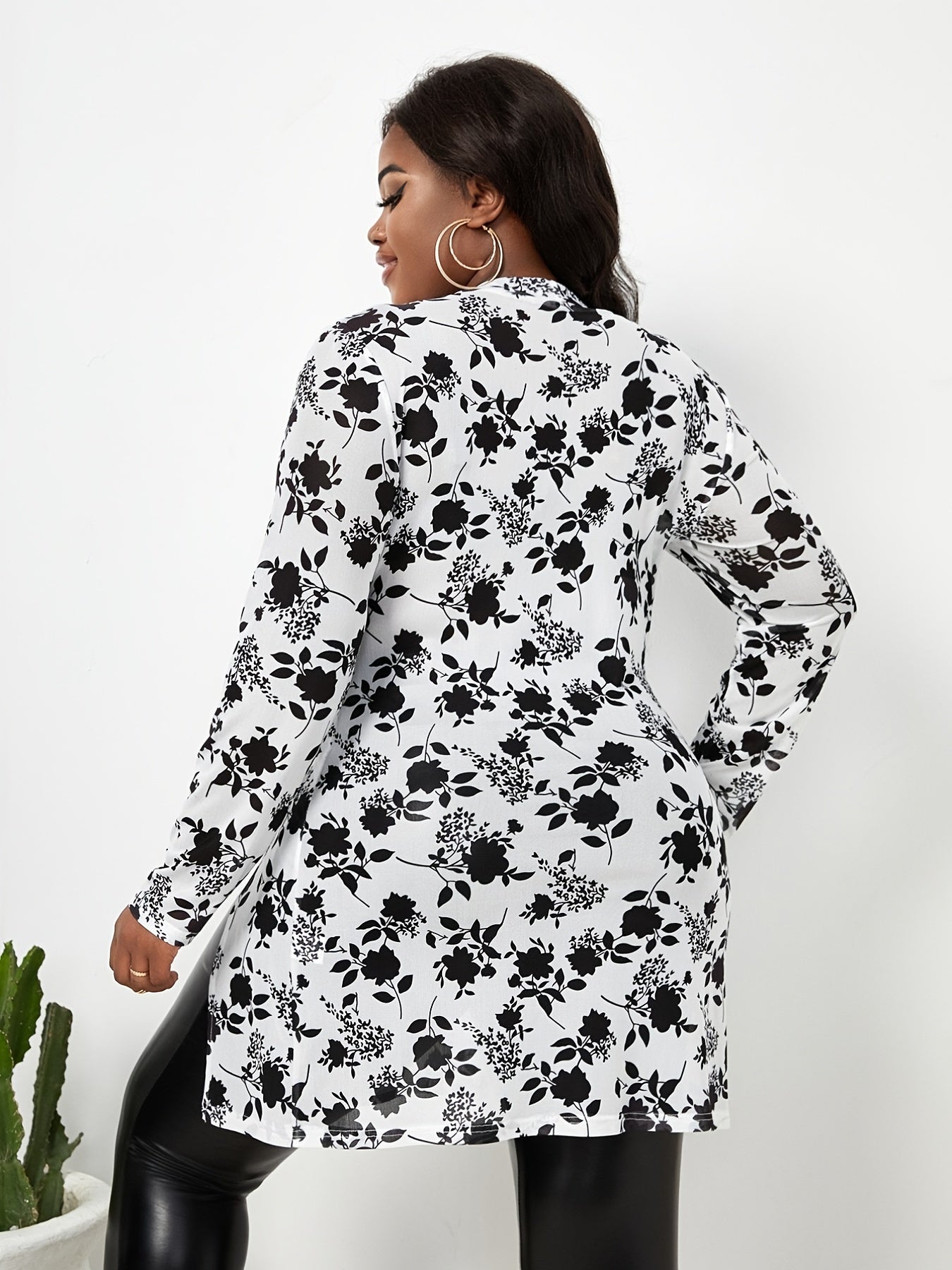 Sixsr Plus Size Casual Top, Women's Plus Floral Print Mock Neck Long Sleeve Split Hem Tunic Top